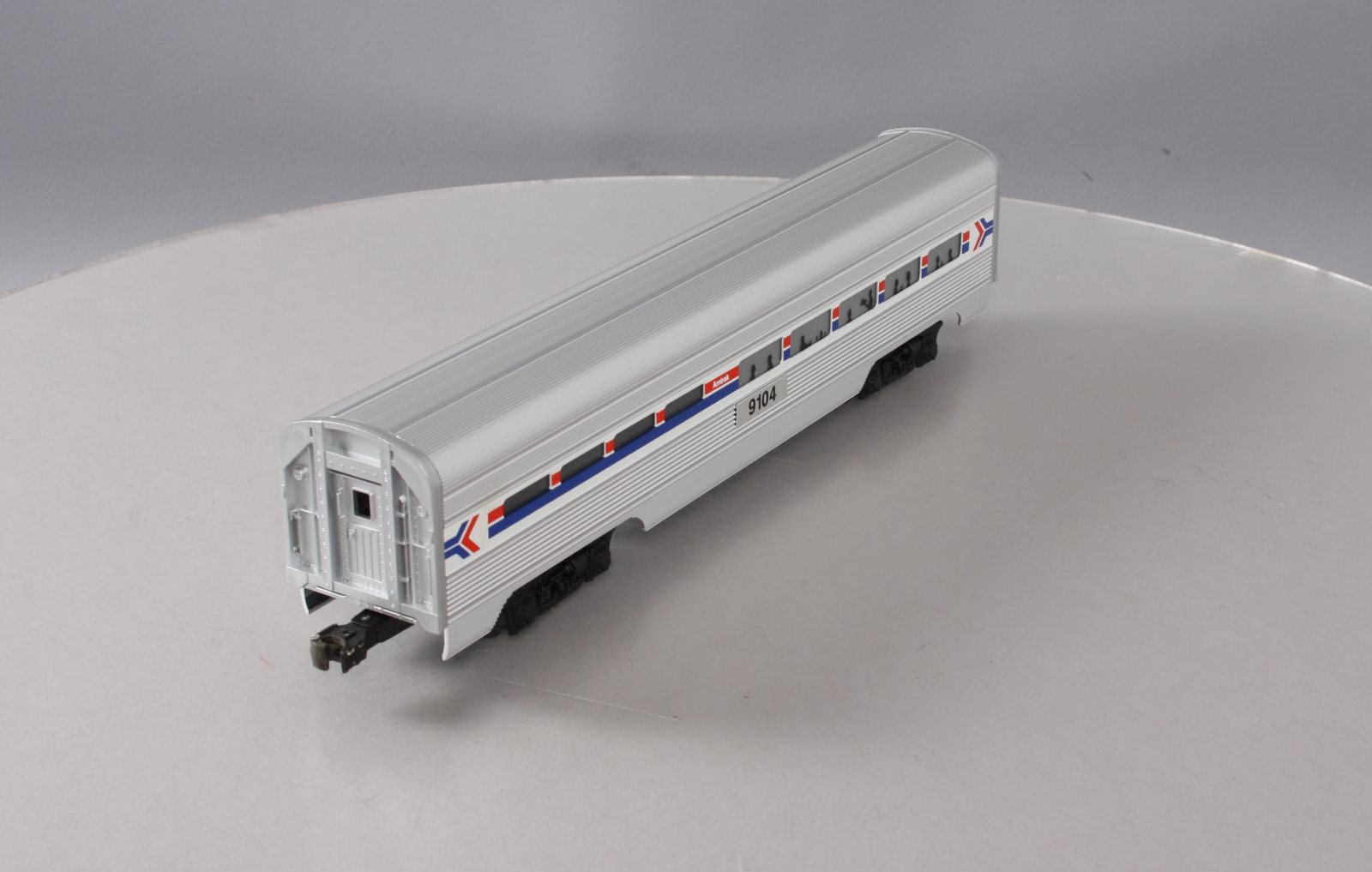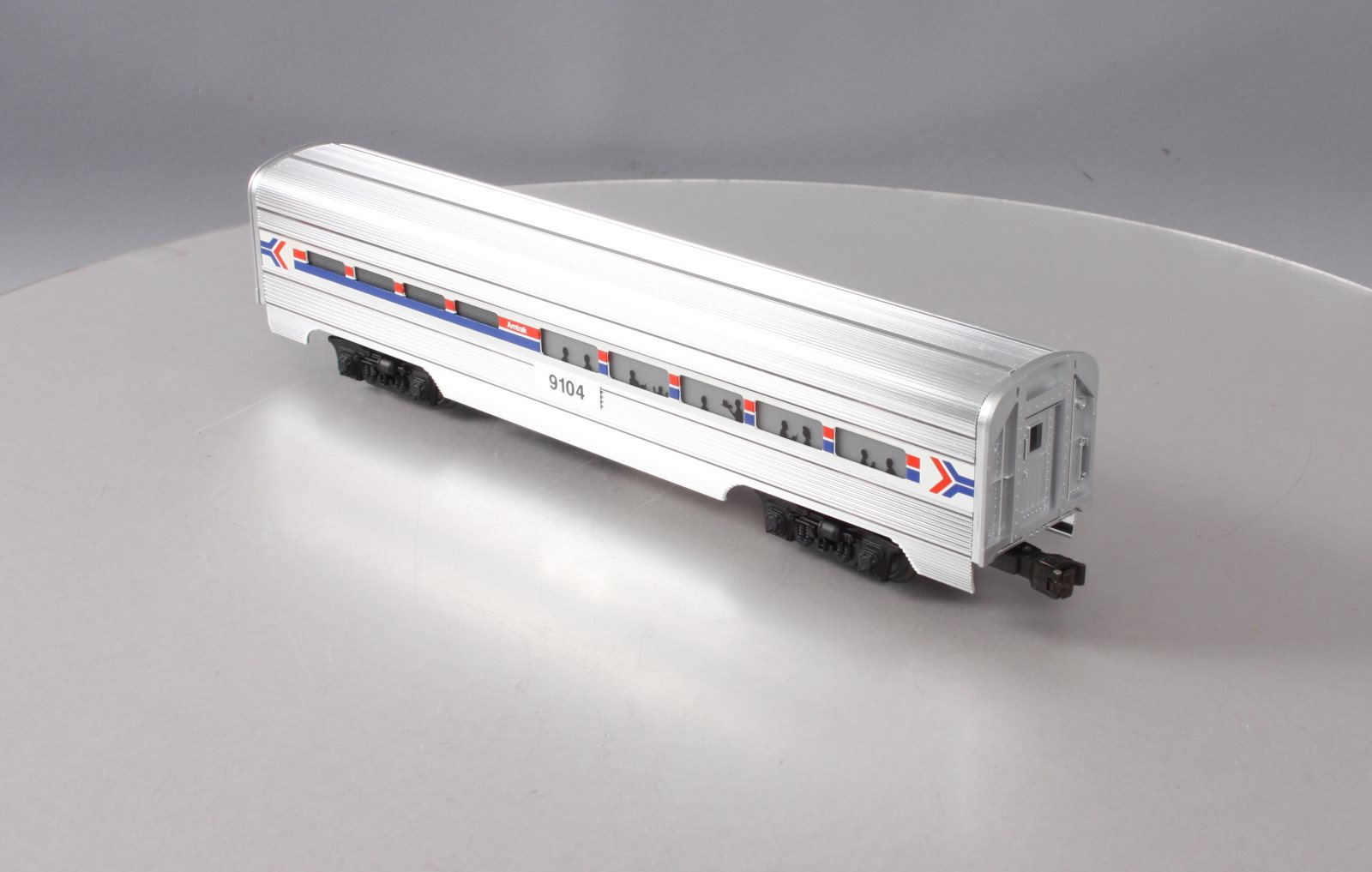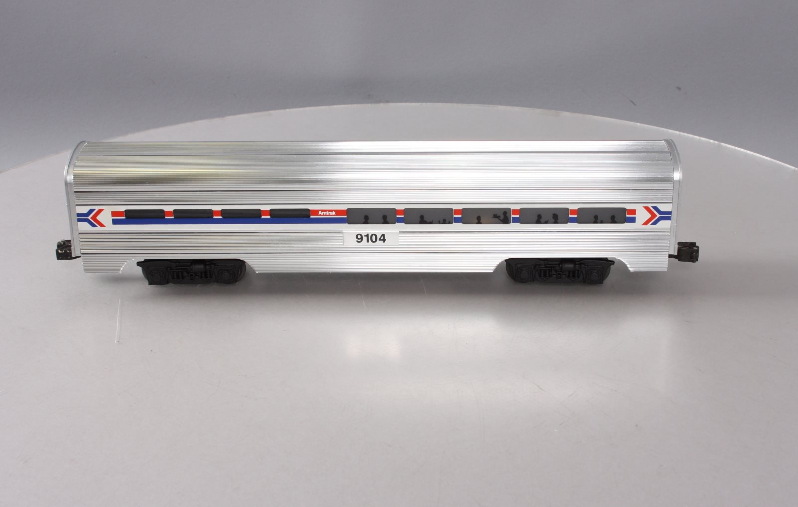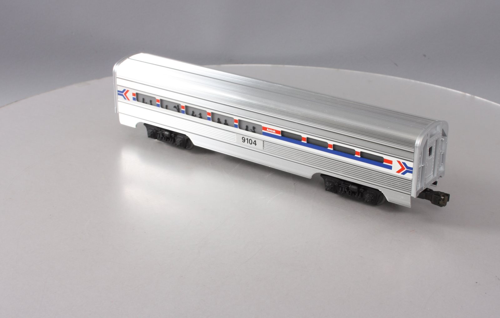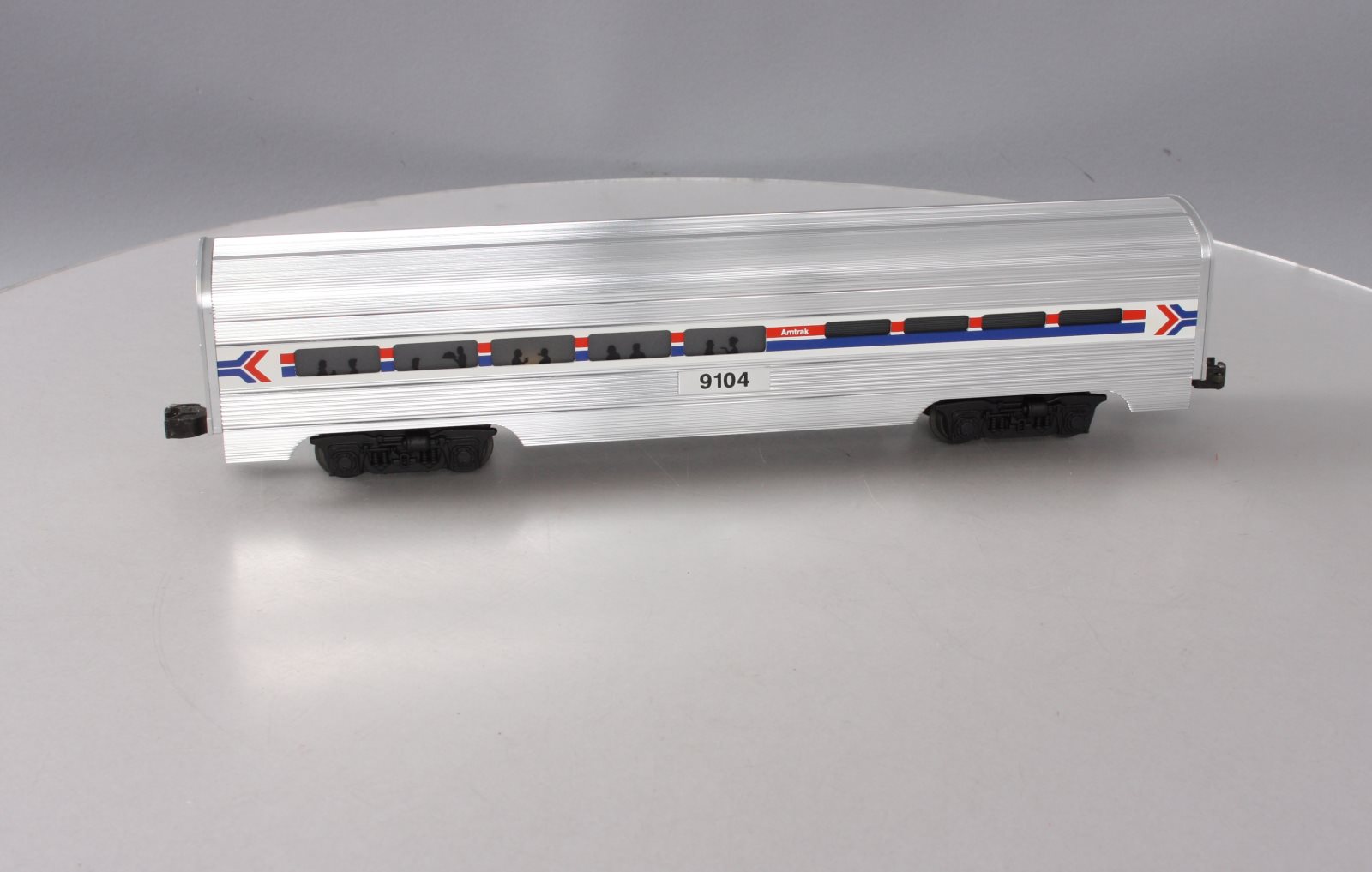 Here is a Lionel 6-19104 O Gauge Amtrak Aluminum Dining Passenger Car #9104. This car was manufactured in 1989. It is part of the Amtrak Passenger Set from that year. The cars features include an aluminum construction with corrugated sides, die-cast trucks with operating couplers and an illuminated interior with passenger silhouetted windows. This car measures 15 inches long.