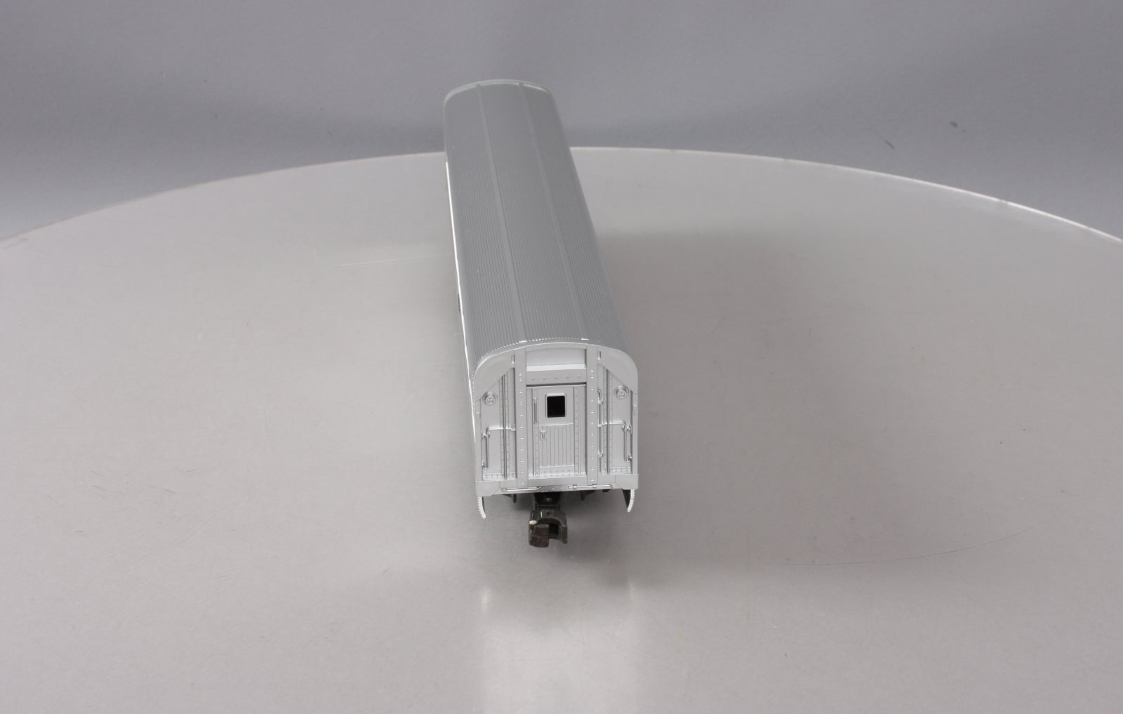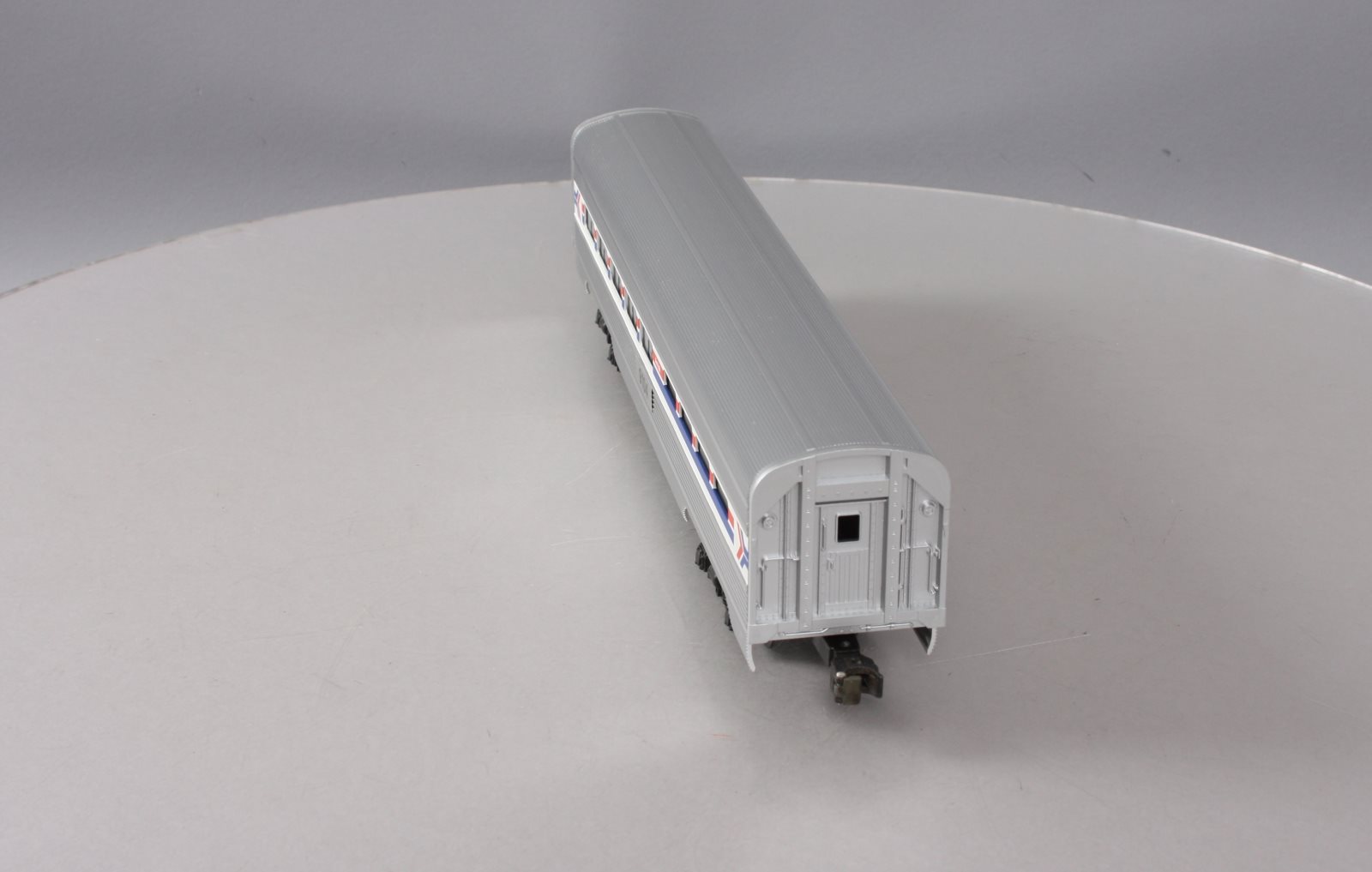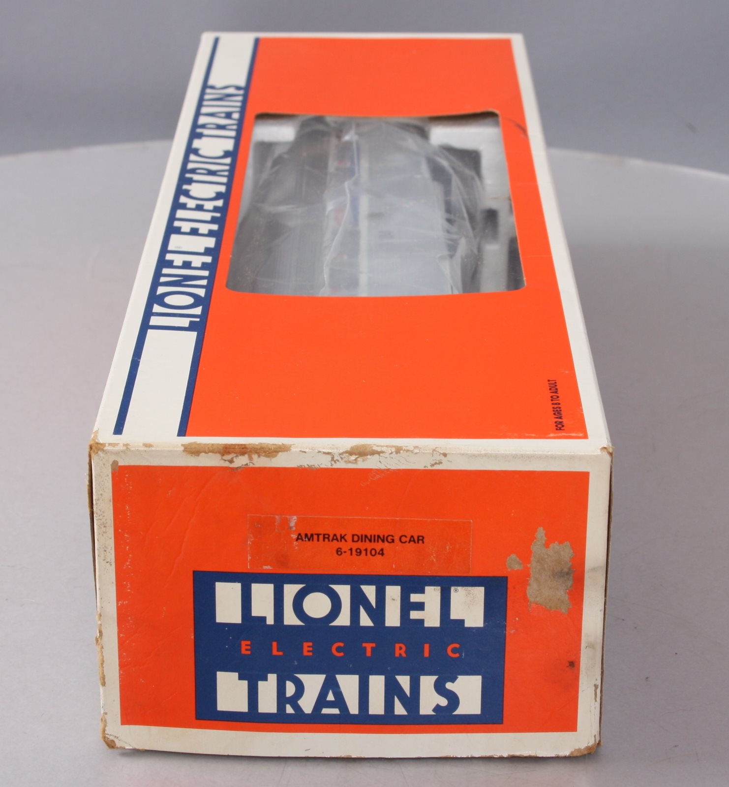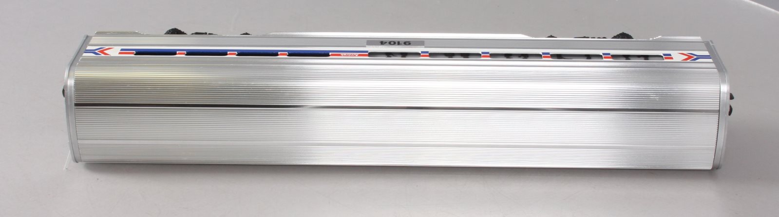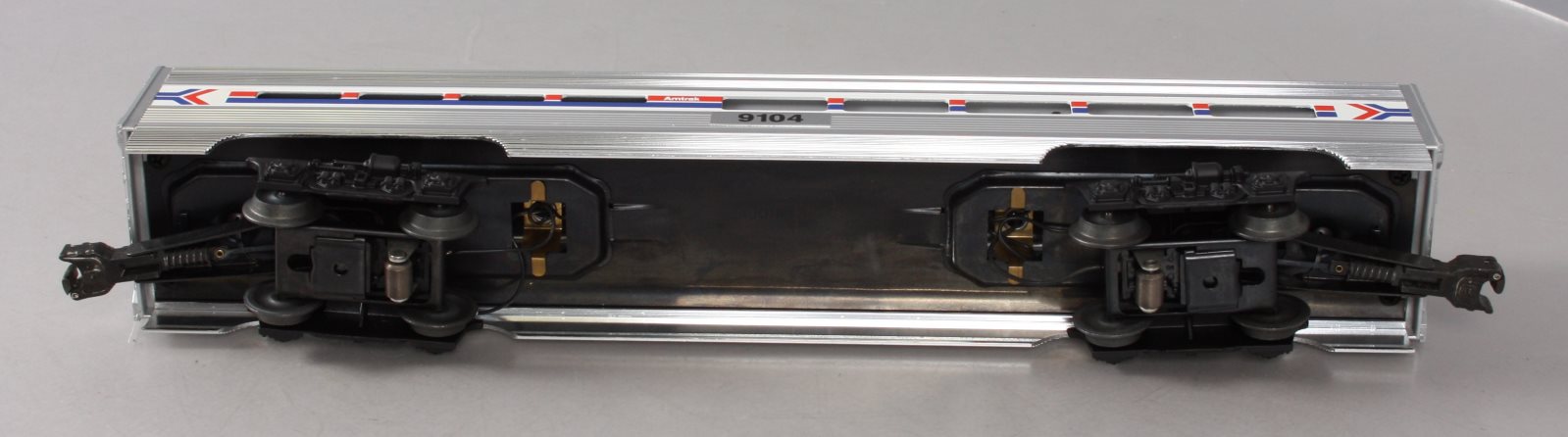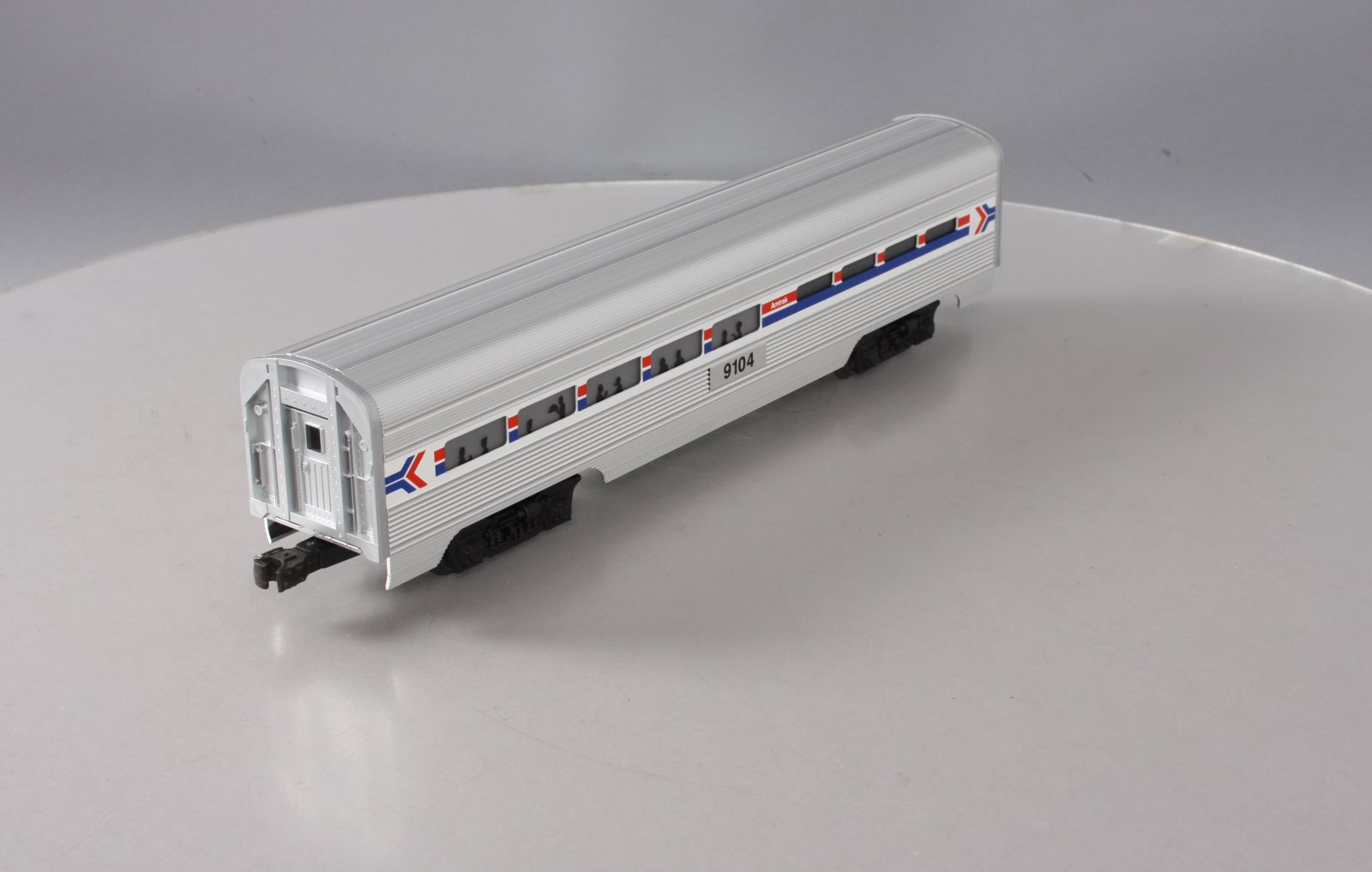 Here is a Lionel 6-19104 O Gauge Amtrak Aluminum Dining Passenger Car #9104. This car was manufactured in 1989. It is part of the Amtrak Passenger Set from that year. The cars features include an aluminum construction with corrugated sides, die-cast trucks with operating couplers and an illuminated interior with passenger silhouetted windows. This car measures 15 inches long.