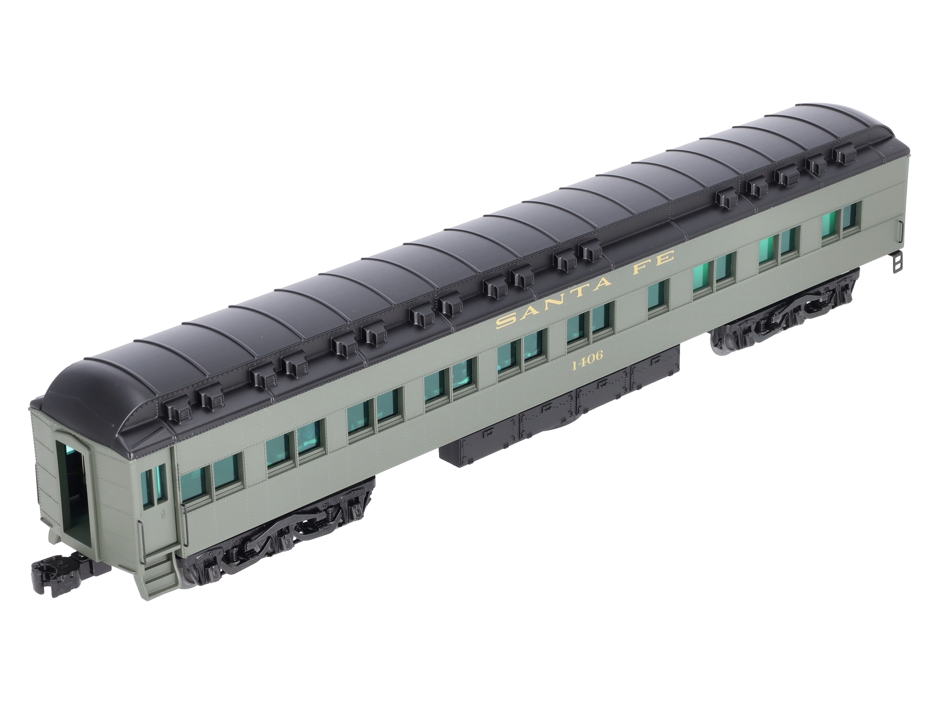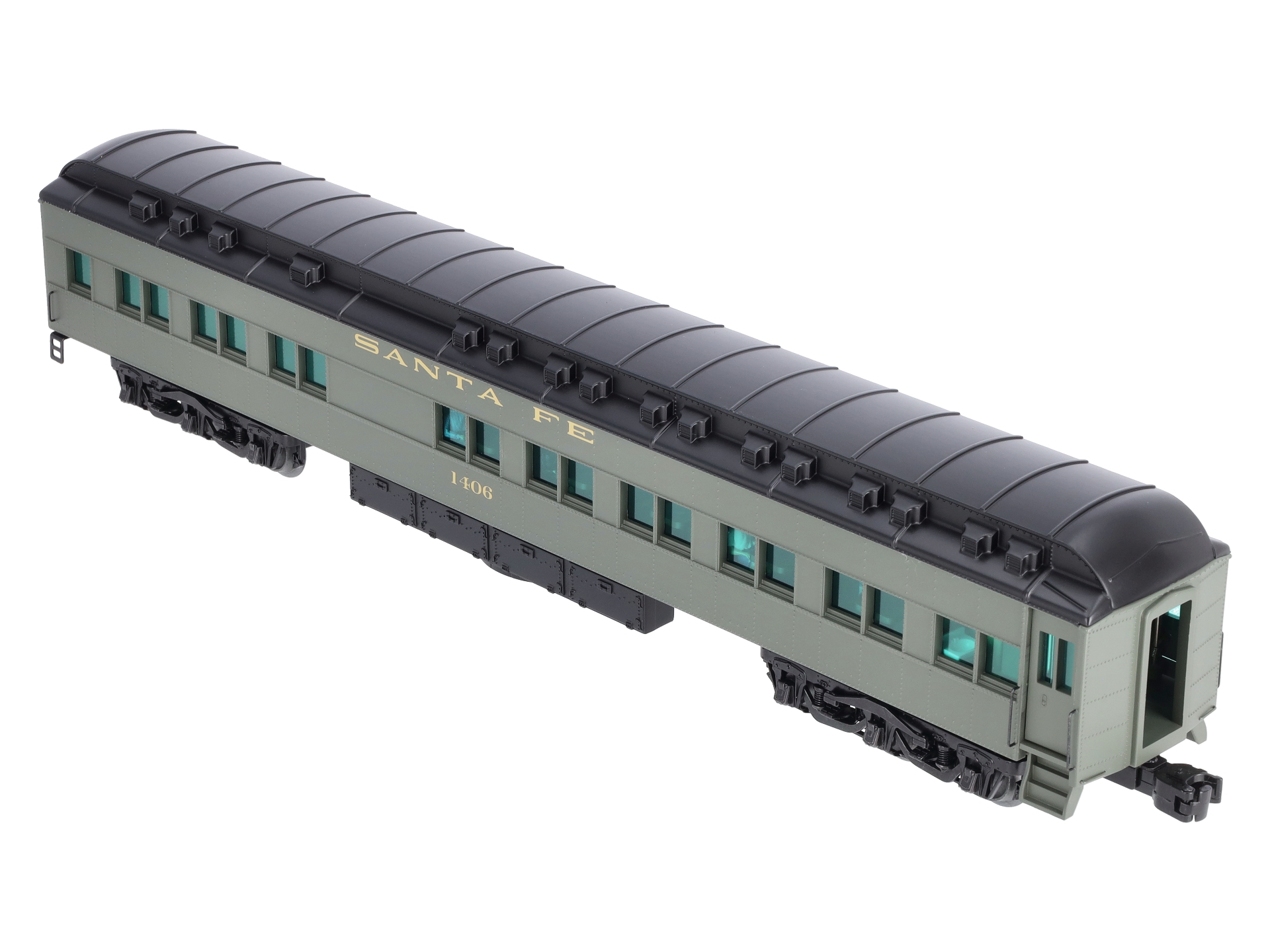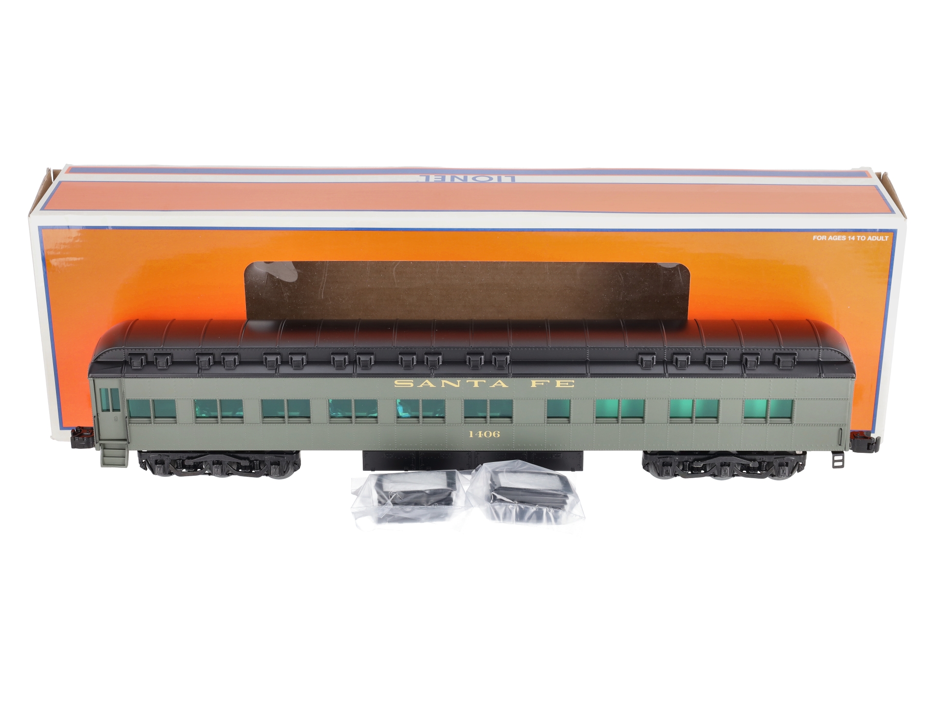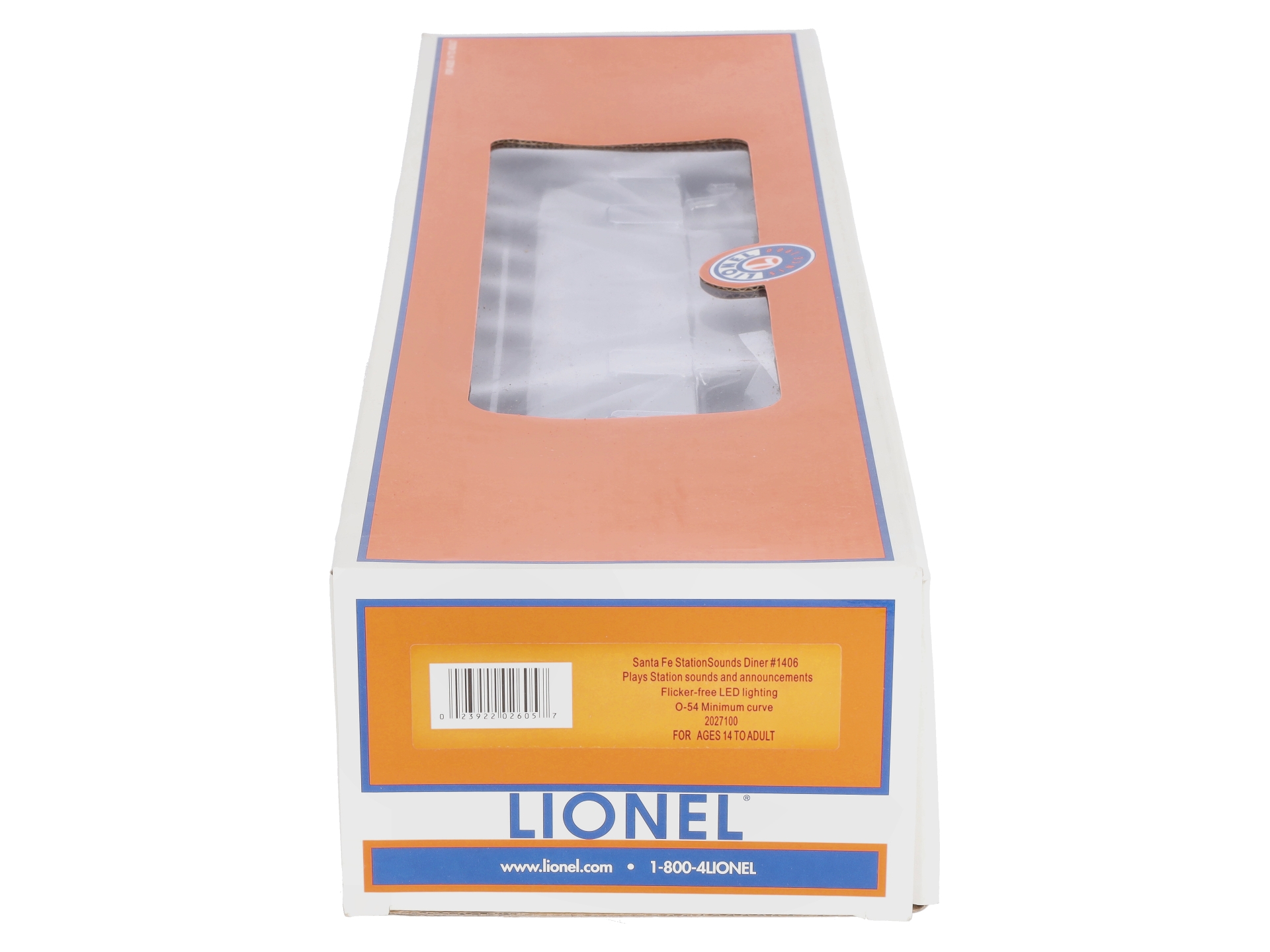 Here is a Lionel 2027100 O Gauge Santa Fe Station Sounds Diner Car #1406. This diner car features a plastic body construction with a detailed interior, overhead interior illumination, plays announcements at station stops and en route as "The California Limited", LEGACY, TMCC or conventional control, sequence control, die-cast trucks, metal wheels and axles, and operating knuckle couplers.
