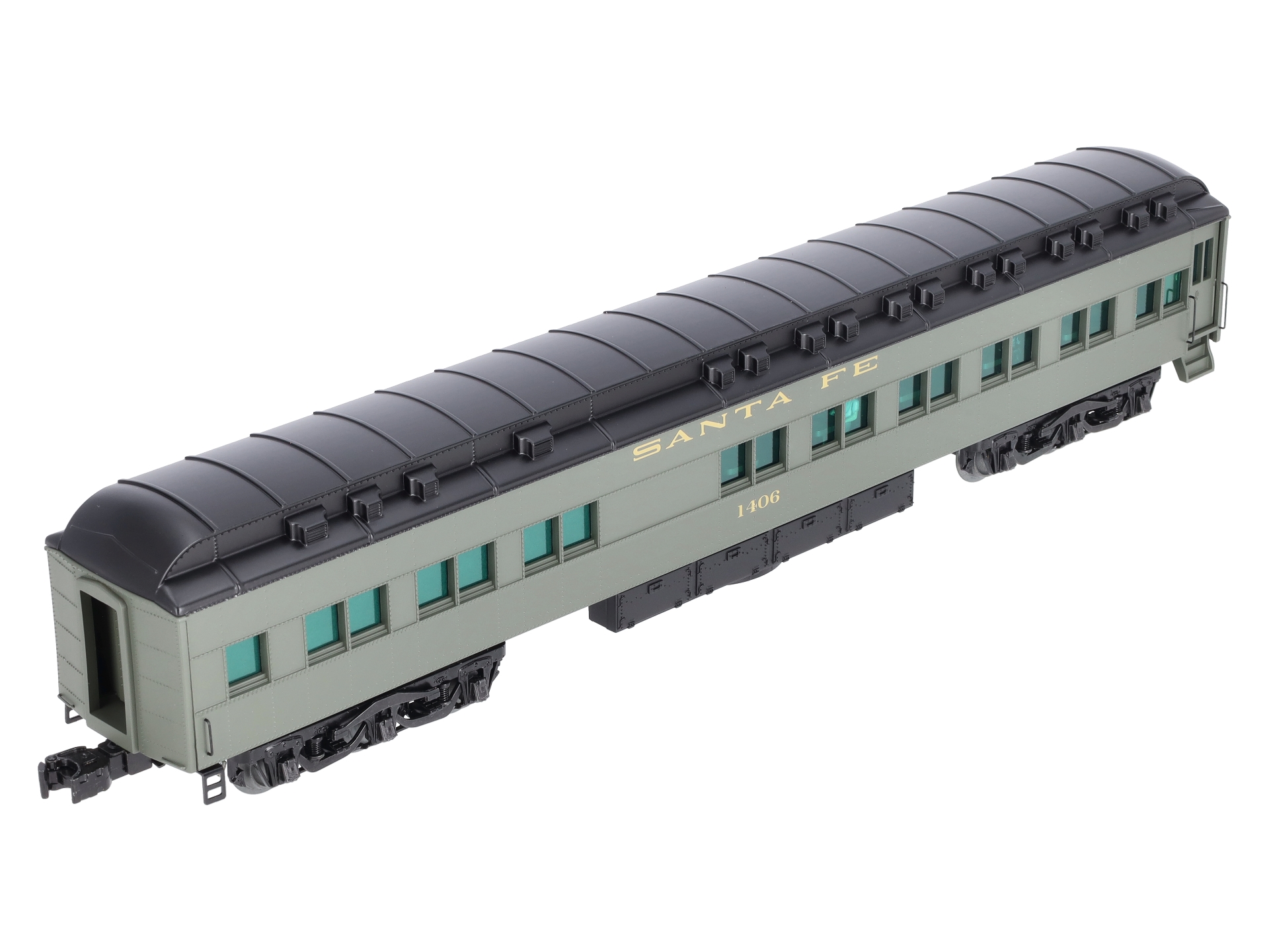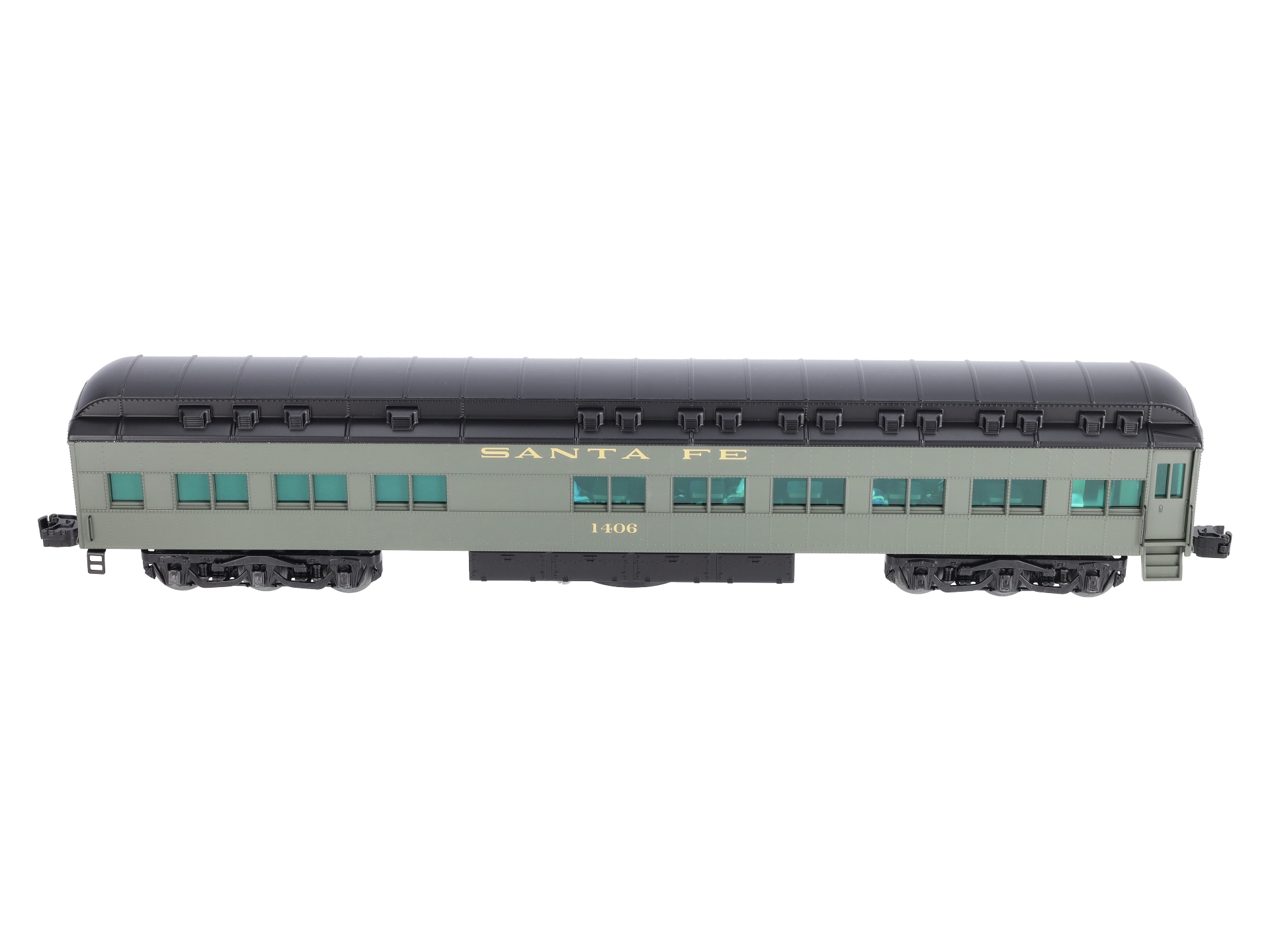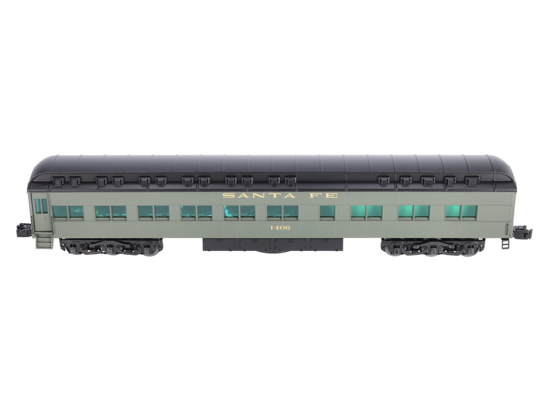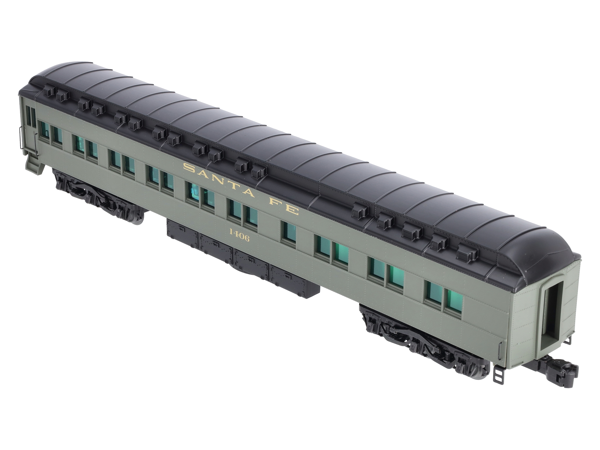 Here is a Lionel 2027100 O Gauge Santa Fe Station Sounds Diner Car #1406. This diner car features a plastic body construction with a detailed interior, overhead interior illumination, plays announcements at station stops and en route as "The California Limited", LEGACY, TMCC or conventional control, sequence control, die-cast trucks, metal wheels and axles, and operating knuckle couplers.