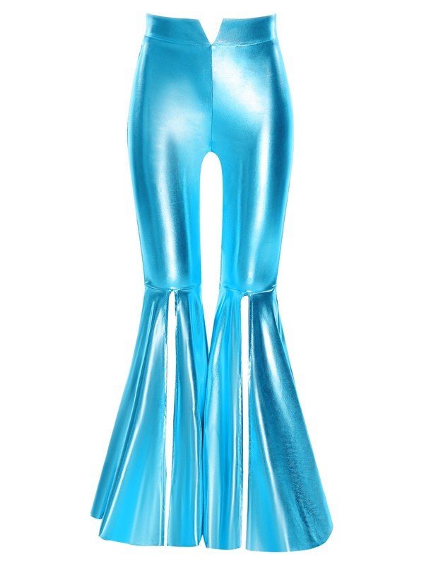 The split bell-bottom metallic pants add a touch of retro style, which is a hot fashion trend that combines vintage and modern elements.