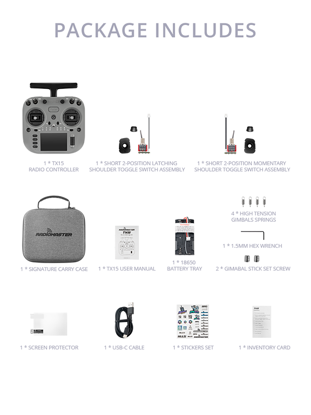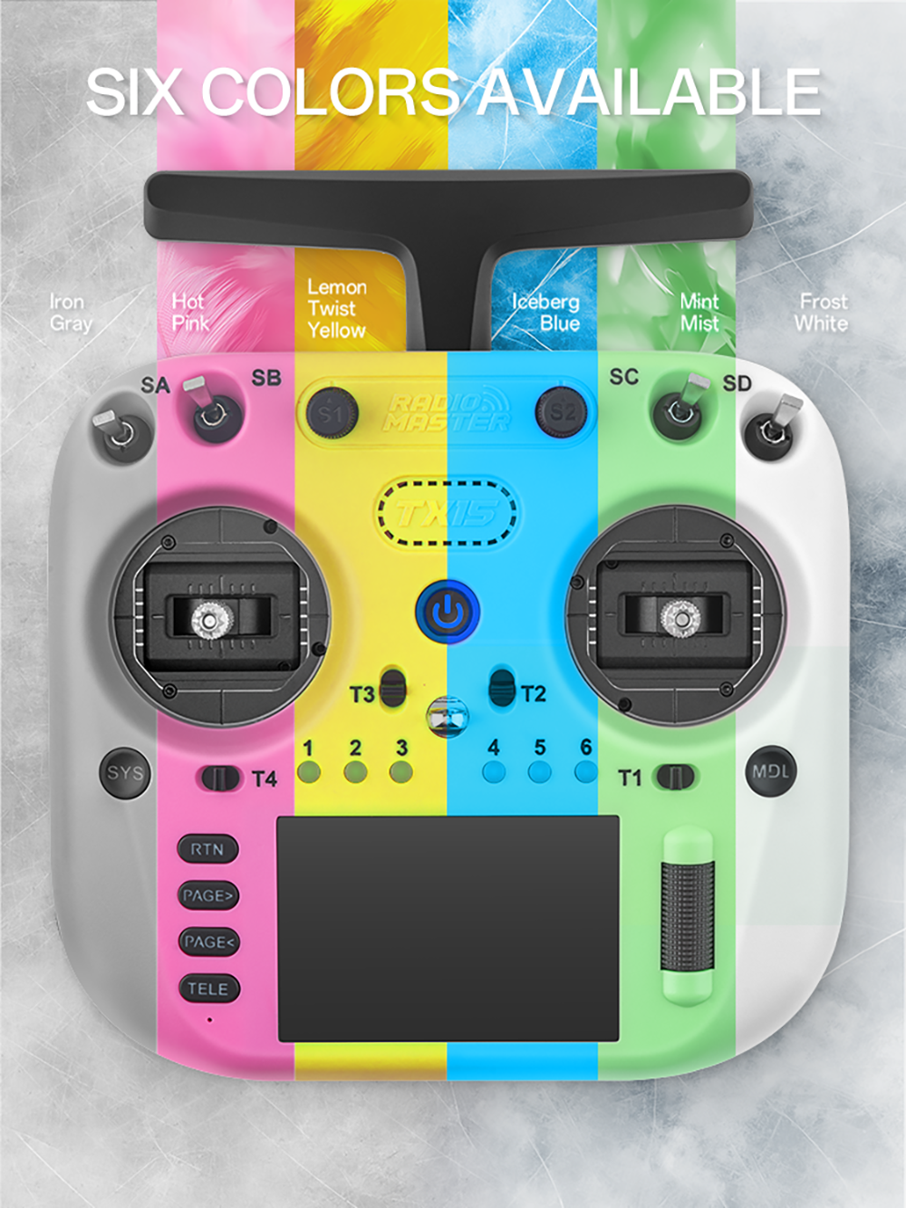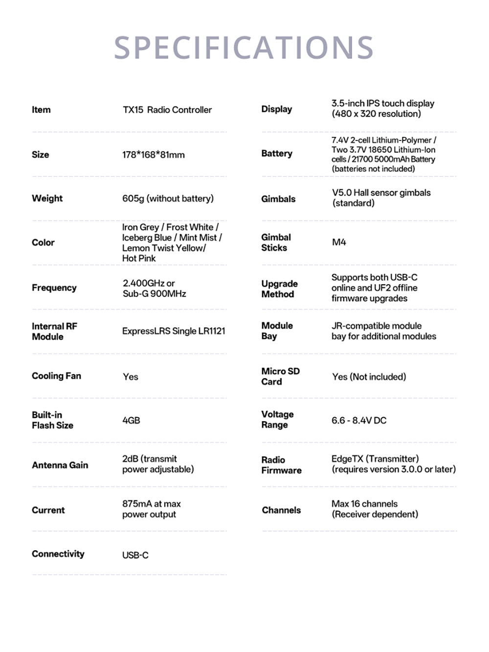 The new TX15 Radio Controller in 7unique, vibrant, and eye-catching colors,16channels,Standaard JR Module Compartment,Internal Module Cooling Fan Built In(only for ExpressLRS Version),the TX15 an ideal choice for pilots on the go.