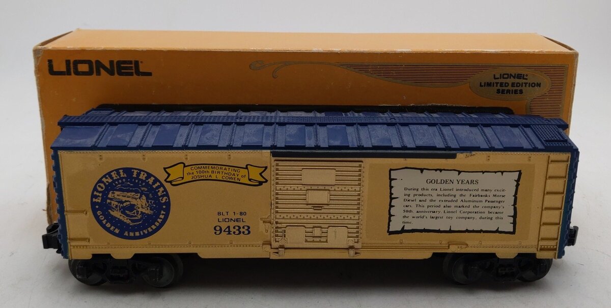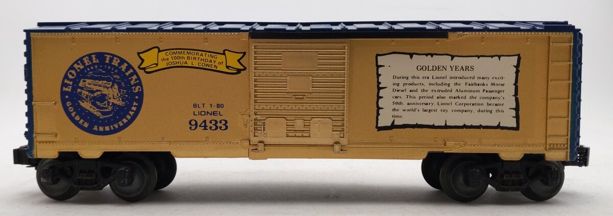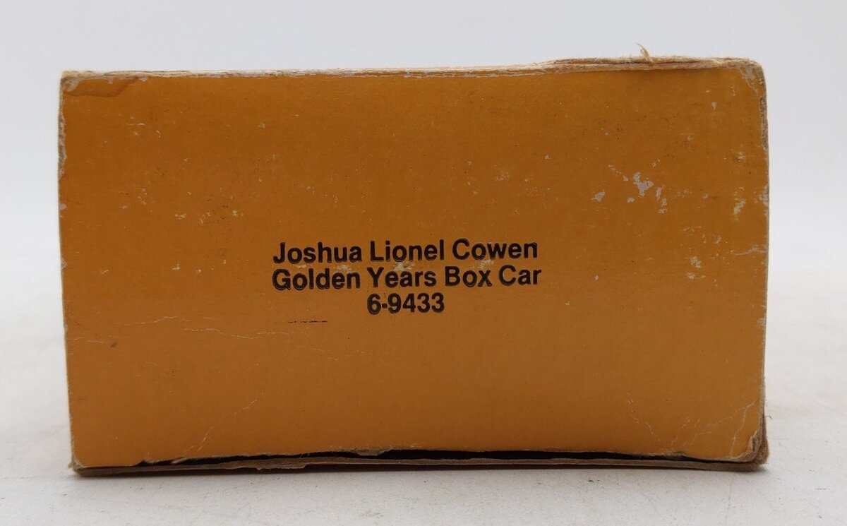 Here is a Lionel 6-9433 O Gauge Joshua Lionel Cowen Golden Years Boxcar from 1980. This car is part of the Joshua Lionel Cowen Commemorative set, which honored what would have been the 100th birthday of Lionel's founder, and it was also a component of the 1071 Mid-Atlantic Limited Set from that year. This car features sliding doors, die-cast metal sprung trucks, die-cast metal operating knuckle couplers, and metal wheels and axles.