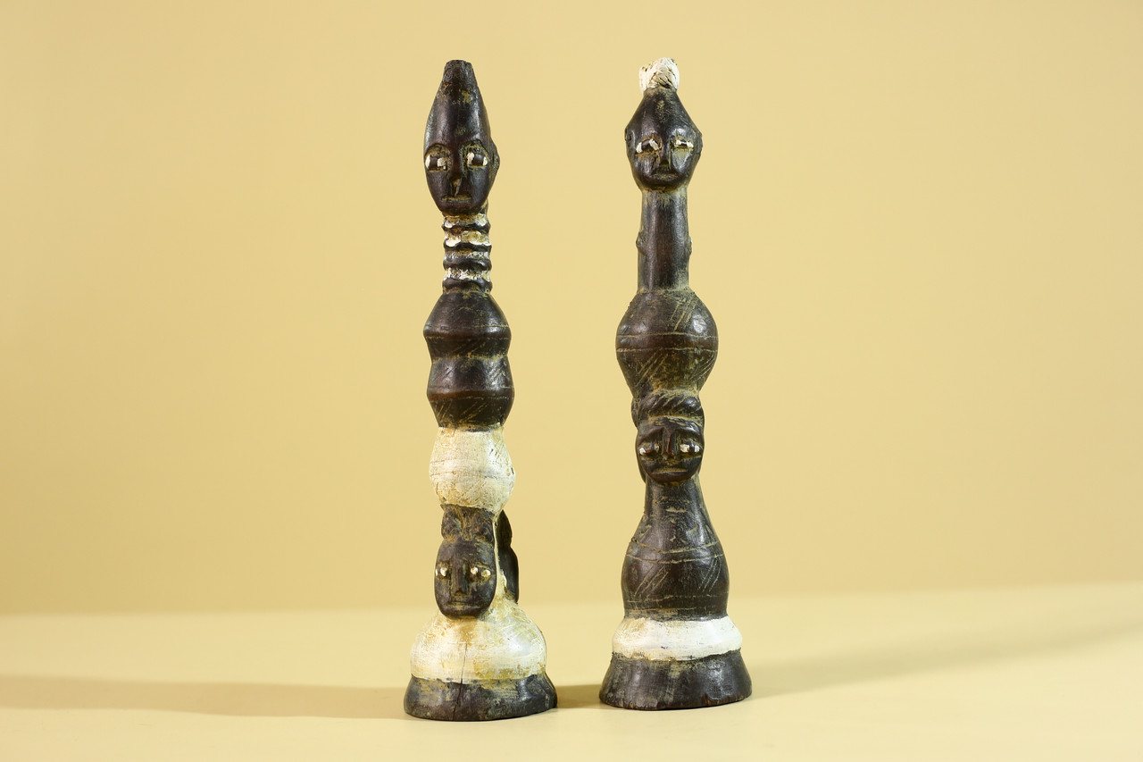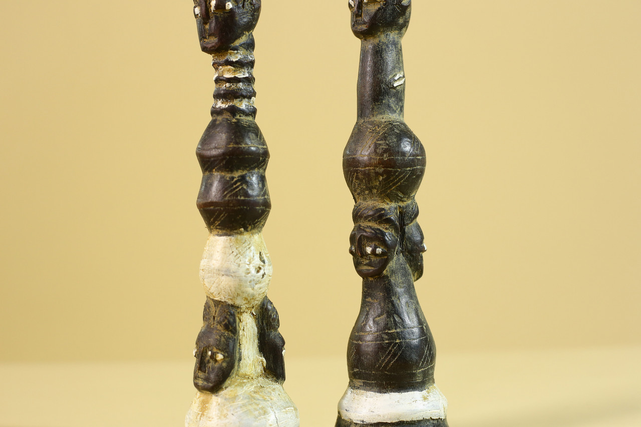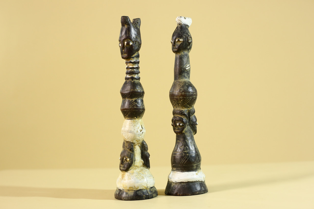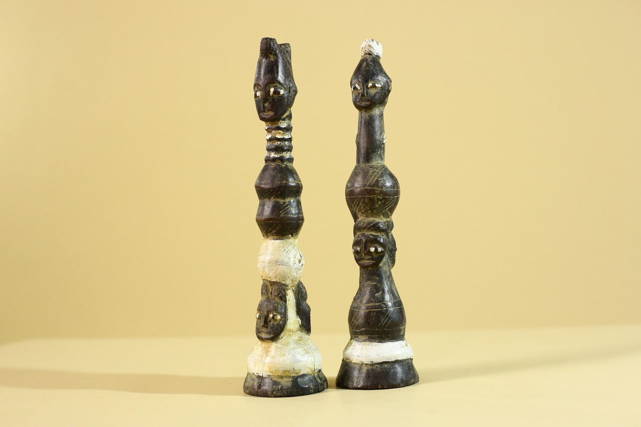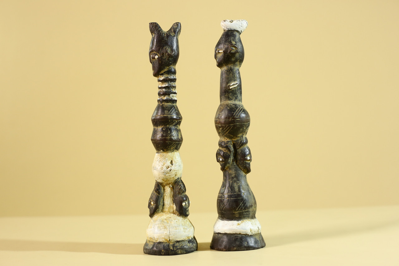 SIZE(CM): 27.3/6.5/6.5 Authentic pair of African hand-carved wooden figures, showcasing traditional tribal artistry and symbolic human forms. Each sculpture features elongated proportions and stylized facial expressions, characteristic of ceremonial and cultural carvings. The figures display natural patina, pigment traces, and surface wear that reflect age and use, enhancing their authenticity and collectible value. The carved detailing along the bodies and heads highlights skilled craftsmanship and cultural significance. Ideal for collectors of African art, ethnographic pieces, or as striking decorative sculptures in interior spaces. Measurements; Height: 27.3 cm / 10.75 in Width: 6.5 cm / 2.6 in Depth: 6.5 cm / 2.6 in