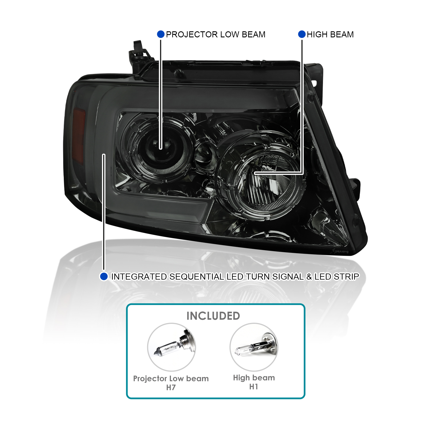 Smoke Projector Headlights LED Sequential Switchback Signal Compatible with Ford F150 2004-2008, 06-08 Lincoln Mark LT, L+R Pair Head Light Lamp Assembly