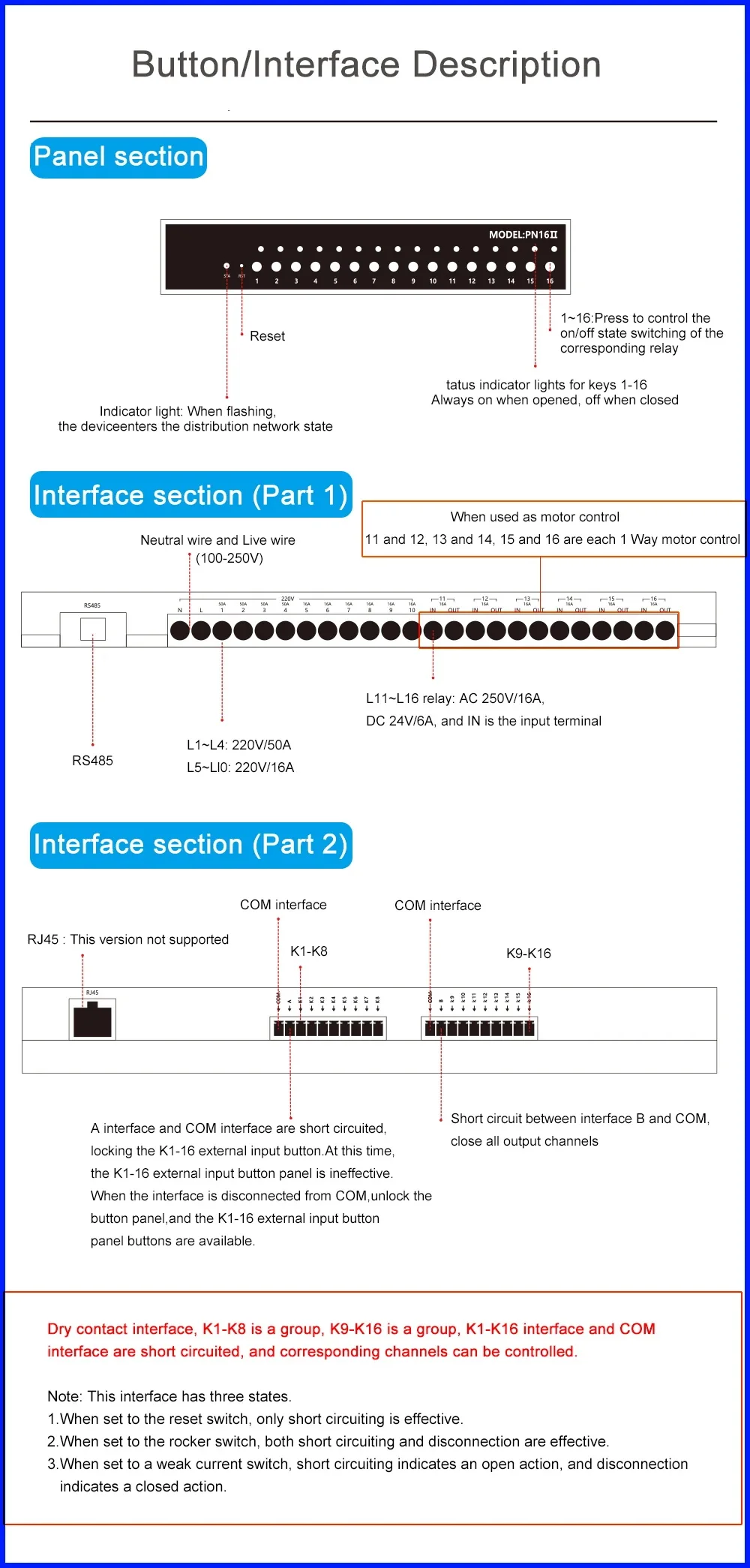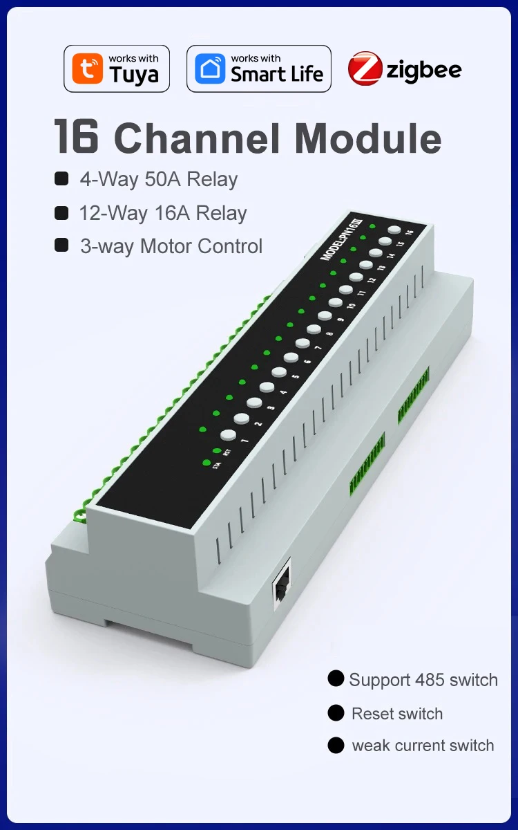 1. A total of 16 channels, of which 1-4 channels are 50A Magnetic latching relays and 5-16 channels are 16A relays.