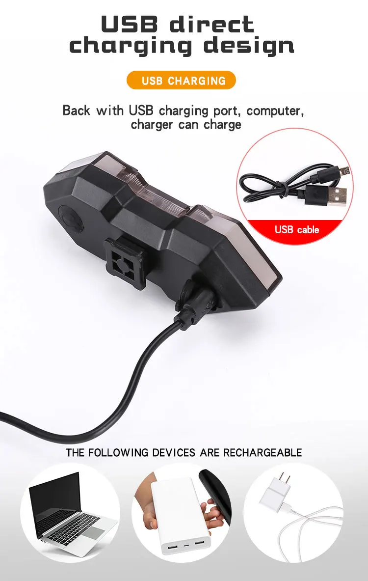 ◆ USB rechargeable, just connect bike tail light to the power supply with included USB cable.