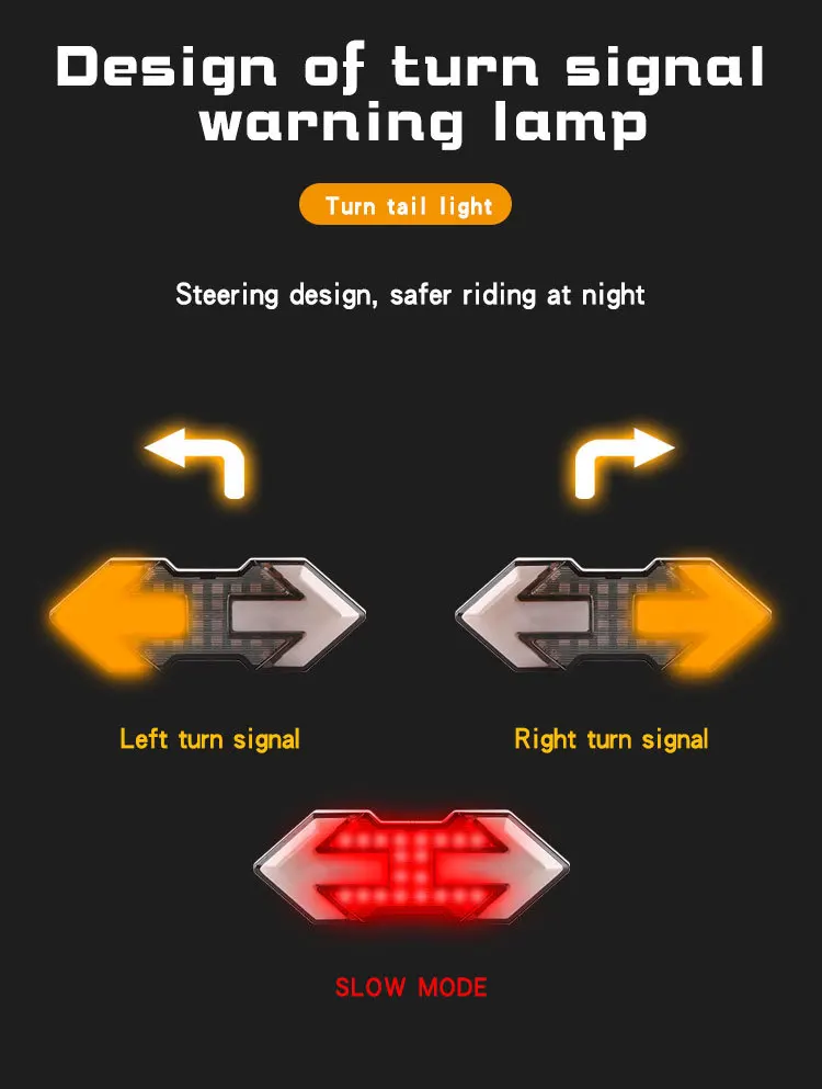 ◆ 5 basic light modes, left turn signal, right turn signal, red strobe, red slow flash, red all flashing. Turn signal can also be used in combination with the red light mode.