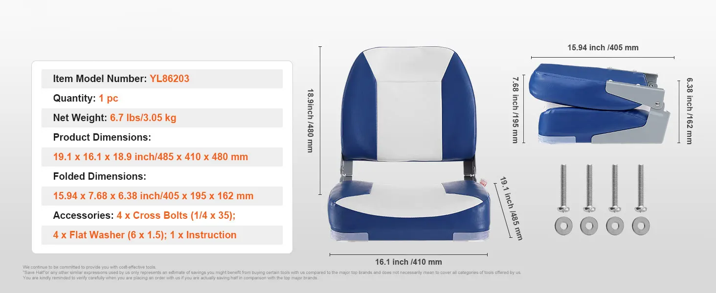 Collapsible Rust-Proof Hinge: The heavy yet flexible rust-proof hinge allows for easy folding of the backrest. When not in use, the seat for boat securely stays folded, ensuring hassle-free folding and storage without taking up excessive room.