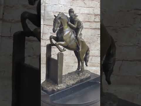 The jockey is dressed in full racing attire, complete with a cap and riding gear, while the horse is adorned with a beautifully detailed saddle. Every aspect of the sculpture, from the muscular build of the horse to the intricate headstall and flowing tail, adds to its authenticity and realism.