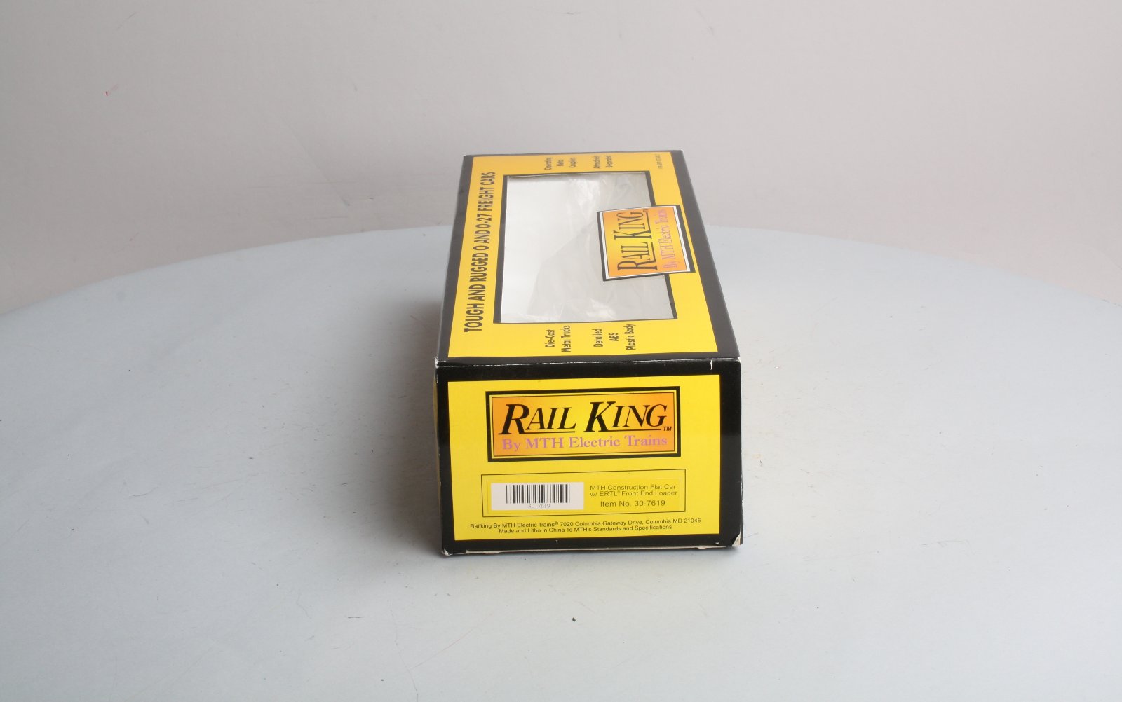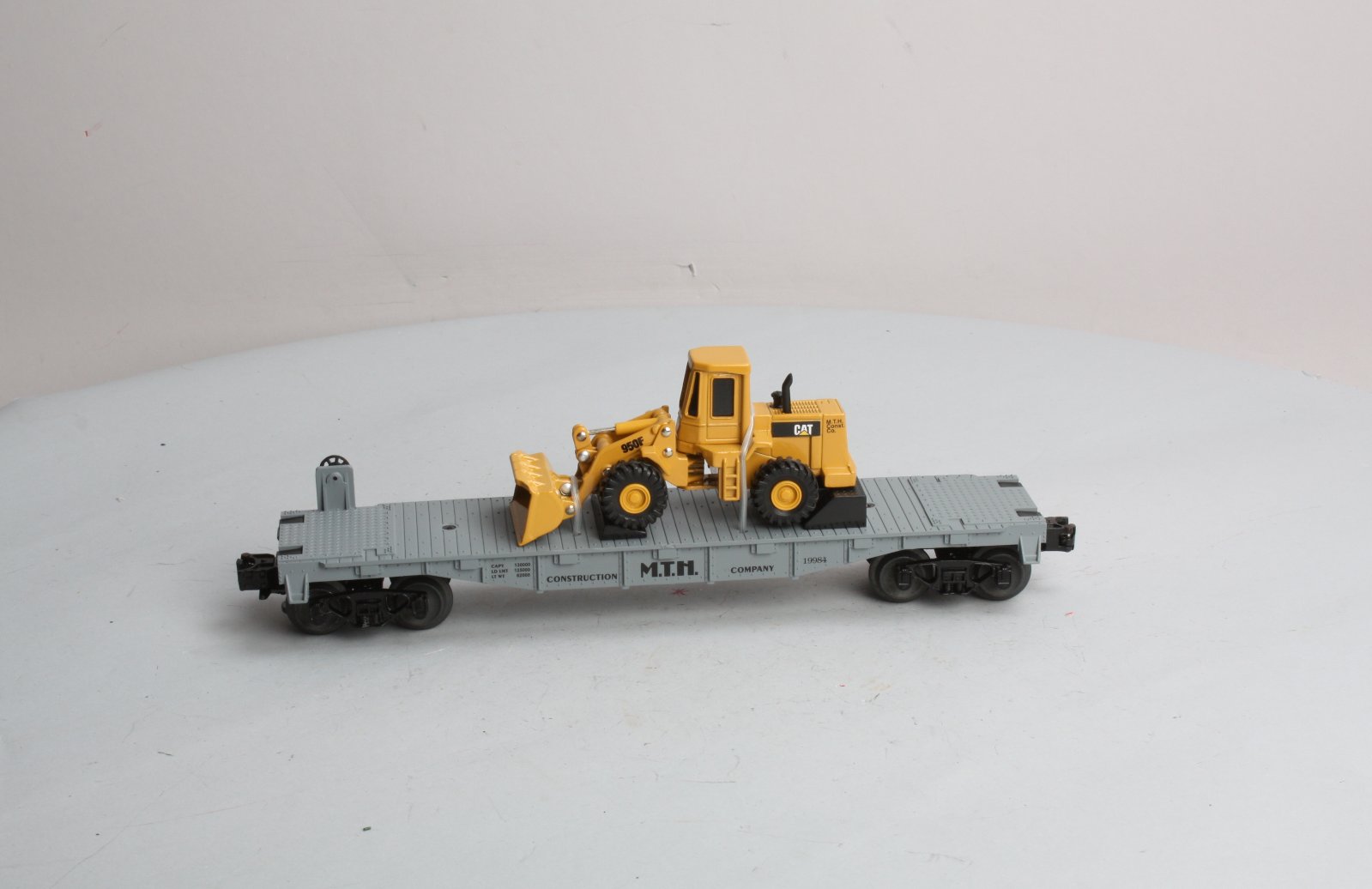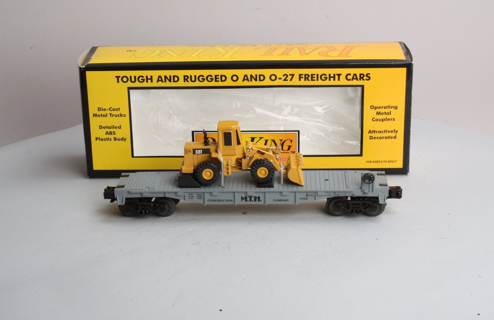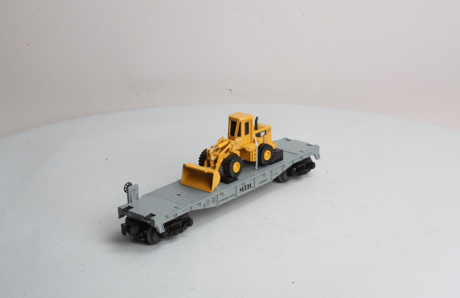 Here is a Rail King MTH 30-7619 MTH Construction Flatcar with Ertl Front End Loader from 1998. This flatcar features die-cast metal sprung trucks, die-cast metal operating knuckle couplers, metal wheels and axles.