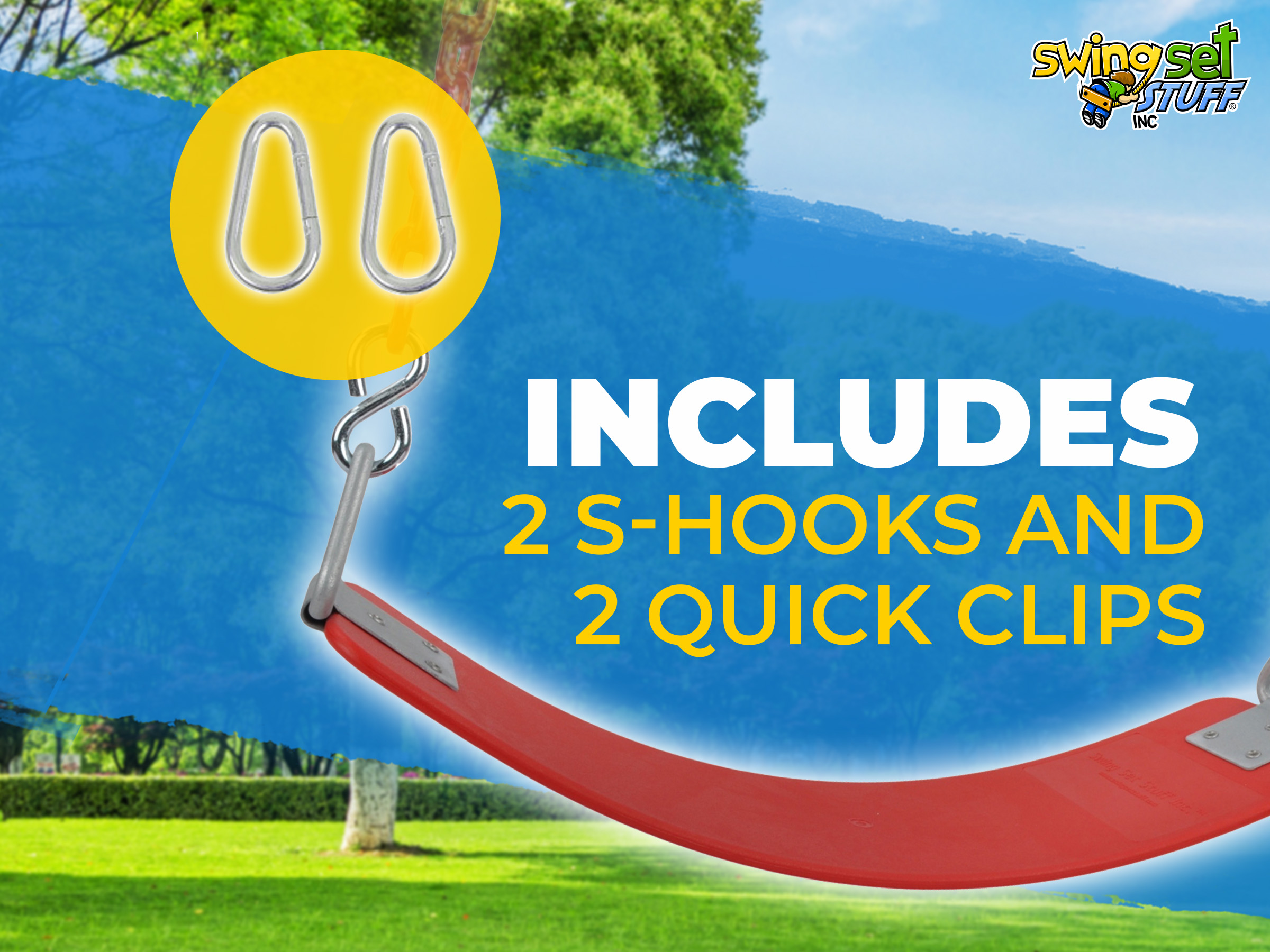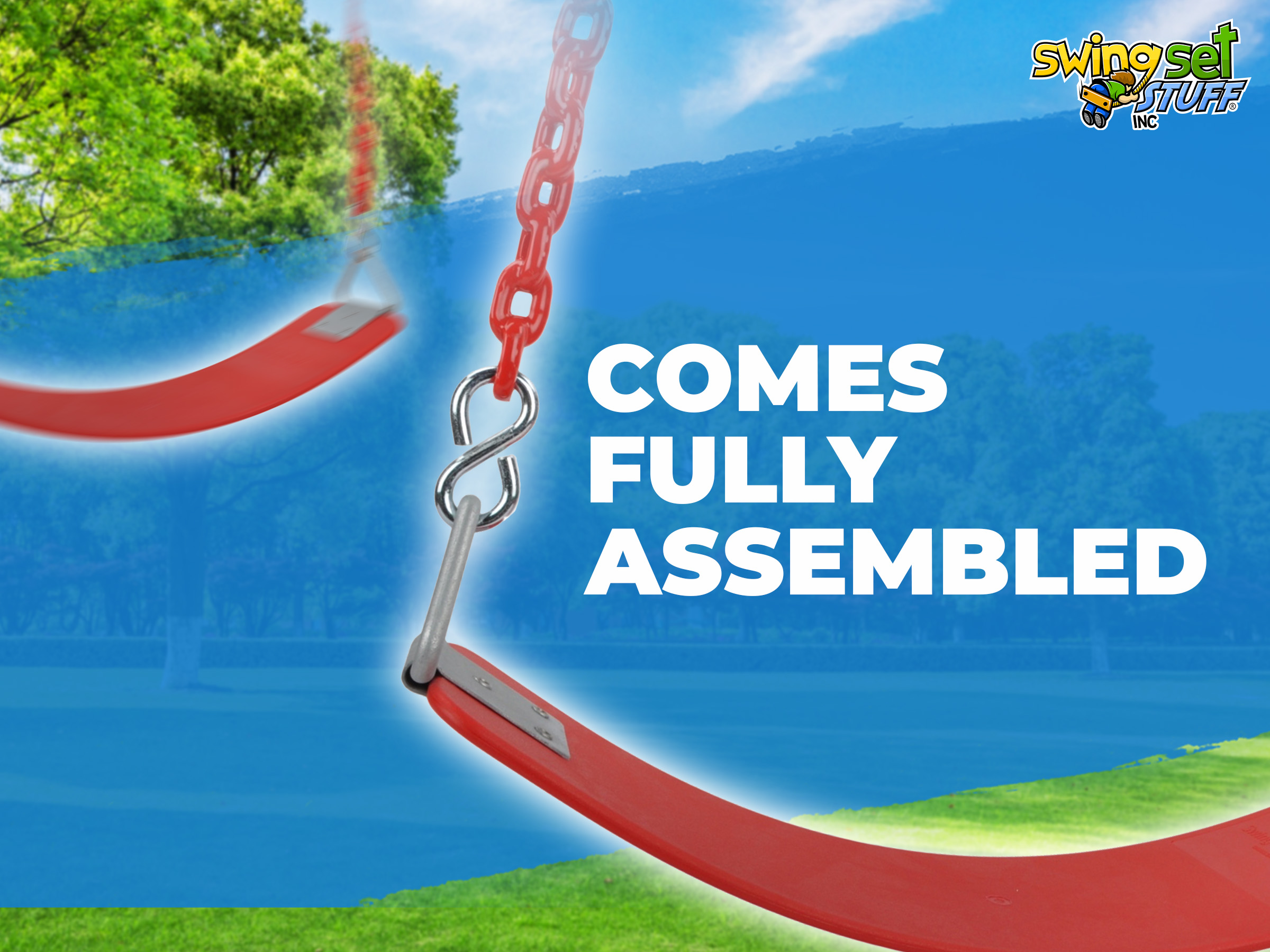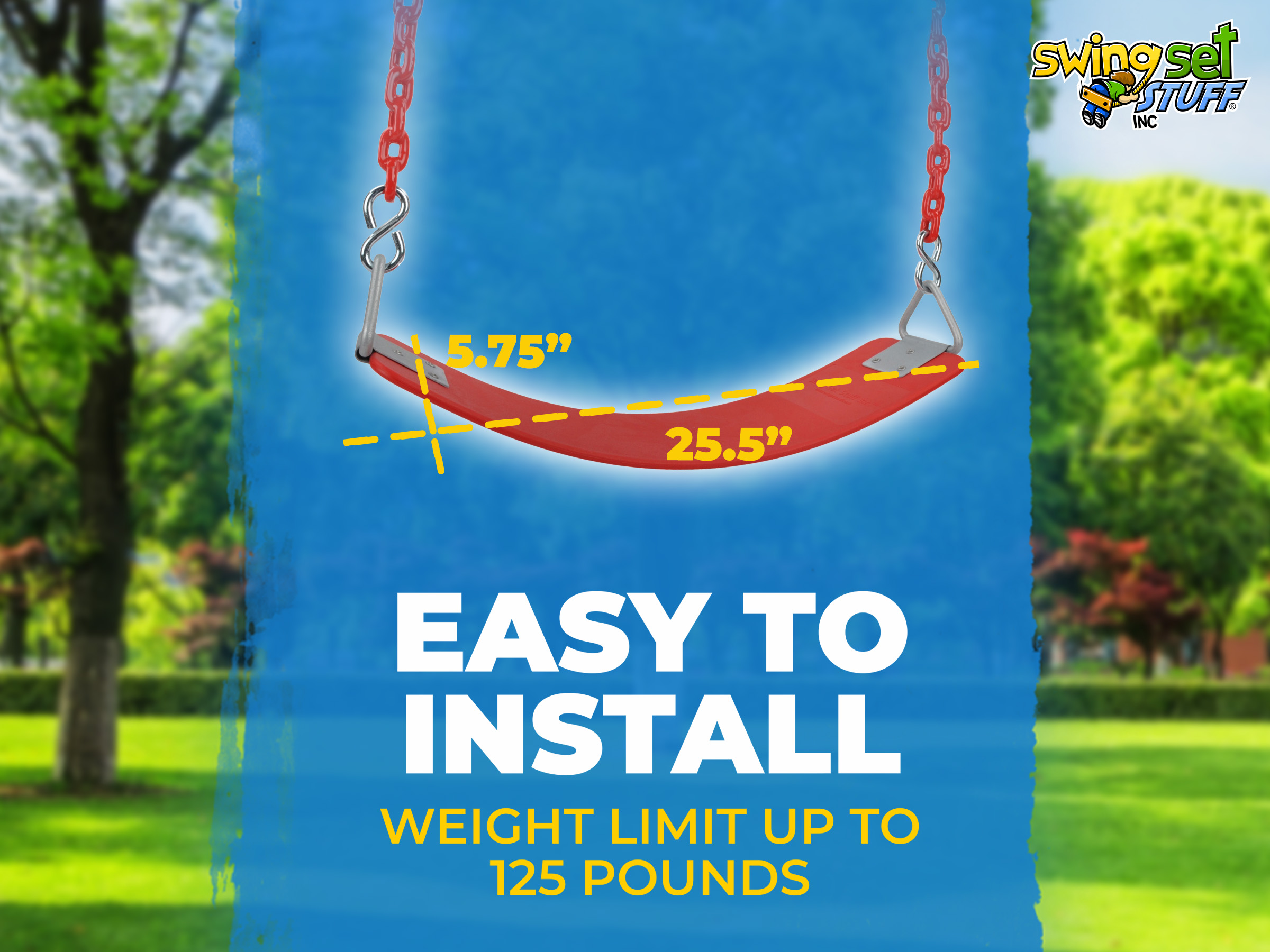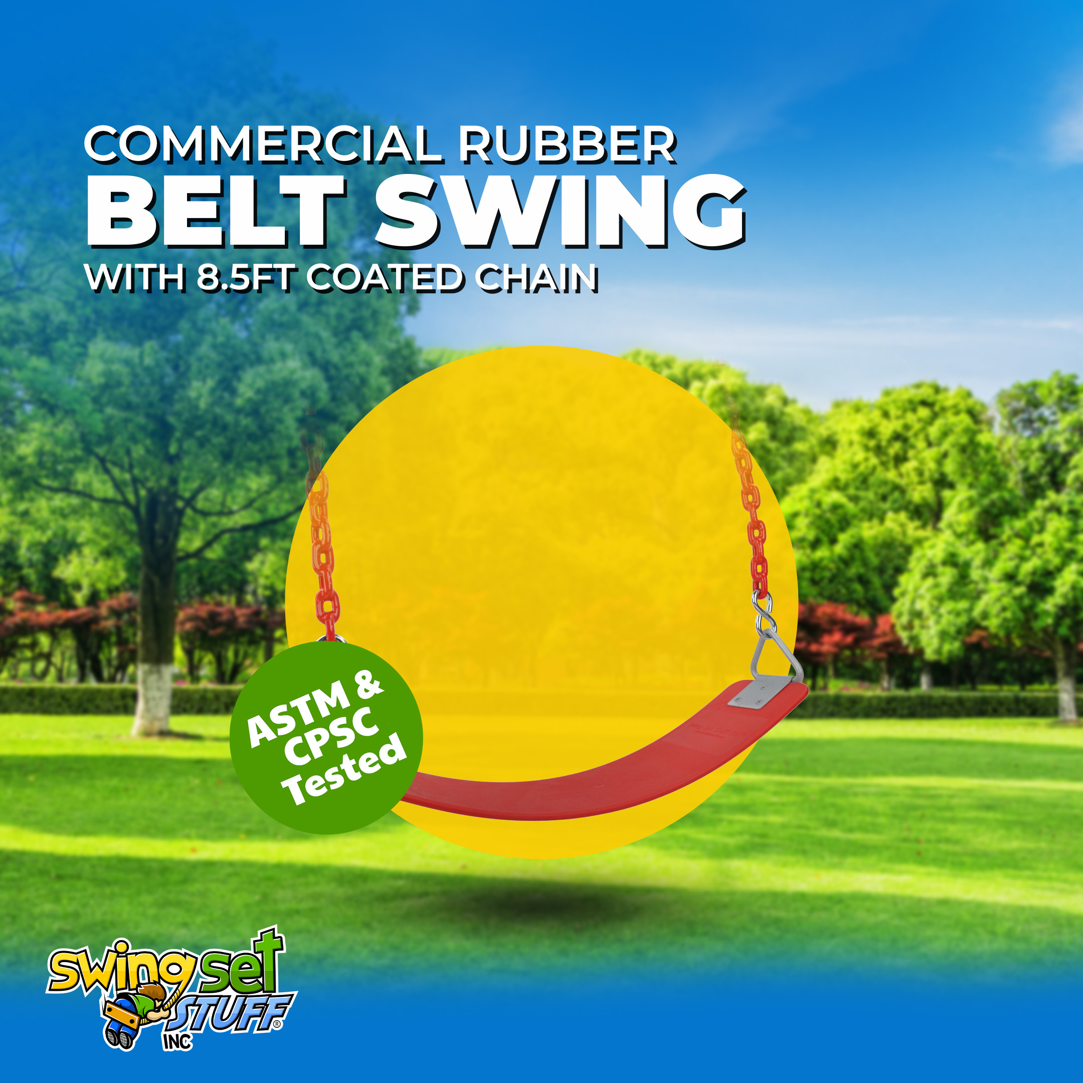 This swing features our commercial rubber belt seat assembled with s-hooks, 8.5ft vinyl coated chain and clips for easy attachment. The seat includes a steel insert to add strength and durability. The triangle rings on the side are galvanized to prevent rust. The chain under coating is 3/16".