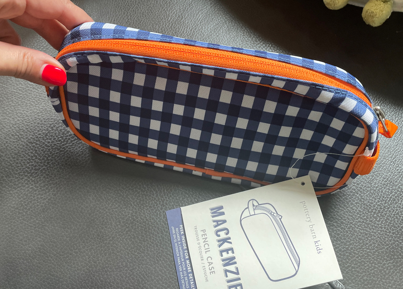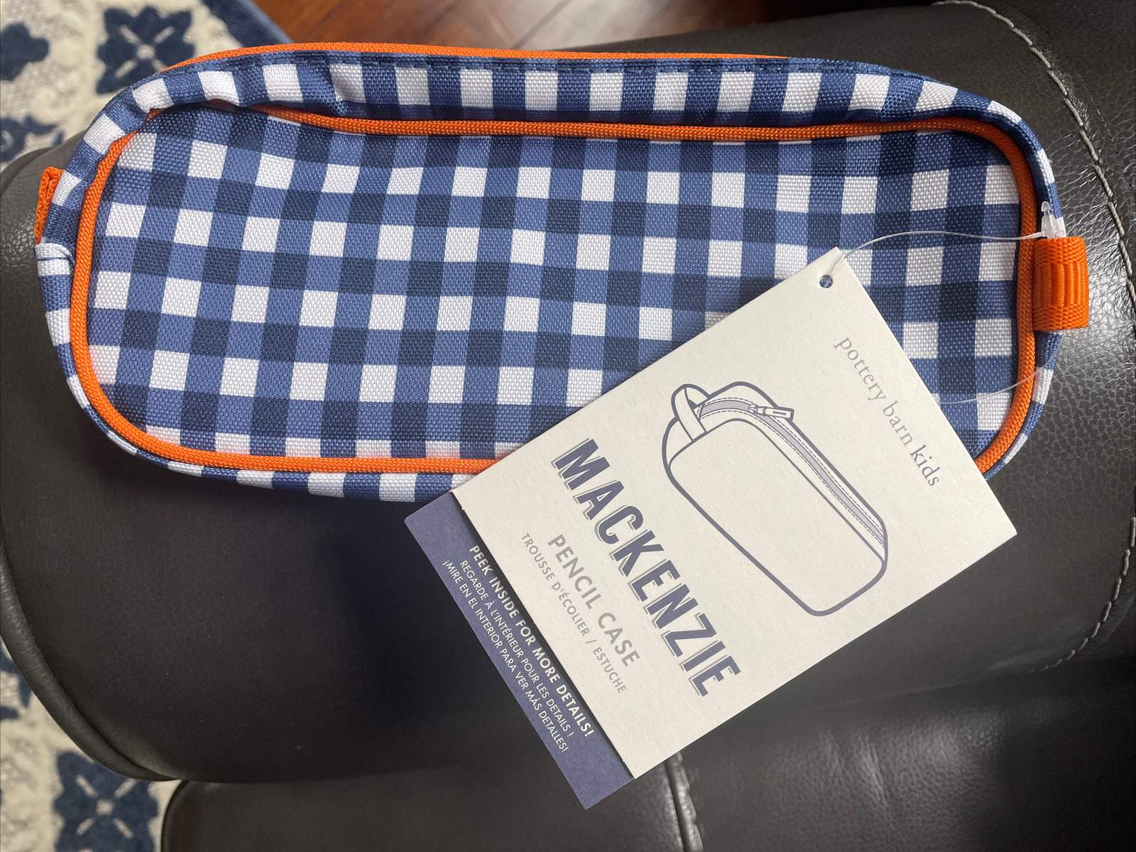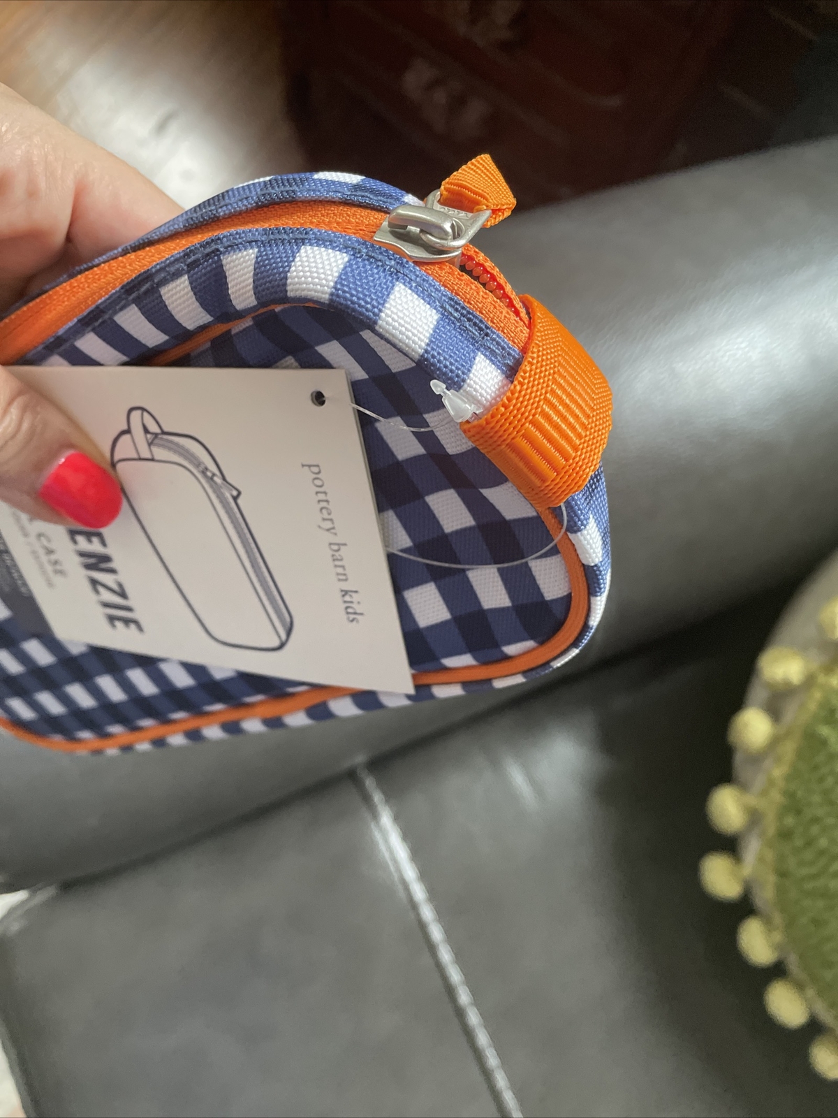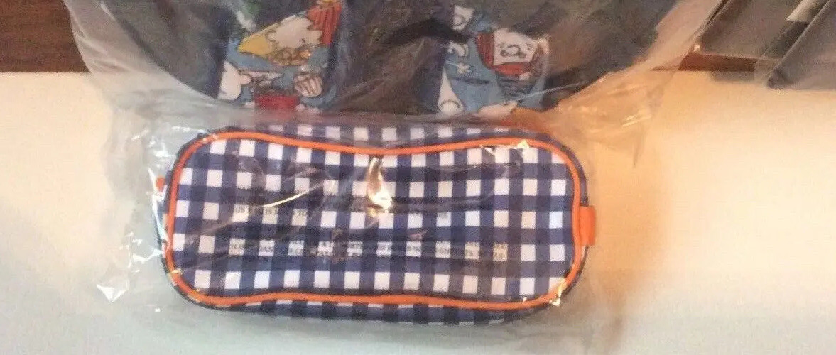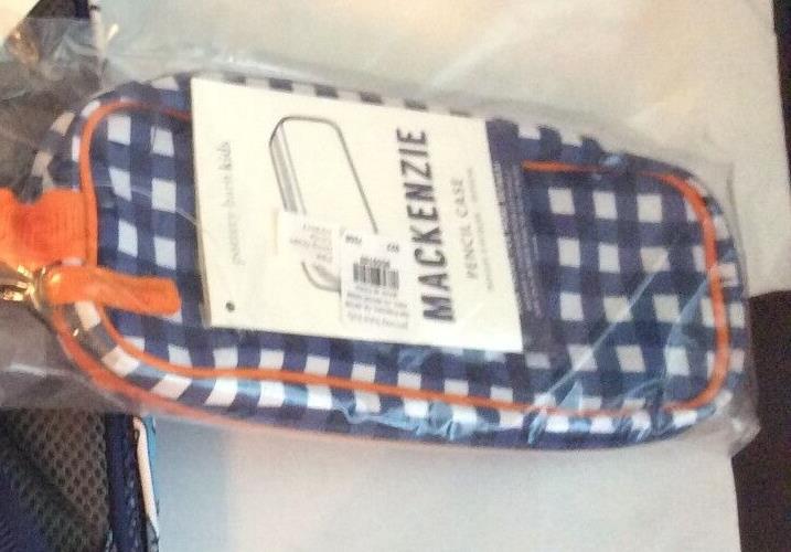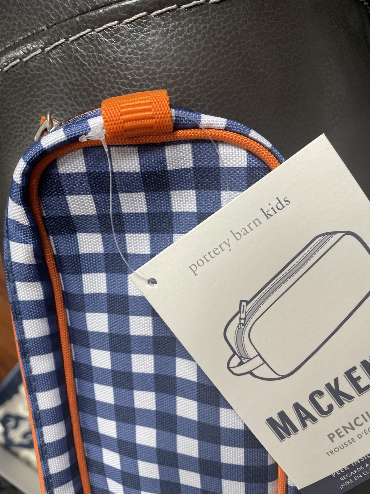 1.    Navy Gingham case with orange piping and zipper. zips closed with handle to hold school supplies or small items.