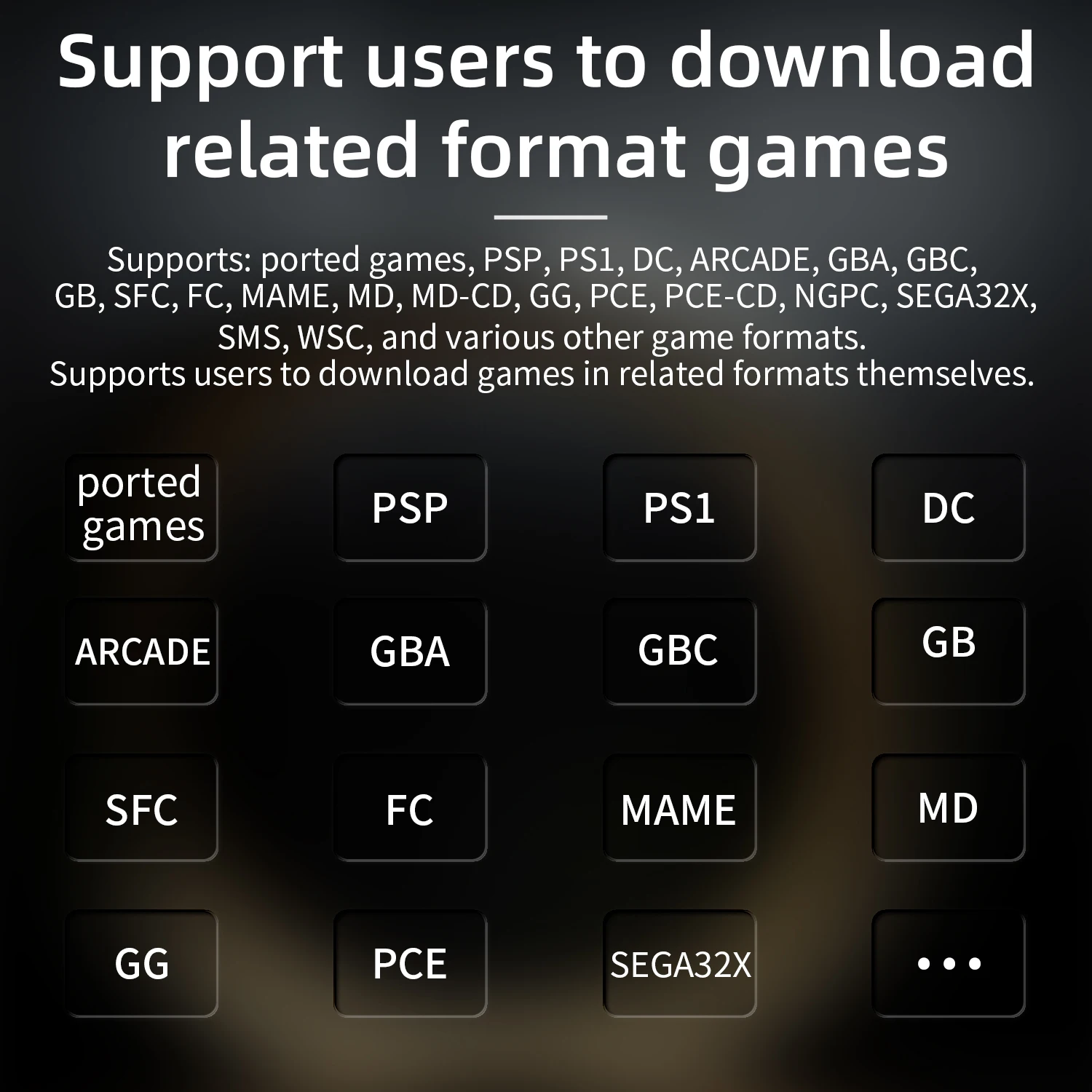 Games | Supports: ported games, PSP, PS1, DC, ARCADE, GBA, GBC, GB, SFC, FC, MAME, MD, MD-CD, GG, PCE, PCE-CD, NGPC, sega32x, SMS, WSC, and various other game formats. Supports users to download games in related formats themselves. |