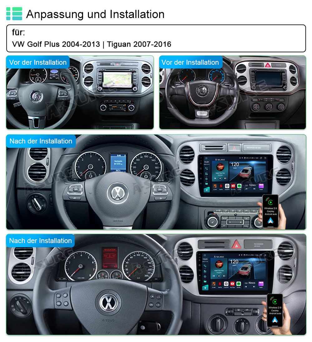 Android Auto & Wireless Carplay:CarPlay ist Apples sprachaktiviertes System für Autos, das darauf abzielt, über Siri und Ihr iPhone eine vereinfachte Startseite auf dem Touchscreen des Autos anzuzeigen, ohne dass Sie ständig auf den Bildschirm starren oder Tasten bedienen müssen. Sie können auch mit CarPlay interagieren, indem Sie die Sprachtaste am Lenkrad drücken. Android Auto verbindet Ihr Android-Handy mit unserem Radio und zeigt Ihre Android-Apps direkt auf dem Bildschirm an. Tippen Sie, um Navigationsanweisungen zu erhalten, verwenden Sie die Spracheingabe, um Textnachrichten zu senden, und tätigen Sie sogar freihändige Anrufe bei Familienmitgliedern. Android Auto ist darauf ausgelegt, Ihnen zu helfen, sich auf das Fahren zu konzentrieren und Ihre Zeit auf der Straße angenehmer zu gestalten.