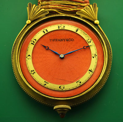 TIFFANY & Co ANTIQUE WALL CLOCK , 9" LONG WITH FABRIC RIBBON (ORIGINALLY WAS SILK) 3.5" IN DIAMETER , 24MM THICK, APPEARS TO BE MADE OUT OF BRONZE IN VERY GOOD CONDITION. THE WORKING MOVEMENT IS MANUAL WIND ADJUSTED IN 3 POSITIONS.