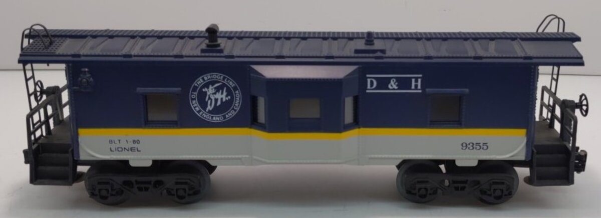 This is a Lionel 6-9355 O Gauge Delaware & Hudson Bay Window Caboose from 1980. This caboose features a durable plastic construction, interior illumination, plastic trucks, operating knuckle couplers, metal wheels and axles, and separately applied detail trim parts.