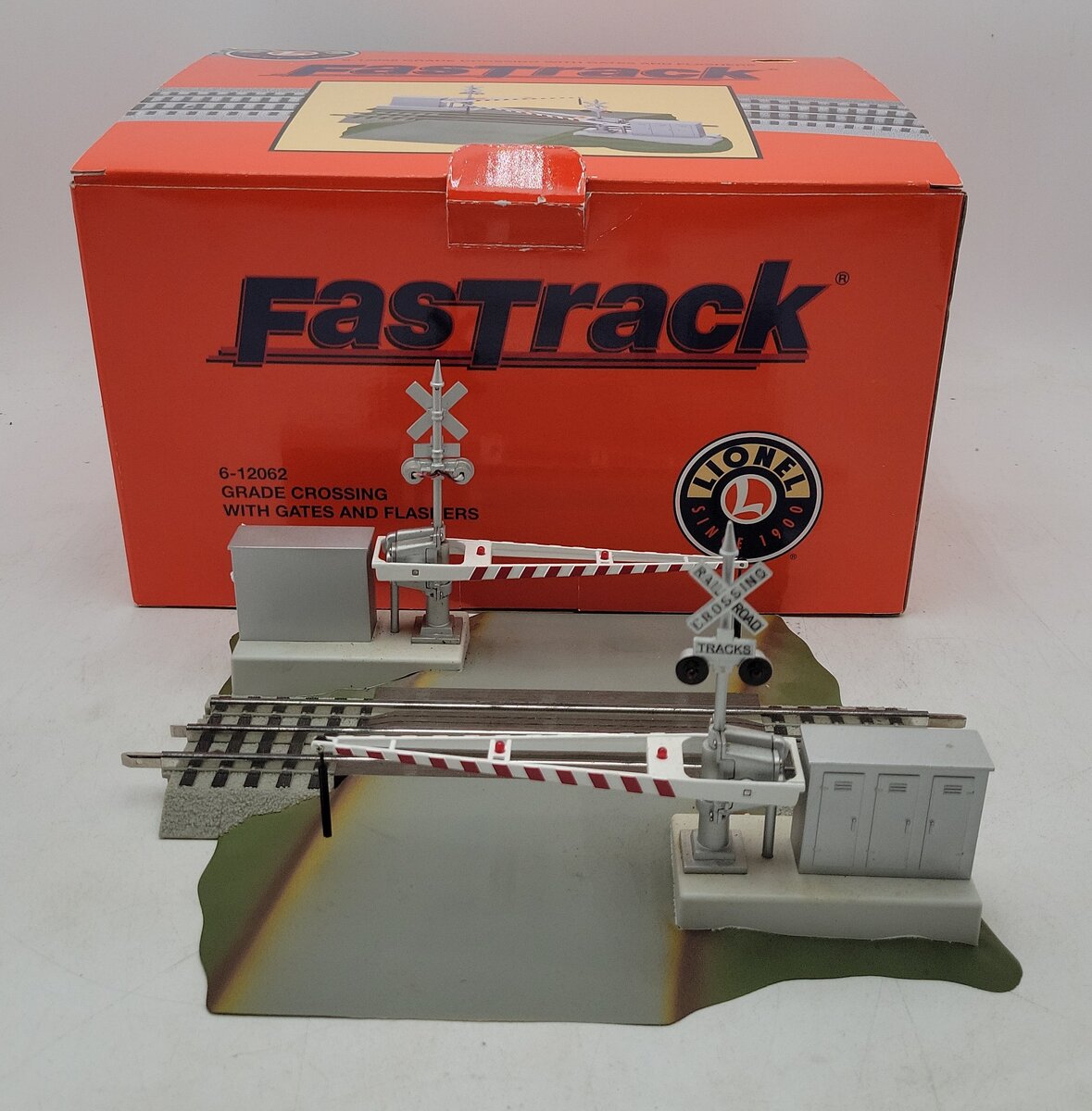Here is a Lionel 6-12062 O Grade Crossing With Gates & Flashers. Features include crossing gates, flashers, and bell sounds. It measures approximately 10 inches long and has a 6 1/4 inch long road section. This does not include the original insulated track sections with it.