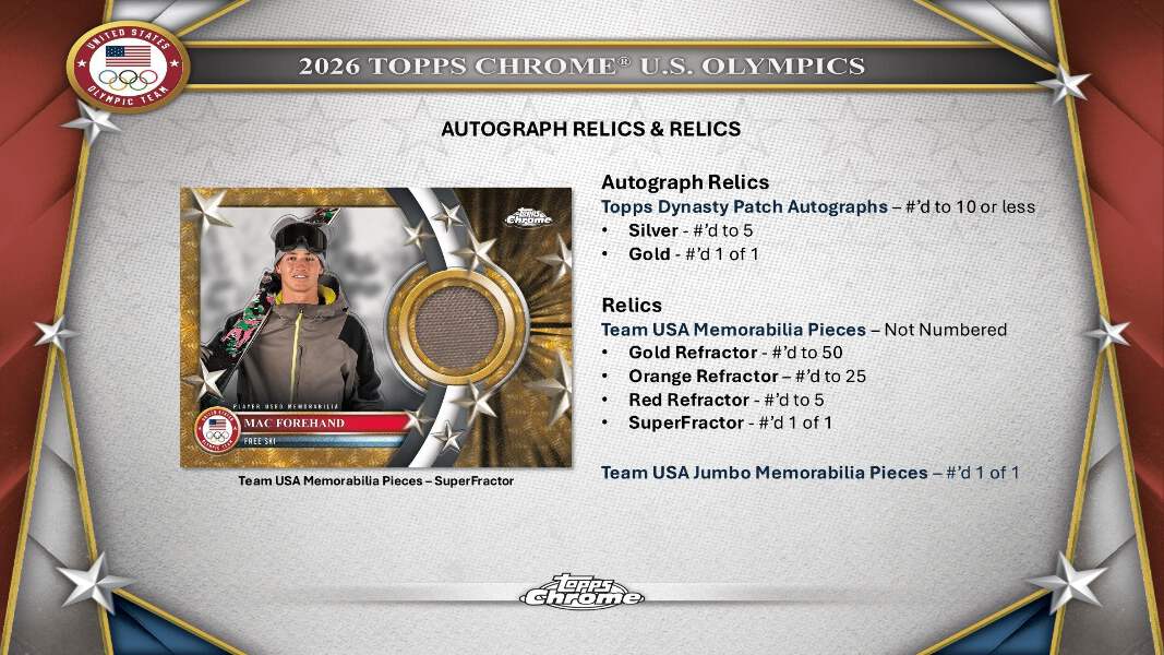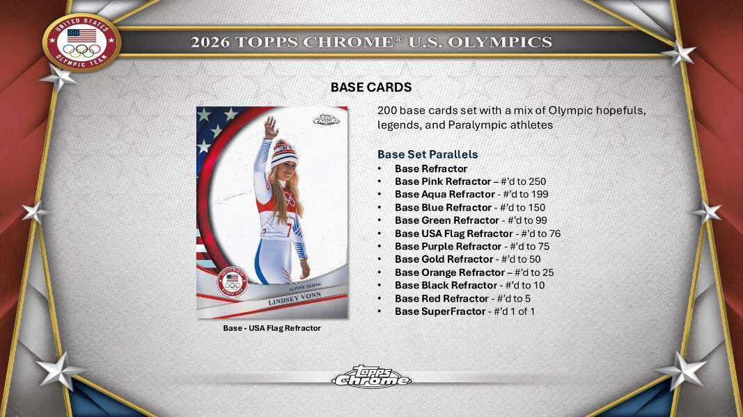 Celebrate the spirit of winter competition with the 2026 Topps Chrome U.S. Olympics Collection—your front-row ticket to America’s greatest athletes as they chase glory in Milano Cortina. Featuring brilliant Chrome finishes and dynamic photography, this collection spotlights rising hopefuls, established stars, Olympic icons, and standout Paralympians on the road to the Winter Games.