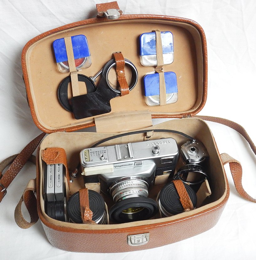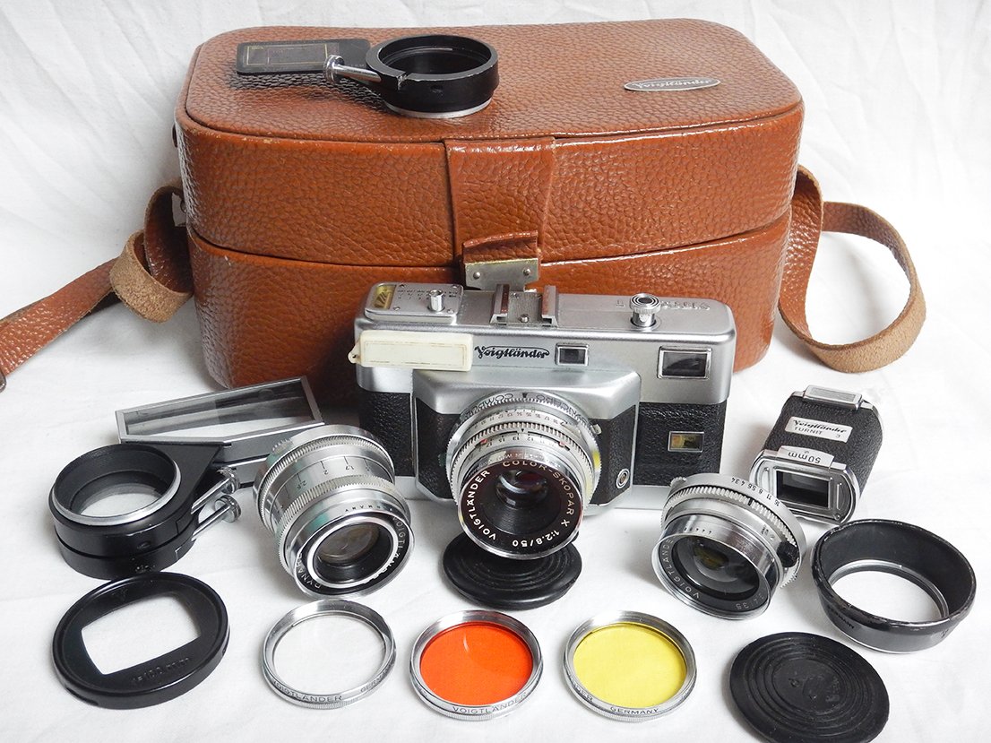 Rare Camera Voigtlander Vitessa T (Whole Set) with 50mm f2.8 Color-Skopar lens + 35mm f3.4 Color-Skopar lens + 100mm f4.8 Dynaret lens + Red, Yellow, UV Filters + Lens Hood + Viewfinder Turnit 3 + Voigtlander T-Proximeter I&II + Original Case for the Whole Set + Instructions in excellent condition as you can see in the pictures below. The camera works perfectly. Contact me for more information.