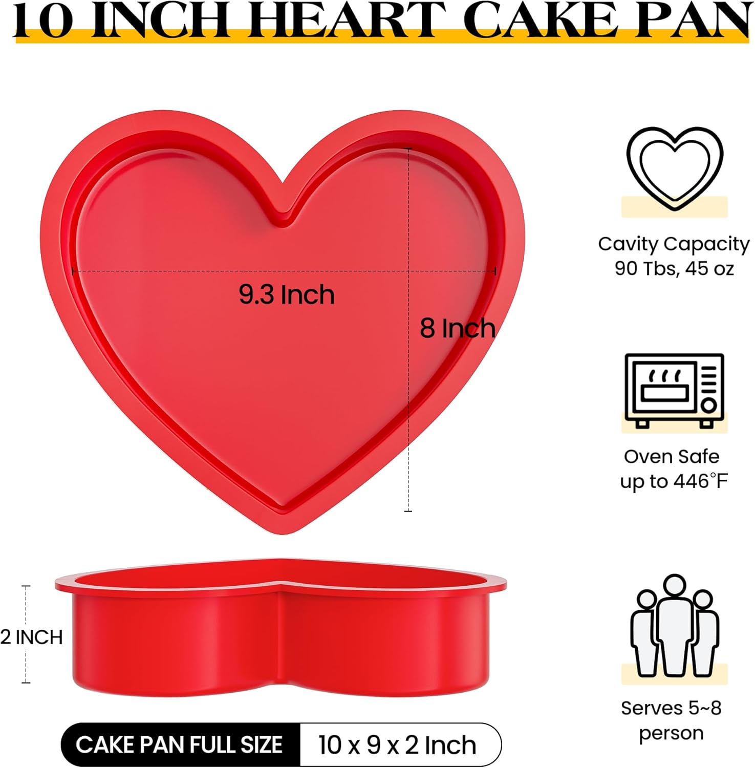 10 Inch Size: Paa includes 2 pcs lar heart s set. Full heart pan size is 10 x 9 x 2 inch,cavity size is 9.3 x 8 x 2 inch,cavity volume is 110 Tbs / 55 oz.