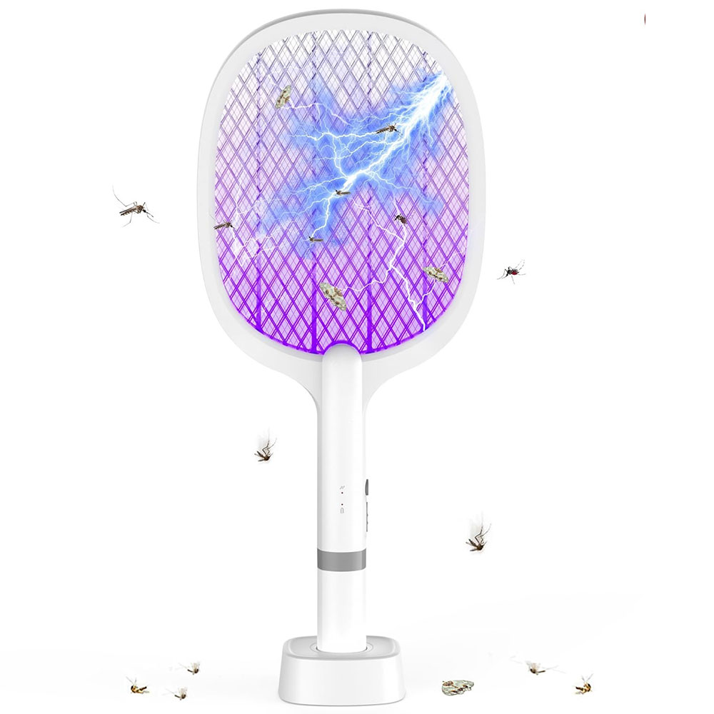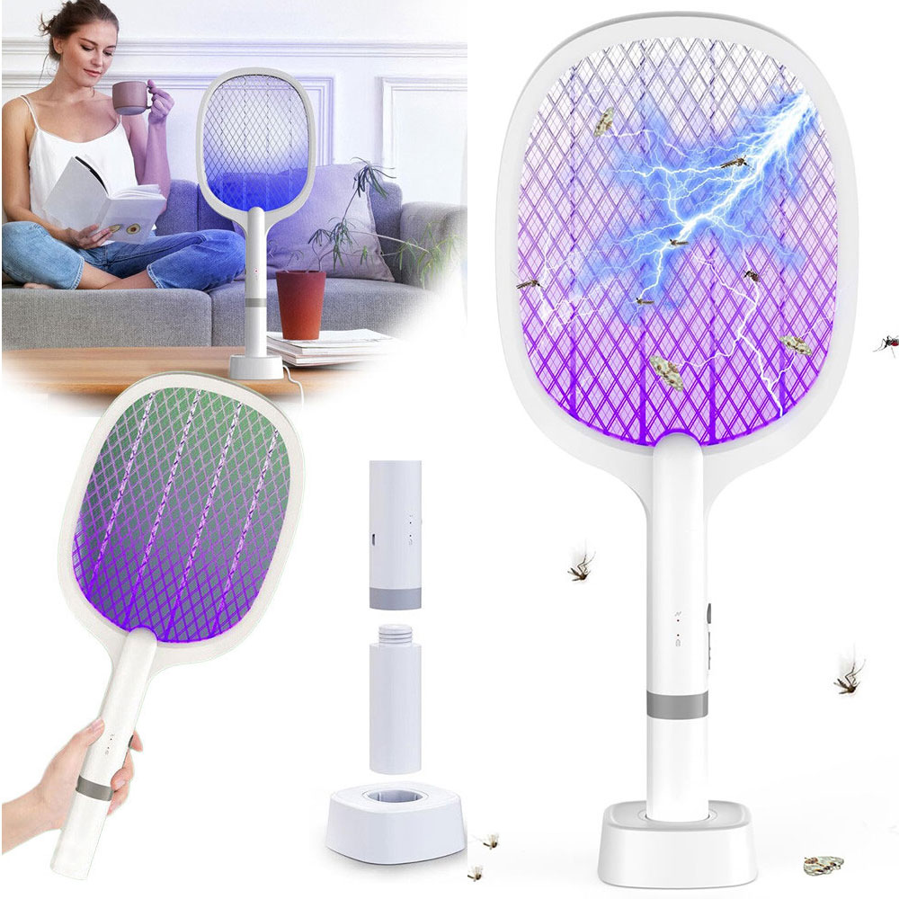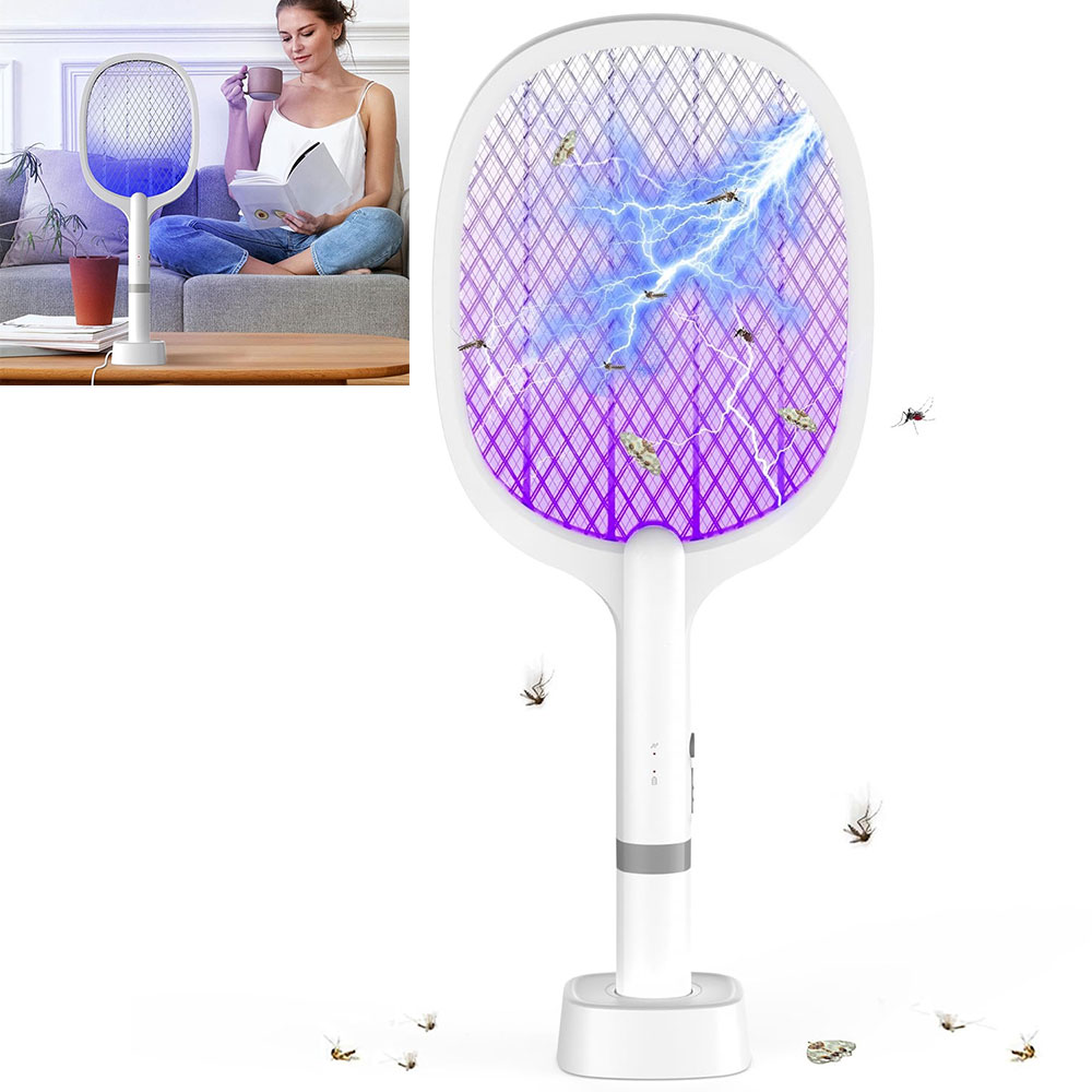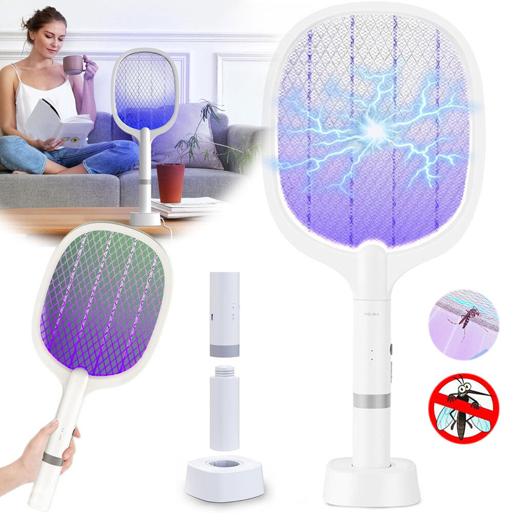 Elektrische Fliegenklatsche 5000V, Extra Stark Elektrische Fliegenfänger mit USB C Ladebasis, 2 in 1 Elektrisch Fliegenfänger Insektenvernichter für Mücken, Fliegen, Bienen, Wespe,Motten