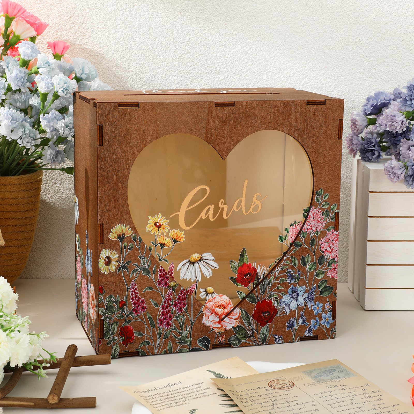 - DELICATE DESIGN: The wedding card box with heart shaped acrylic window, patterned with colorful wildflowers against the natural wood background, vintage and charming, adding a touch of romance and sophistication to your wedding decor