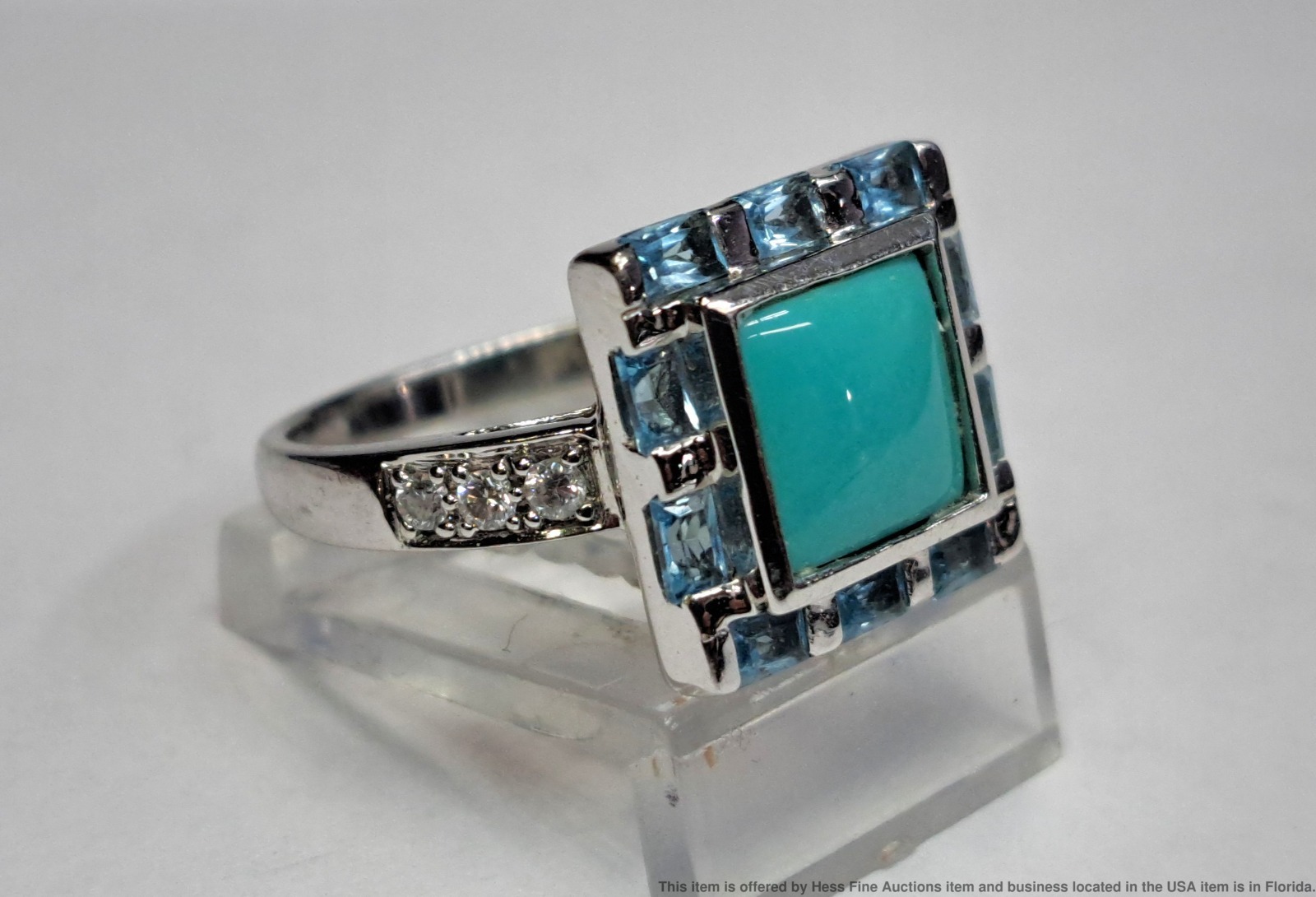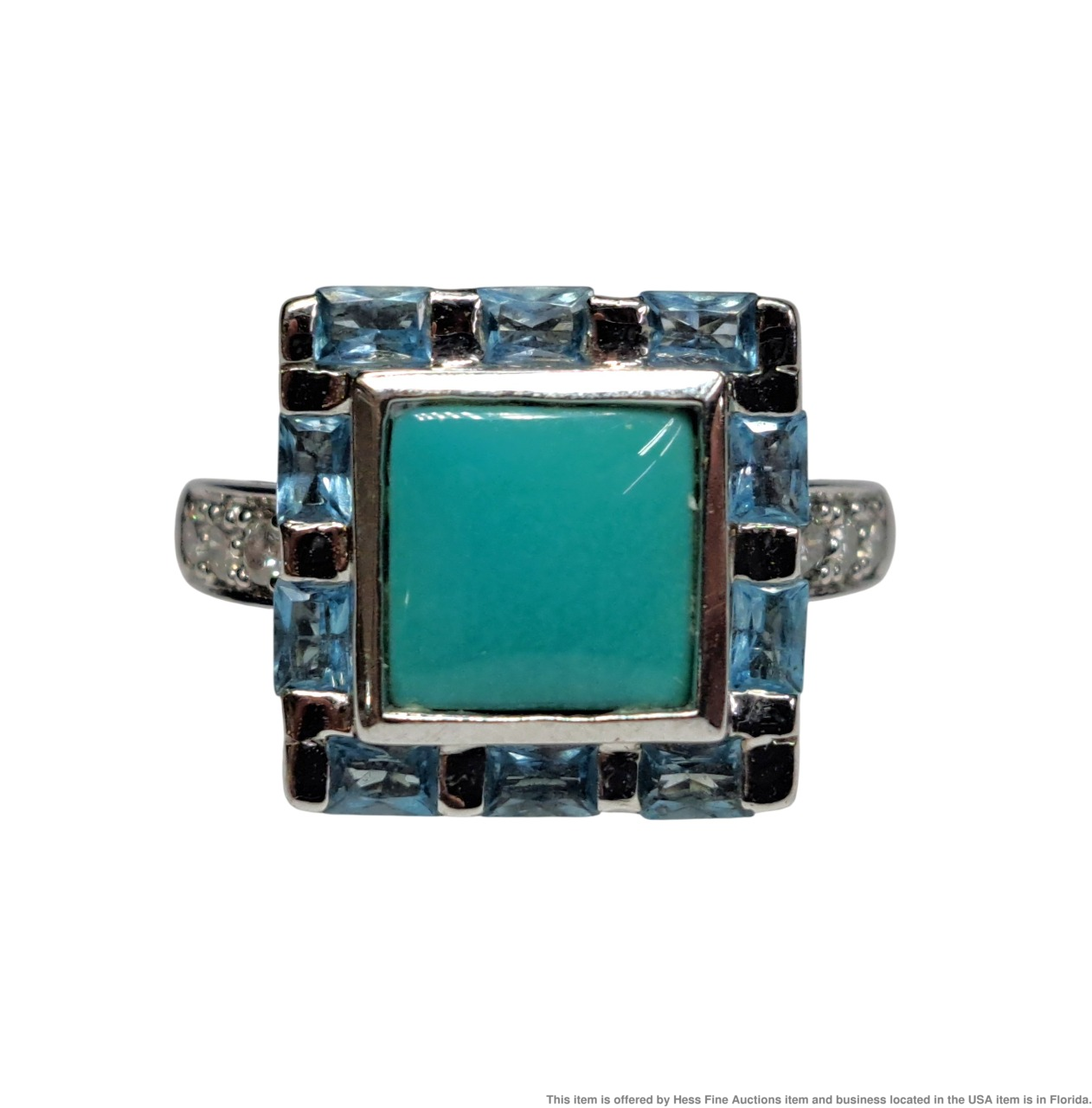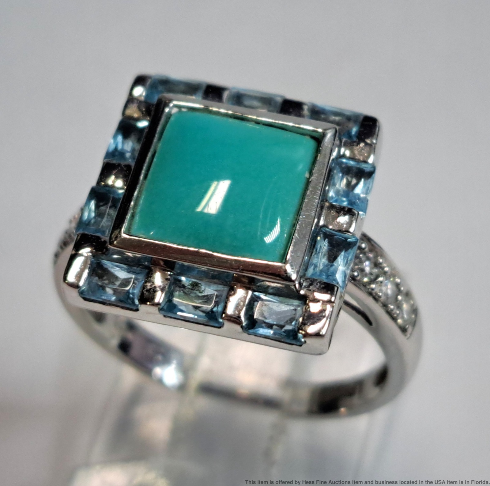 - Described & Photographed By: Mike NOTG 70825 Title: Le Vian 2.22ctw Diamond Topaz Turquoise 14k White Gold Ladies Ring Description: Beautiful! Make it yours today. Happy bidding! Here are the specifications Please note; all stones graded, measured & calculated while mounted Type of Jewelry: Ring Gemstones: Diamond, Topaz, Turquoise Approx. Measurement or Weight of Stones: Six round cut 1.5mm Diamonds totaling approx. .09cts Ten emerald cut 3x2mm Topaz totaling approx. .58cts One princess cut 7mm Turquoise totaling approx. 1.55cts Total gem weight approx. 2.22ctw Clarity: SI1-SI2 Color: E-G Mounting Metal: 14k White Gold Approx. Size or Length: 7 Stamps or Factory Markings: 14k, Levian Total Weight of Item: 5.2 grams Condition: Gold shows very minor toning and wear. All stones well secure and intact. Estimated size of package: 7.5in X 5.5in X 3.5in Estimated total weight of package: 8 oz Please Note: If the winning bidder would like to arrange to pick up their item at our store then please notify us by email & we will make the appropriate shipping adjustments.