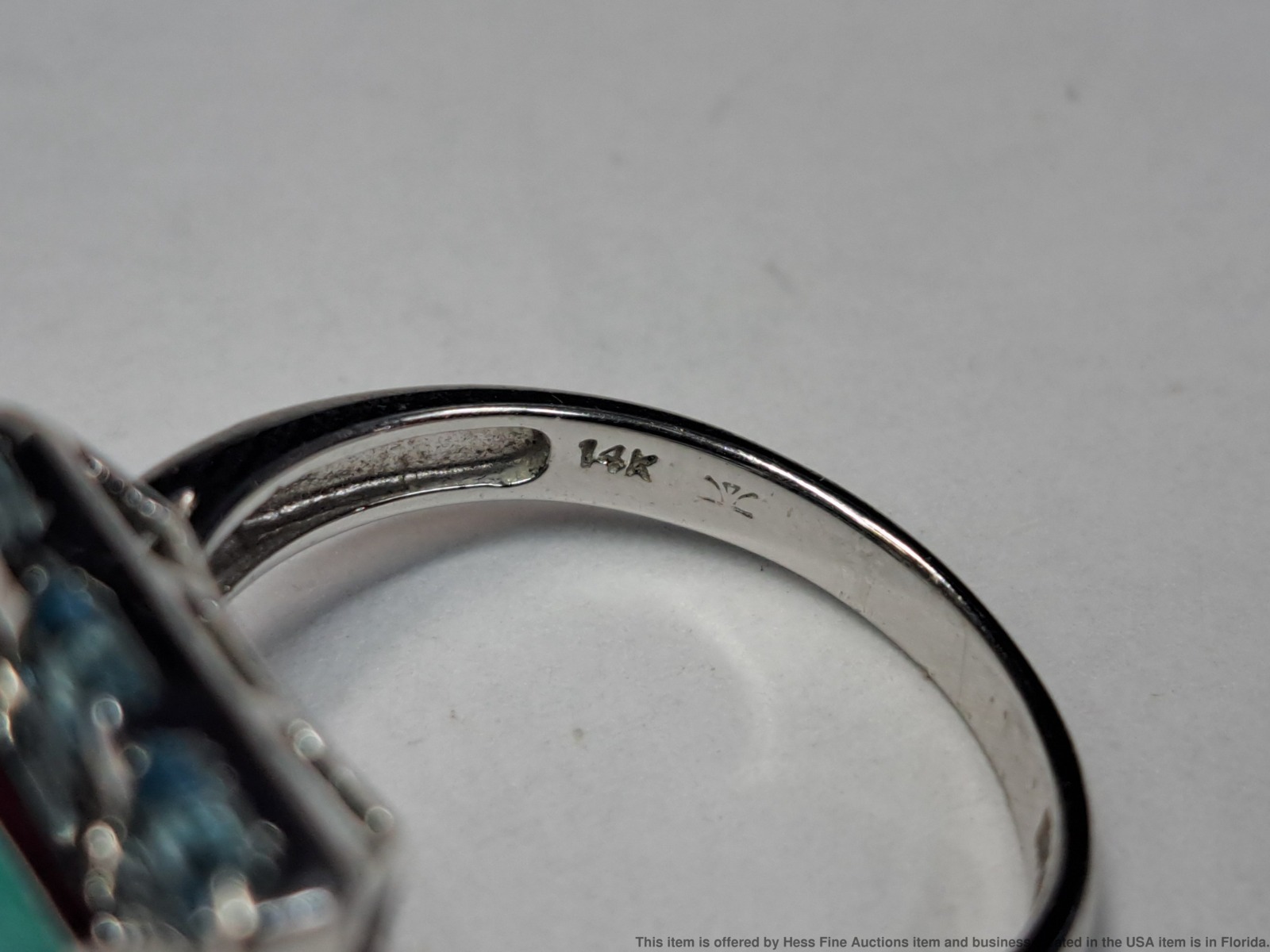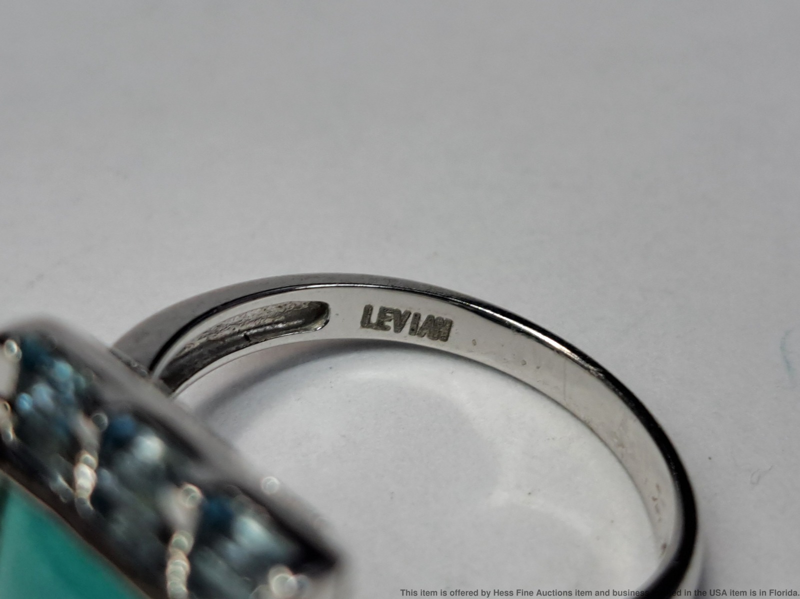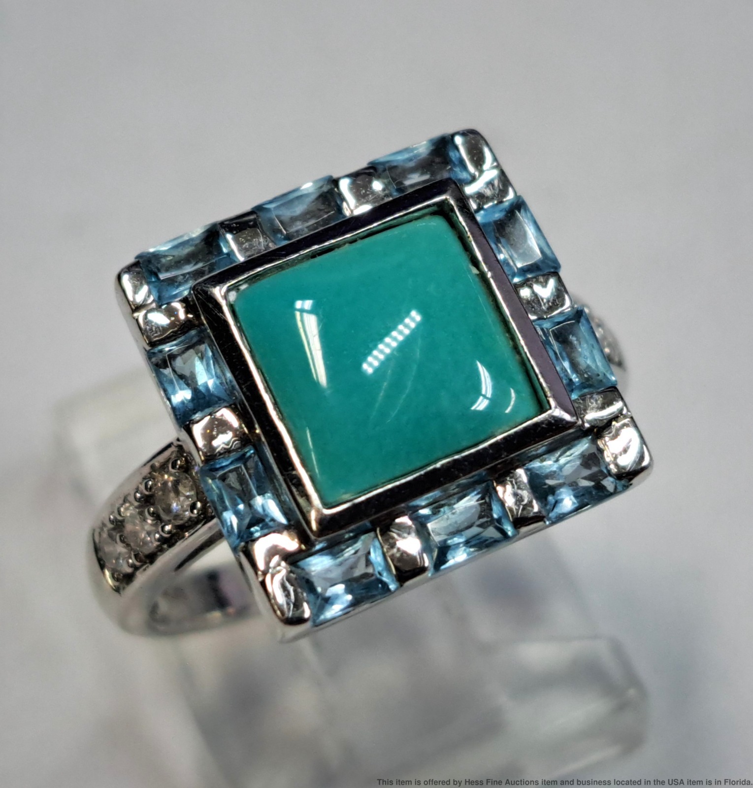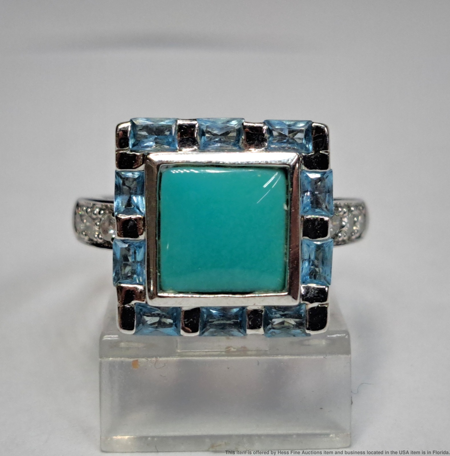 - Described & Photographed By: Mike NOTG 70825 Title: Le Vian 2.22ctw Diamond Topaz Turquoise 14k White Gold Ladies Ring Description: Beautiful! Make it yours today. Happy bidding! Here are the specifications Please note; all stones graded, measured & calculated while mounted Type of Jewelry: Ring Gemstones: Diamond, Topaz, Turquoise Approx. Measurement or Weight of Stones: Six round cut 1.5mm Diamonds totaling approx. .09cts Ten emerald cut 3x2mm Topaz totaling approx. .58cts One princess cut 7mm Turquoise totaling approx. 1.55cts Total gem weight approx. 2.22ctw Clarity: SI1-SI2 Color: E-G Mounting Metal: 14k White Gold Approx. Size or Length: 7 Stamps or Factory Markings: 14k, Levian Total Weight of Item: 5.2 grams Condition: Gold shows very minor toning and wear. All stones well secure and intact. Estimated size of package: 7.5in X 5.5in X 3.5in Estimated total weight of package: 8 oz Please Note: If the winning bidder would like to arrange to pick up their item at our store then please notify us by email & we will make the appropriate shipping adjustments.