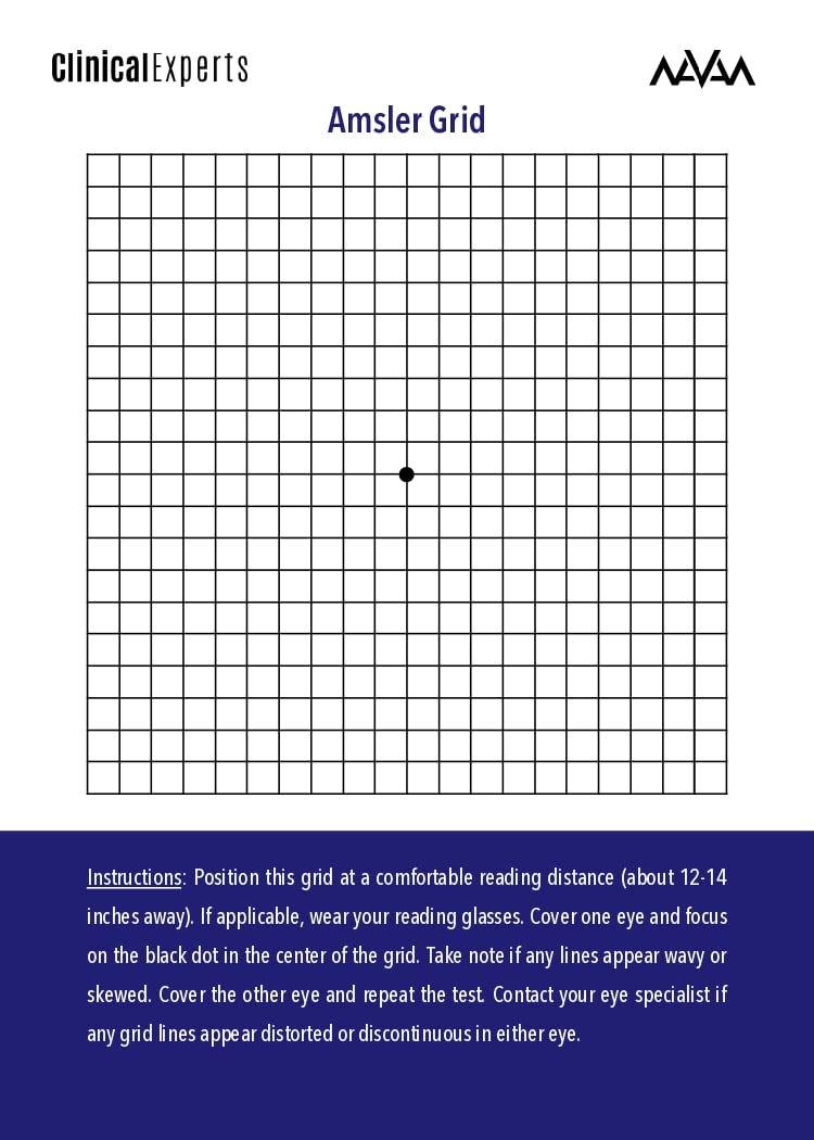 AMSLER EYE GRID DAILY SCREENING TOOL INSTRUCTIONS - If applicable, wear your reading glasses. Cover one eye and focus on the black dot in the center of the grid. Take note if any lines appear wavy, distorted, or missing. Cover the other eye and repeat the test. Contact your eye specialist if the grid lines do not appear perfectly straight and continuous.