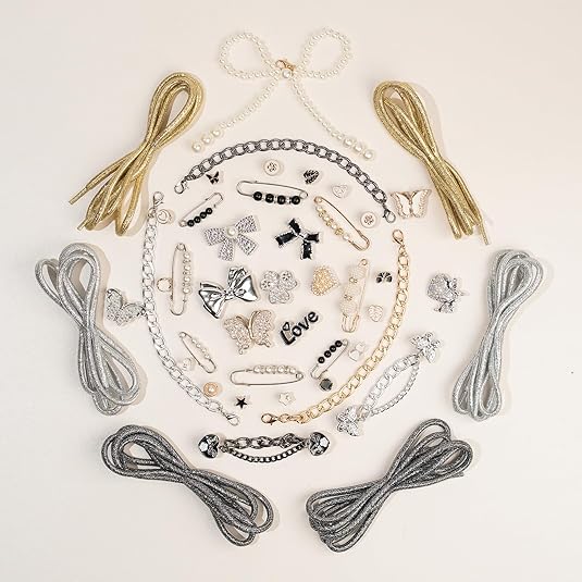 - "[Unique Shoe Charm Set] This set showcases 25 meticulously chosen small accessory charms, including an array of jewelry, pearl pins, shoe chains, and 2 pairs of shoelaces. With safety pins for clothes, brooches for women, hat pins, and junk charms, it caters to all your decorative desires. The set also includes charming bag charm elements."