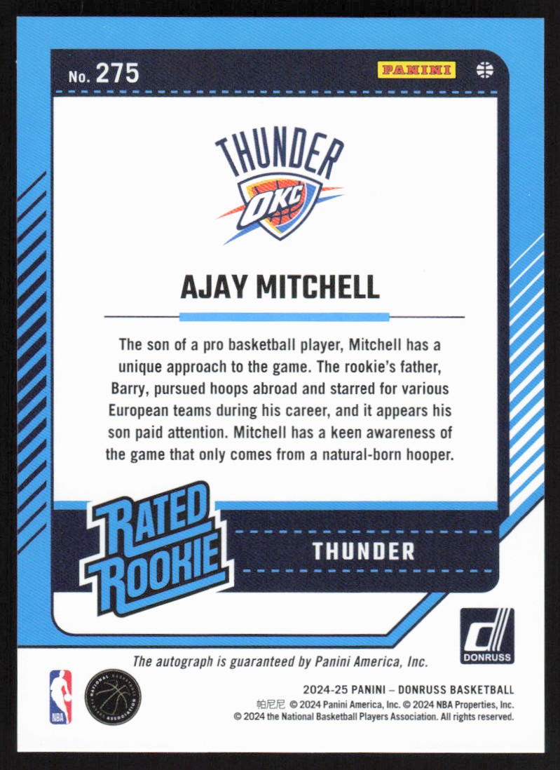 | 2024-25 DONRUSS RATED ROOKIES CHOICE SIGNATURES AJAY MITCHELL RC AUTO OKLAHOMA |