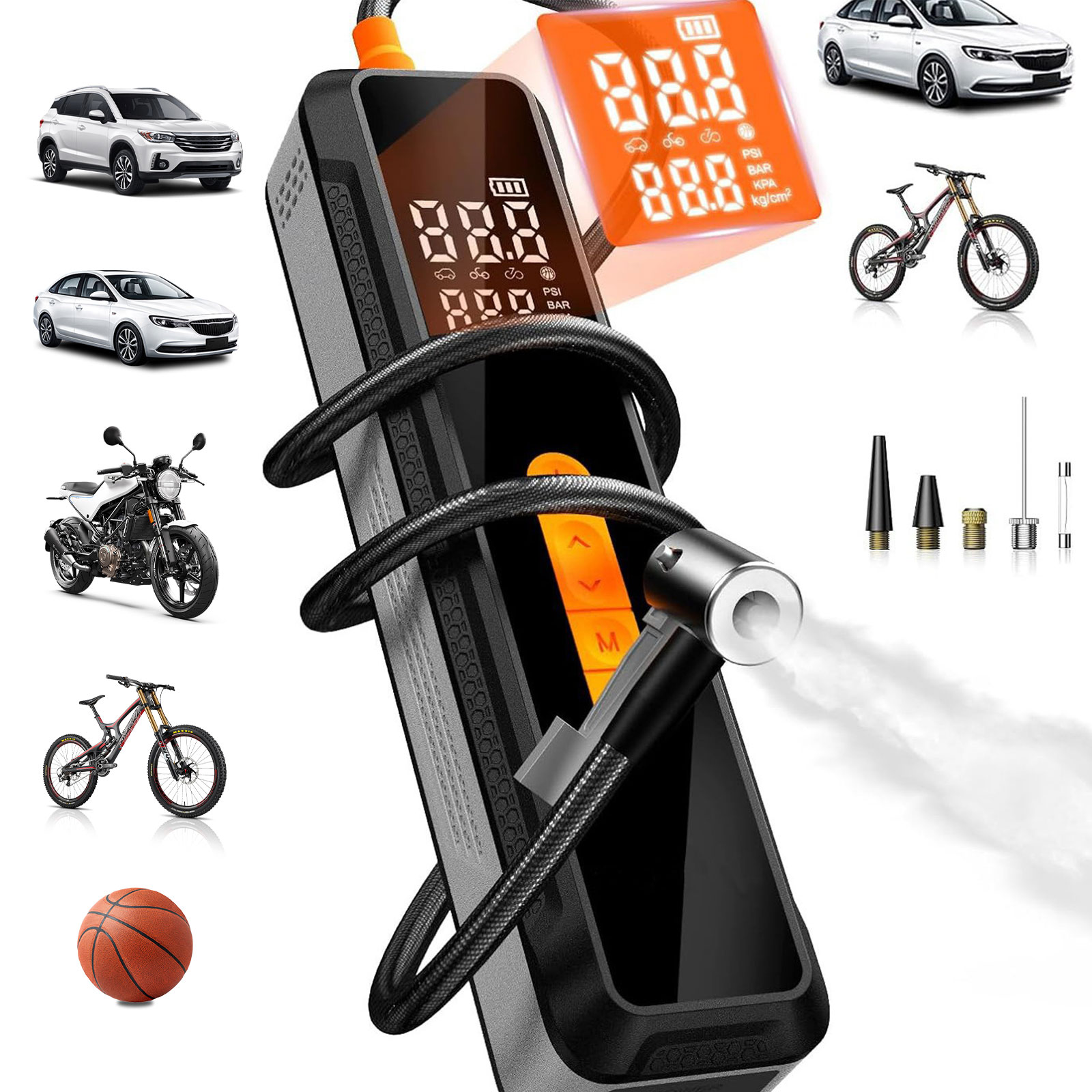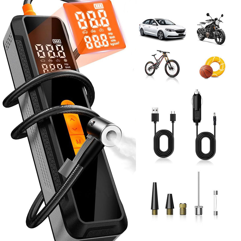 【Multiple Inflation Modes】This portable compressor features 4+N intelligent modes, perfect for cars, bicycles, motorcycles, and sports balls. Simply set the desired pressure – the pump automatically stops once reached.