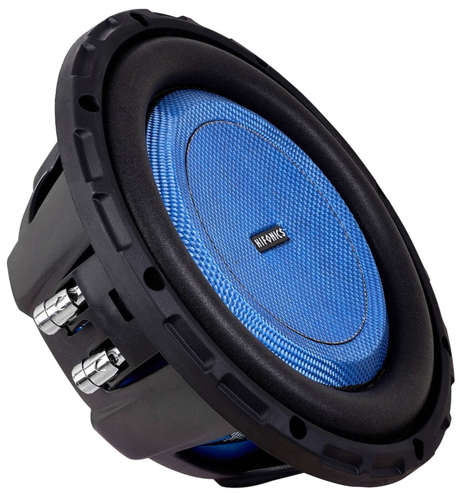 Hifonics HEW8D4S ELITE 500 Watt 8 inch shallow mount subwoofer with dual 4 ohm 2 inch voice coils, lightweight woven fiber cone, vented aluminum former and butyl surround. Less than 3 inches mounting depth.
