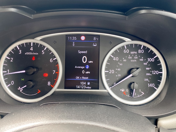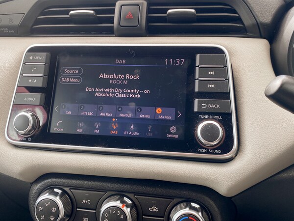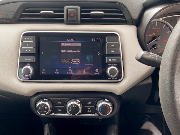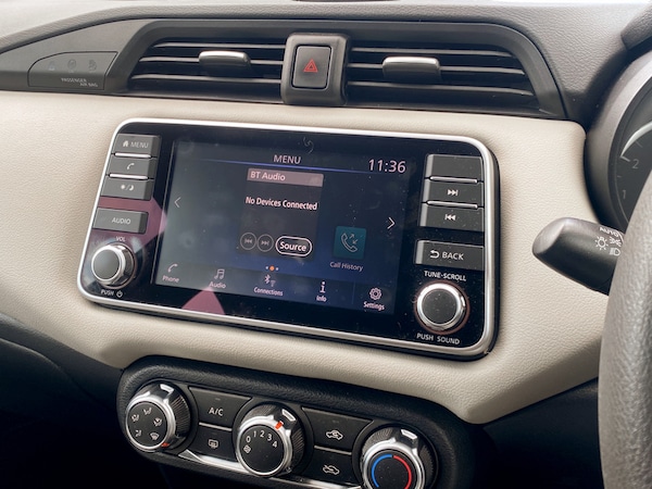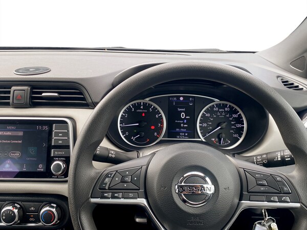 ..Adjustable speed limiter, Advanced drive assist display 5'' TFT coloured screen, Bluetooth system, Cruise control, Lane departure prevention, Lane departure warning system, Nissan connect display audio, Outside temperature gauge, Power assist steering, Smartphone integration with Apple CarPlay and Android auto, Stop/start system, Traffic sign recognition, Trip computer, 4 speakers, Audio system with MP3, DAB Digital radio, Steering wheel mounted audio controls, USB/iPod connection, 4 pocket halogen headlights with signature finisher, Antenna, Automatic activation of hazard warning lights, Automatic headlights, Body colour front door handles, Body coloured bumpers, Body coloured door mirrors, Concealed rear door handles, Door mirror integrated indicators, Electrically adjustable door mirrors, Front fog lights, High beam assist, High mounted stop lamp, Jacknife key type x1, LED daytime running lights, Power front windows, Rain sensor windscreen wipers, Rear roof spoiler, Rear wiper with reverse link, 12V power point front, 2 height adjustable rear headrests, 3 cupholders, 60/40 split folding rear seat, Boot compartment cover, Boot light, Casual cloth upholstery, Chrome interior door handles, Driver's seat manual height adjust, Driver/passenger sunvisors and vanity mirrors, Front and rear door pockets with bottle holders, Front console storage box, Gear shift indicator, Grey PVC front door pads, Height adjustable front headrests with satin sliver decoration, Illuminated electric window switch, Isofix front passenger and rear seat preparation, Manual air conditioning, Map reading lamp, Parcel shelf, Passenger seat back pocket, Reclining front seats, Satin silver accents on steering wheel, Satin silver air vents, Silver gearknob, Soft knee pad with stitching, Soft touch upper IP with grey PC Insert, Tilt/telescopic adjustable steering wheel, ABS+EBD+Brake assist, Crash sensor, Driver/Front Passenger airbags, Front and rear curtain airbags, Front side airbags, Height adjustable front seatbelts with pre-tensioners and load limiters, Hill start assist, Intelligent emergency braking with pedestrian recognition, Manual passenger airbag deactivation function, Rear seatbelts with pre-tensioners and load limiters, Seatbelt warning, Three 3 point rear seatbelts, Tyre pressure monitoring system, Warning triangle and first aid kit, Anti-theft immobiliser, Remote central locking, 16'' alloy wheels, Tyre repair kit