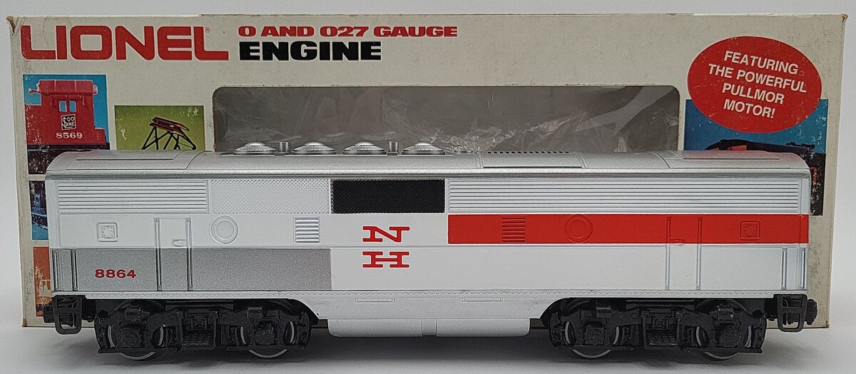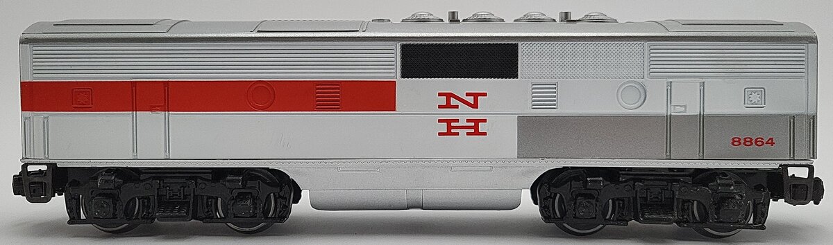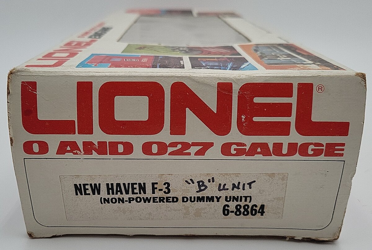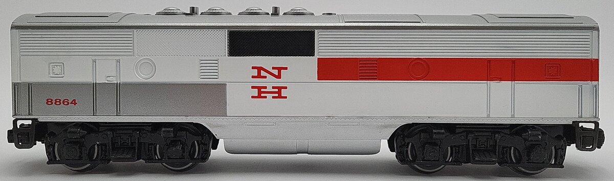 Here is a Lionel 6-8864 O Gauge New Haven F3 Non-Powered B-Unit Diesel Engine. It features die-cast metal trucks, die-cast metal fixed couplers, and metal wheels and axles. It measures 12 inches long. It matches the 8851 and 8852 F3 AA Diesels made in the same year.