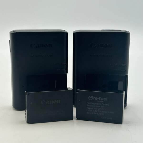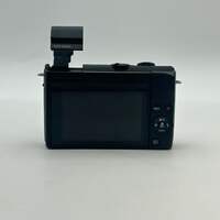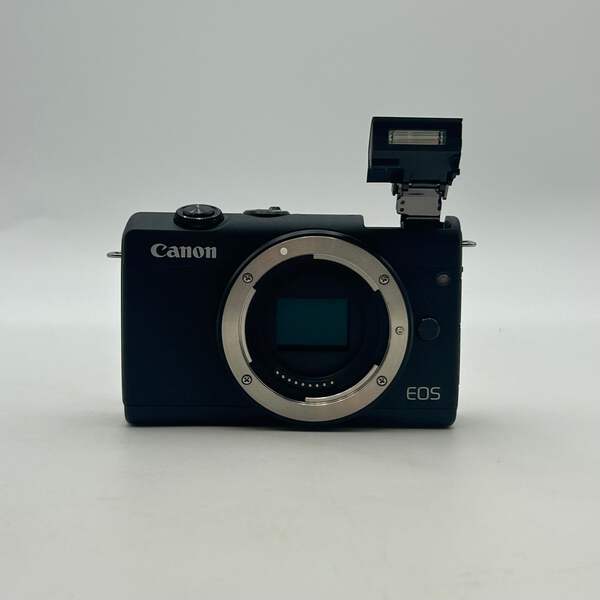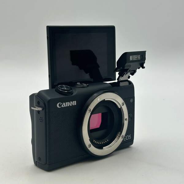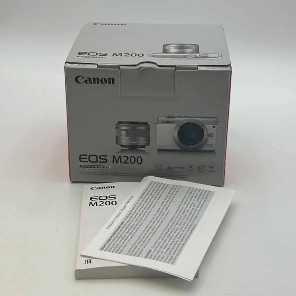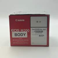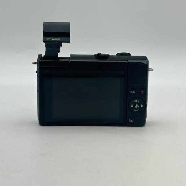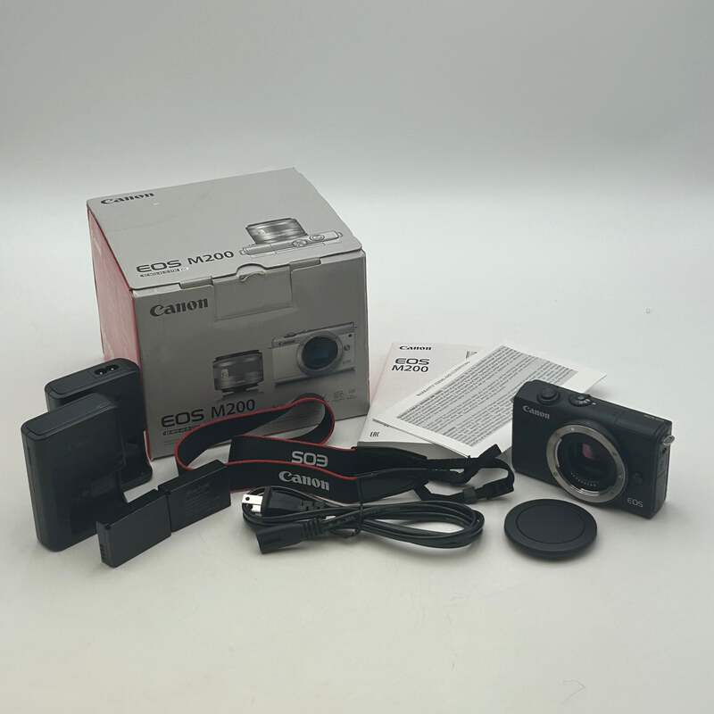 Offered here is a Canon EOS M200 digital camera in black, listed in Uséd - A condition. This camera includes a charger, 2 batteries, and a wrist strap. The lens is in excellent condition and free from scratches, smudges, or other imperfections, helping provide a sharp and clear image. The flash is functional and works as intended for low-light photography.
