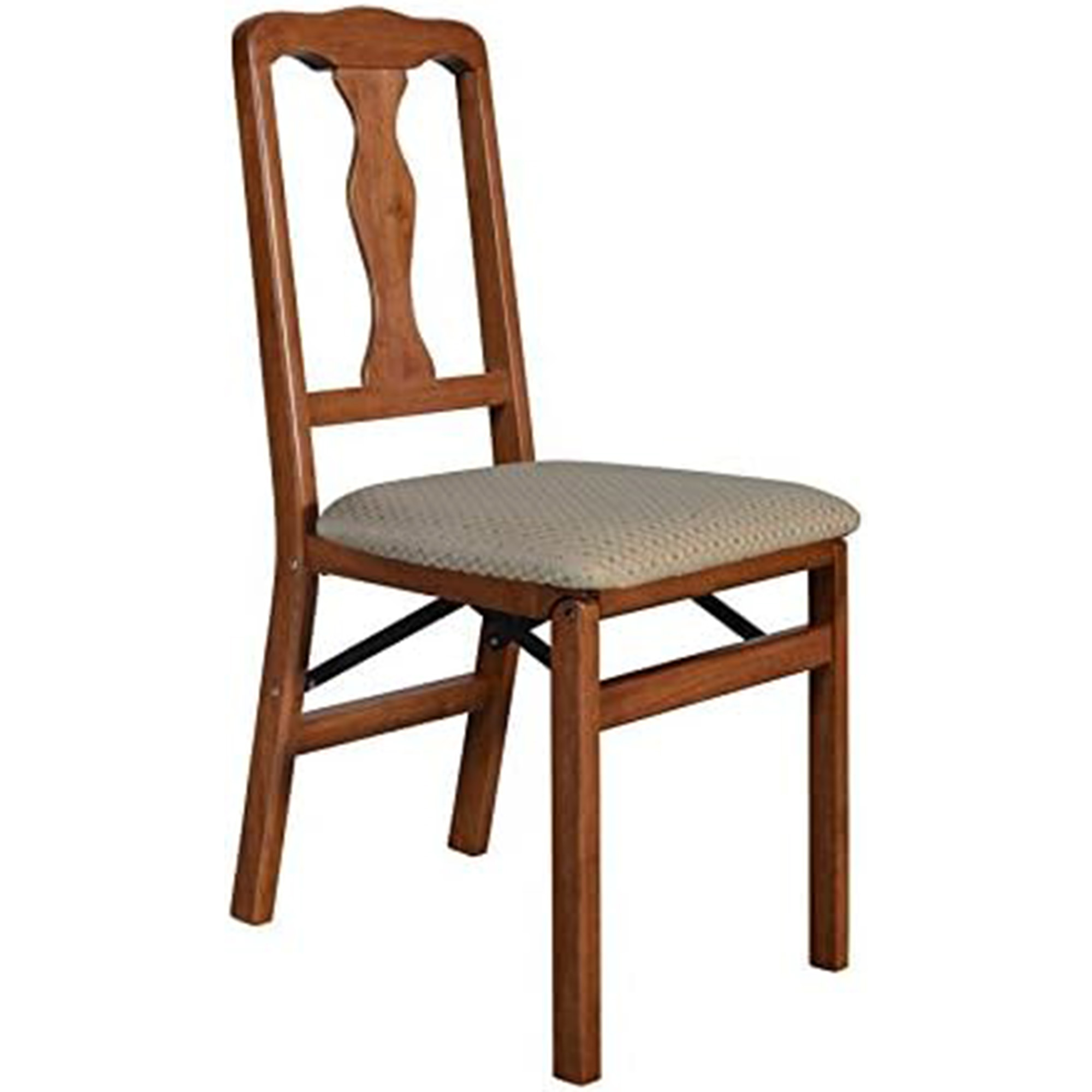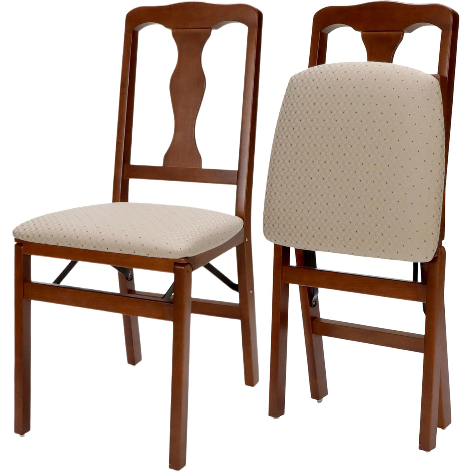 Featuring an elegant back design that adds sophistication to any setting, this set of 2 Queen Anne Folding Chairs by Stakmore offers a timeless design with practical functionality.