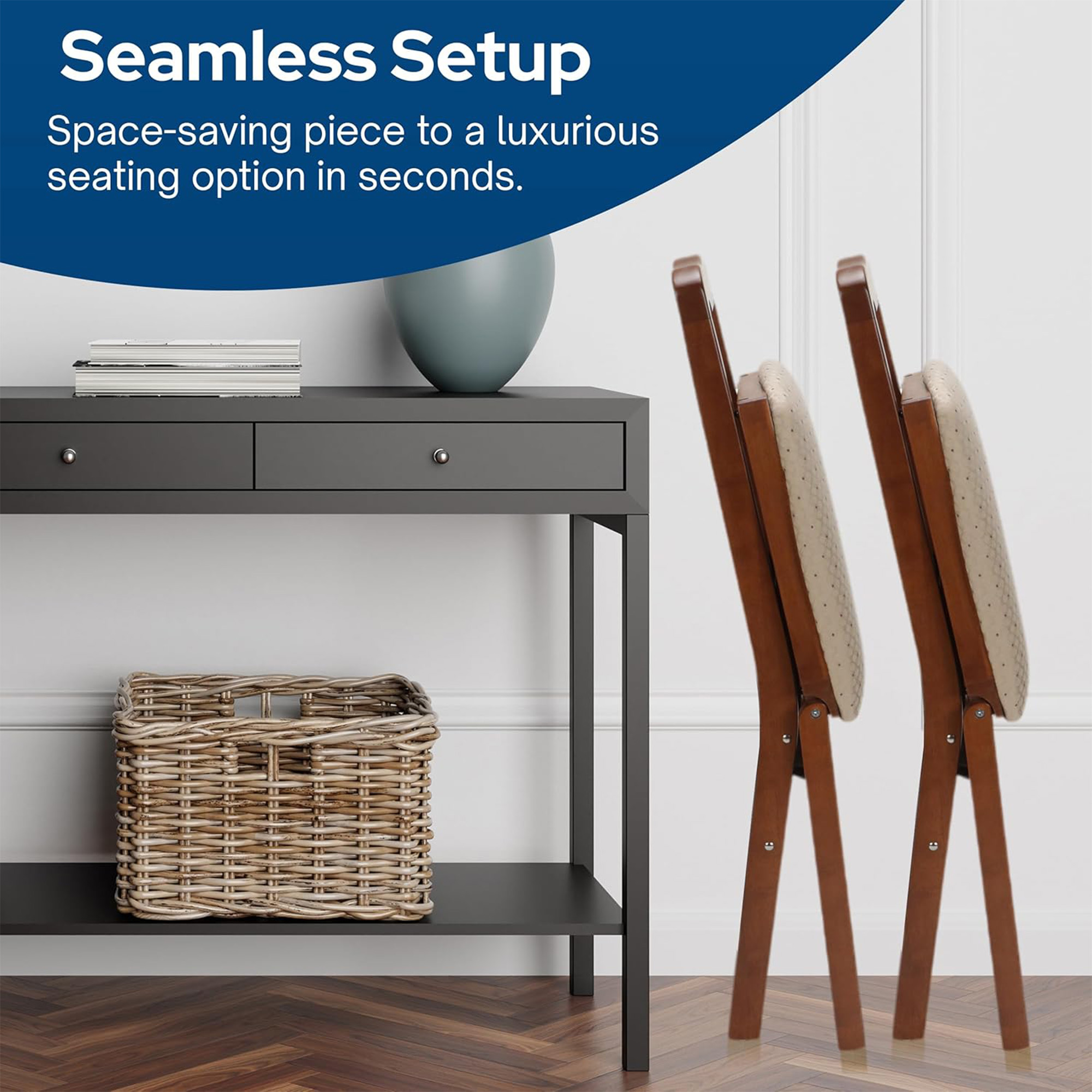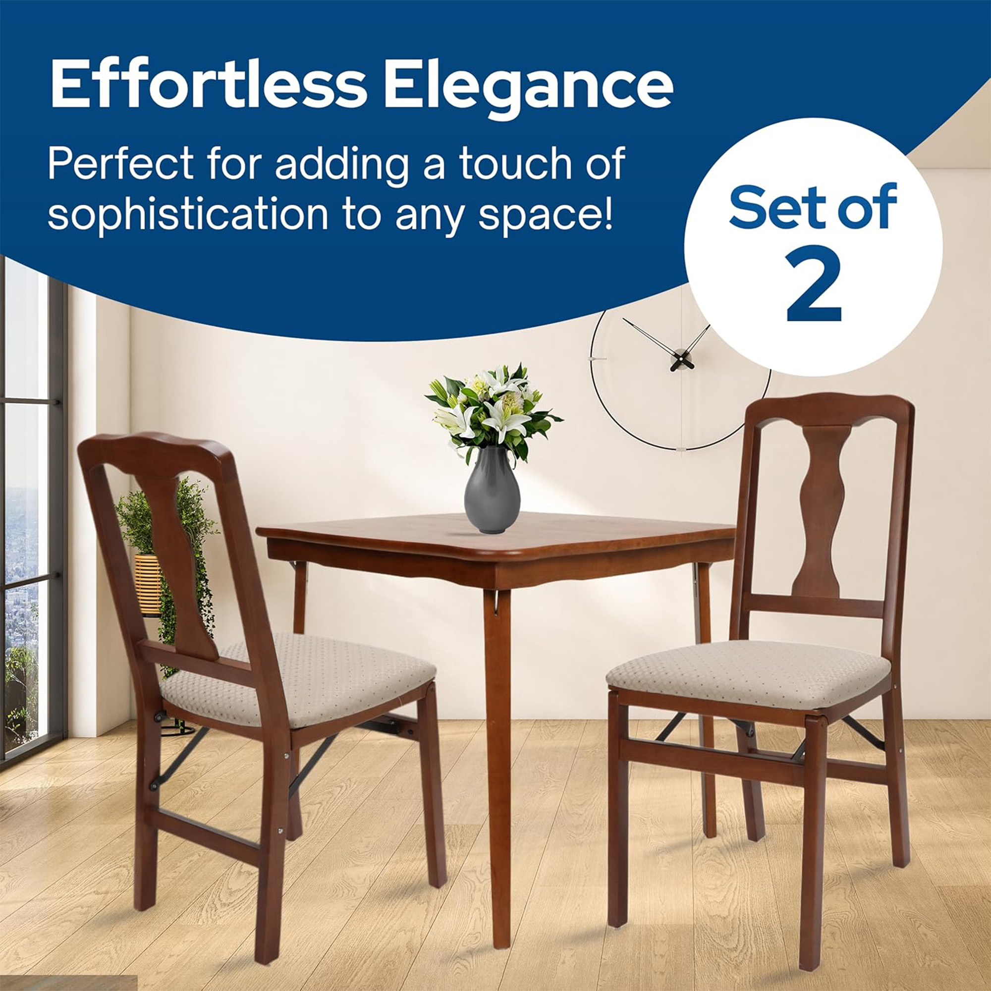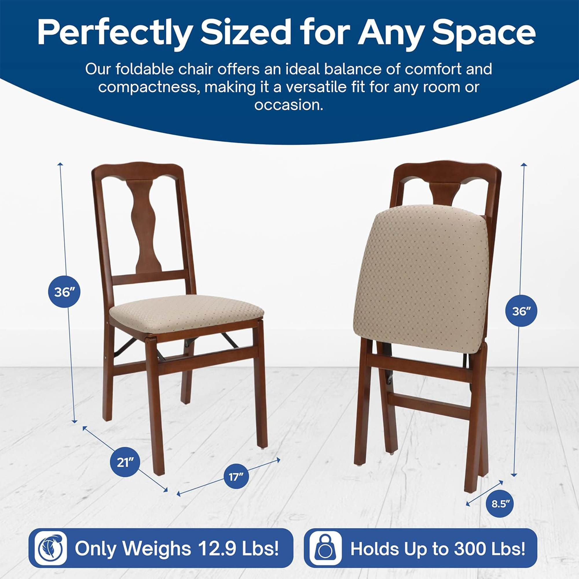 When not in use, the chairs conveniently fold down to a slim 8.5-inch depth, allowing for easy storage in closets or tight spaces. Their compact design makes them a space saving for apartments, kitchens, offices, or any room where space is limited. They arrive fully assembled, so you can enjoy the chairs right out of the box without any setup required.