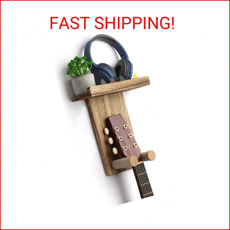 Keebofly Guitar Wall Mount Hanger with Rustic Wood Shelf- Single Pack, Wall Hook Rack for Acoustic/Electric Guitars, Bass & Ukulele, (Brown,Patented)