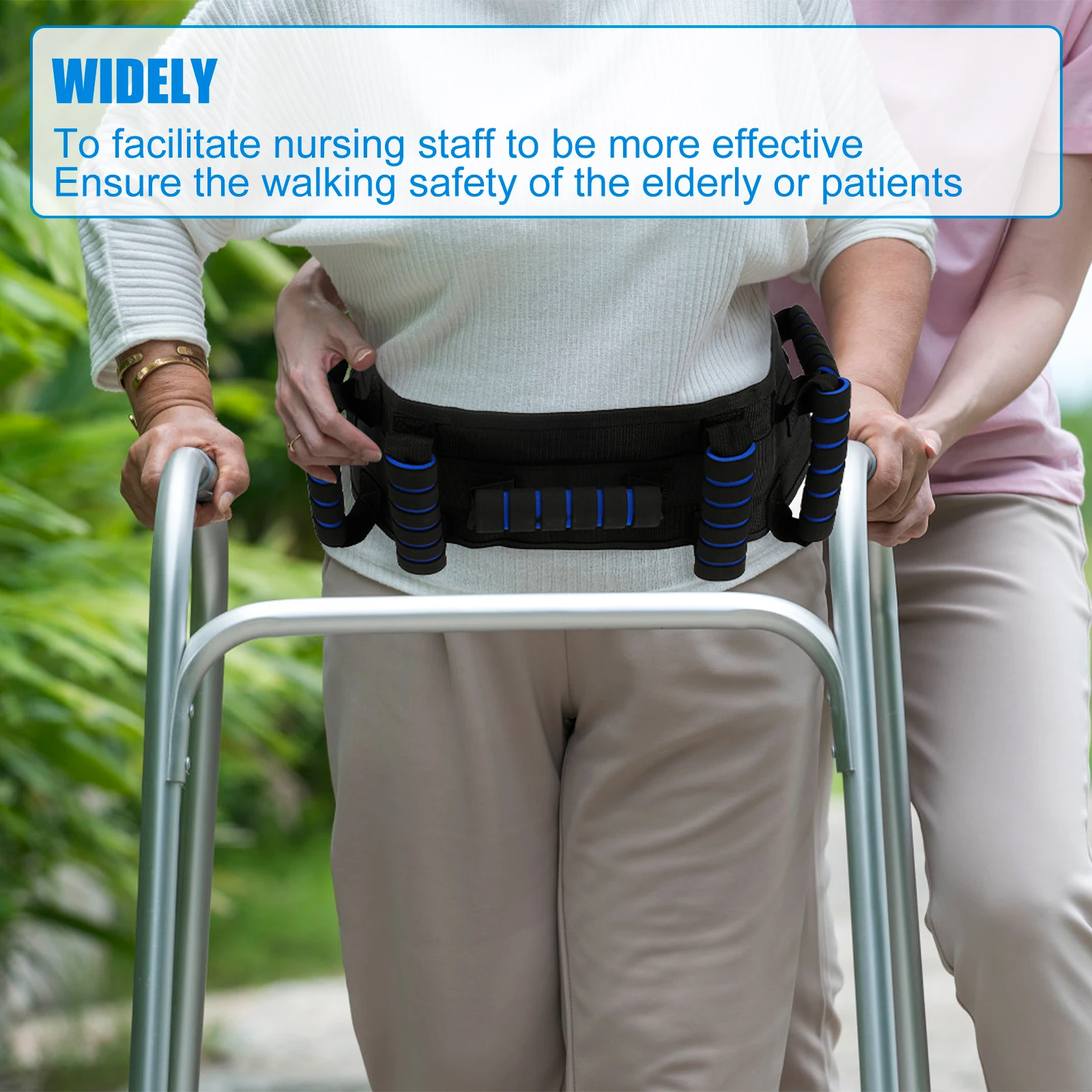 [Premium Material] This gait belt consists of a premium polyester and nylon webbing, a plastic buckle and a soft and comfortable EVA nonslip handle. The stitching has been reinforced to ensure that it can withstand the rigorous test of load bearing and has excellent endurance, stability and reliability.