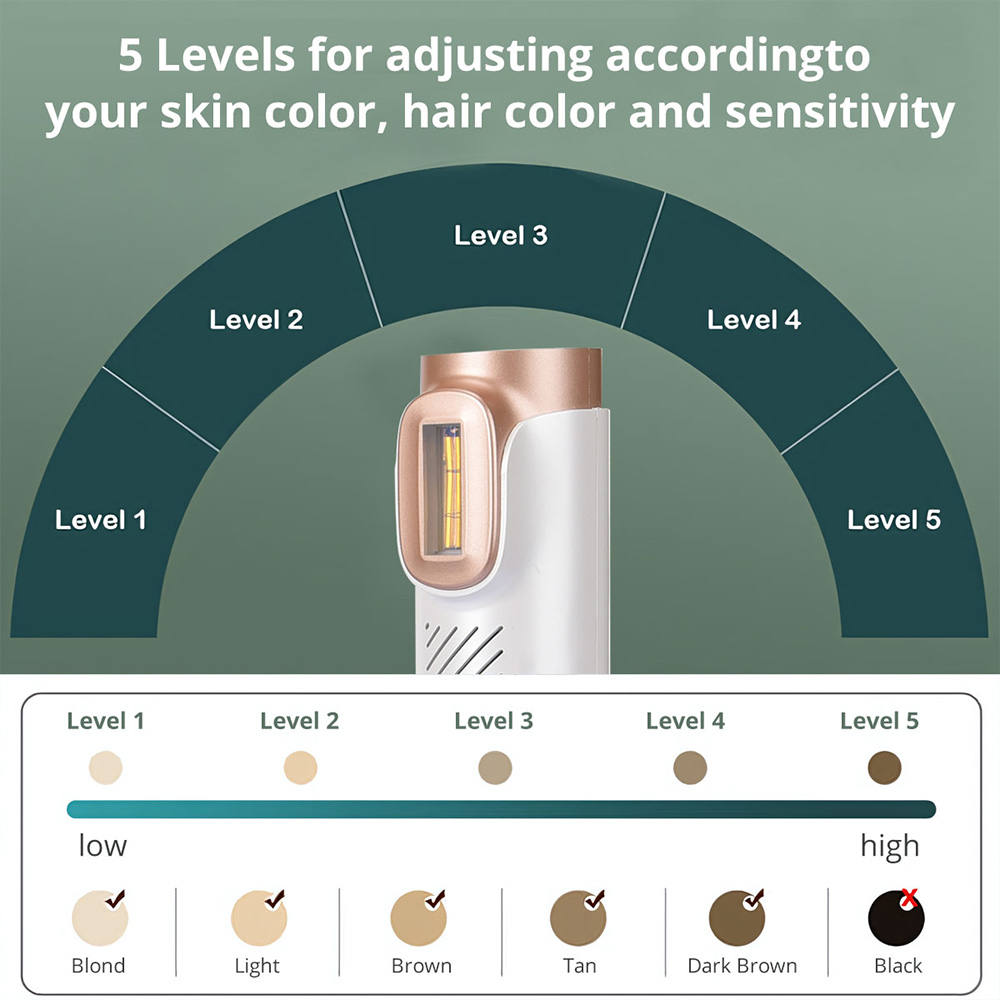 π5 Energy Levels & 2 Flash Modes: Our hair removal device offers 5 adjustable energy levels and 2 modes - Auto for large areas like arms and legs, and Manual for precision on smaller areas such as armpit, bikini line and face. Enjoy full body hair removal in just 8 minutes