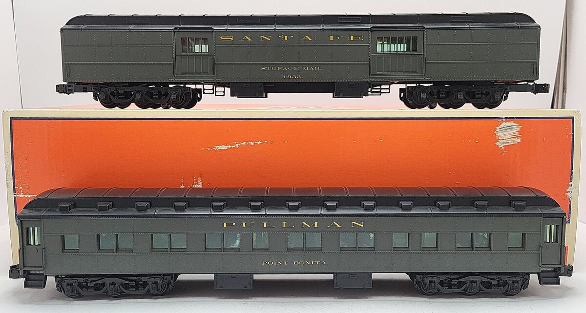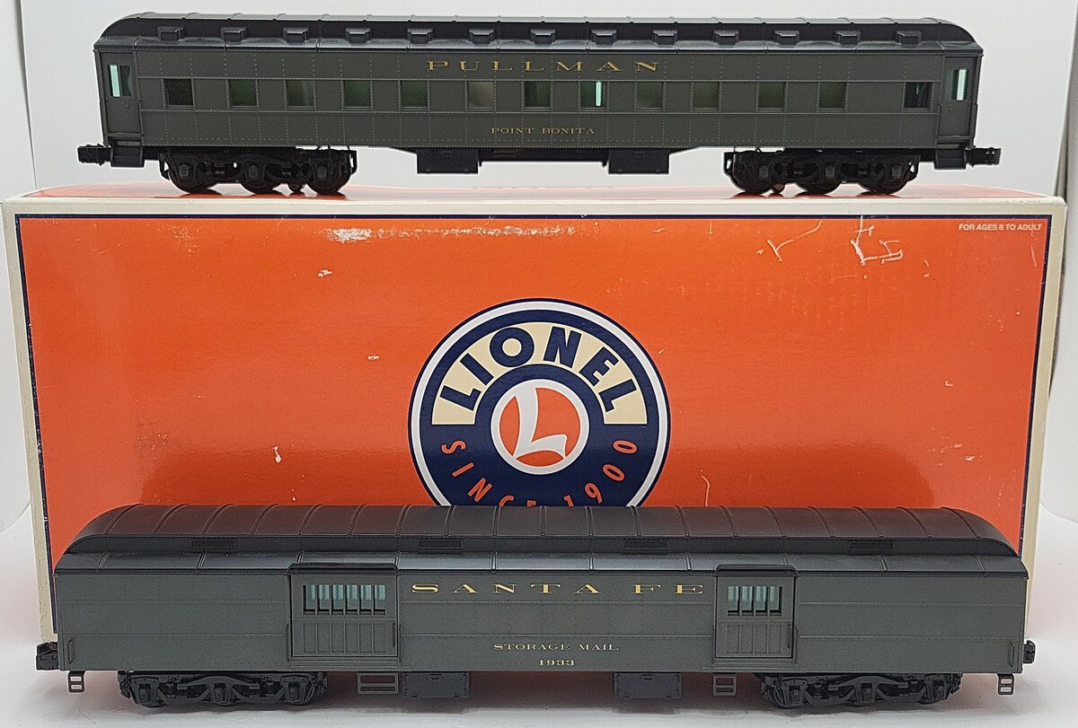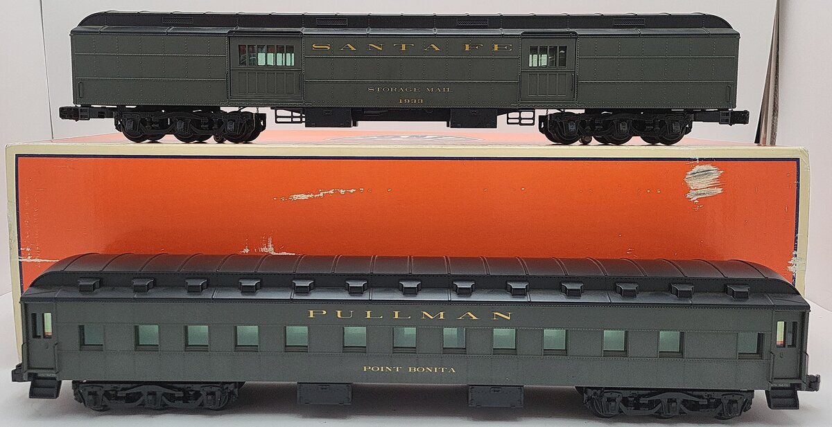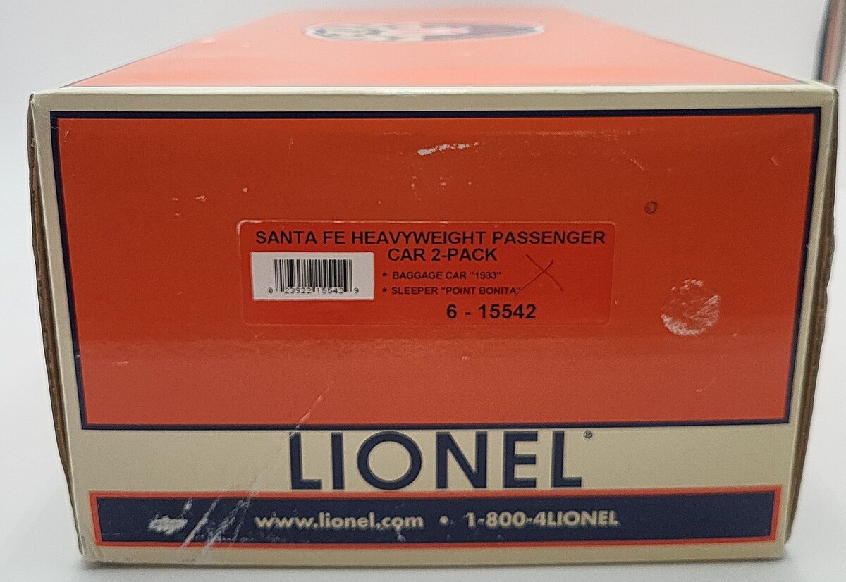 Here is a Lionel 6-15542 O Gauge Santa Fe Heavyweight Passenger Car Set. These cars feature all-new die-cast metal sprung trucks and operating couplers with hidden uncoupling tab, metal frames, authentically detailed and painted interiors, interior lighting with ON/OFF control, opening doors, passenger and train crew figures, and flexible diaphragms between cars.