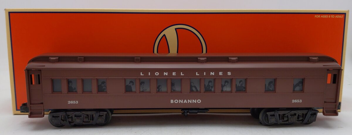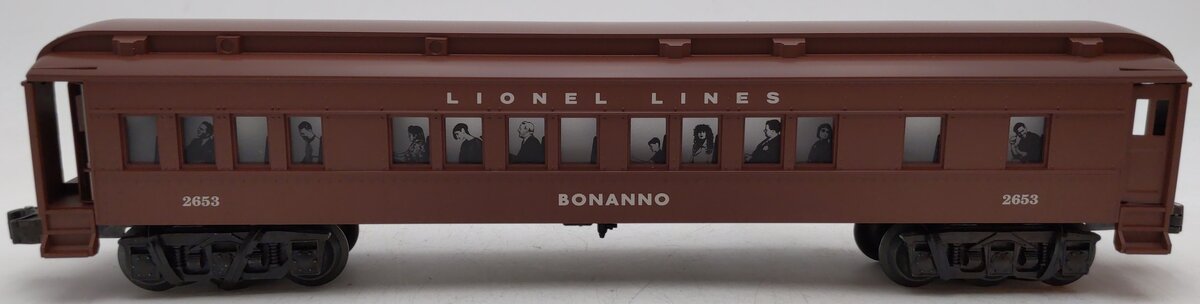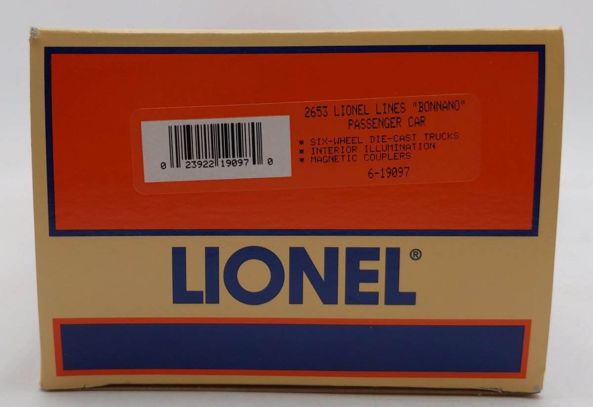 Here is a Lionel 6-19097 O Gauge "Bonanno" Lionel Lines Passenger Car #2653. It features illuminated interior, six-wheel passenger trucks and two operating couplers.