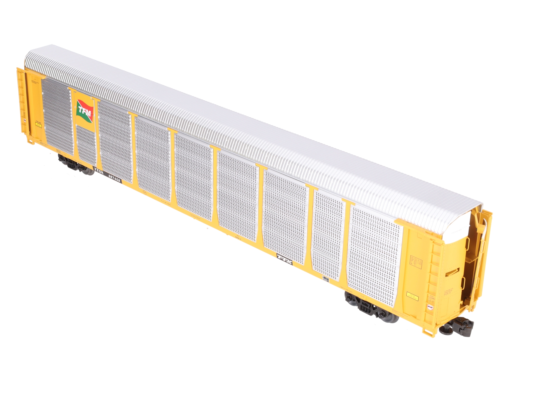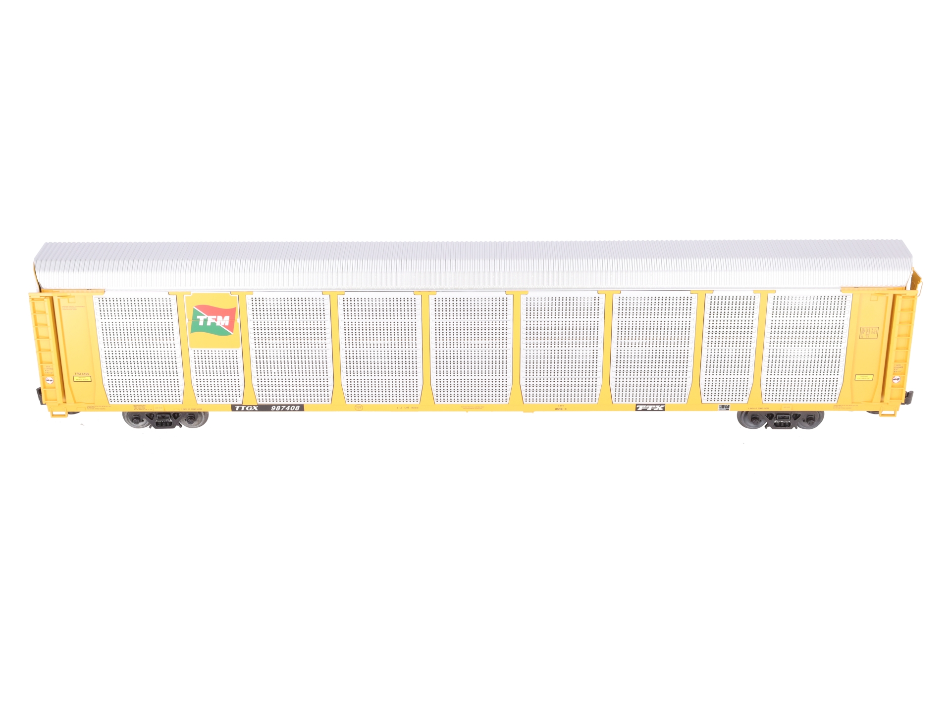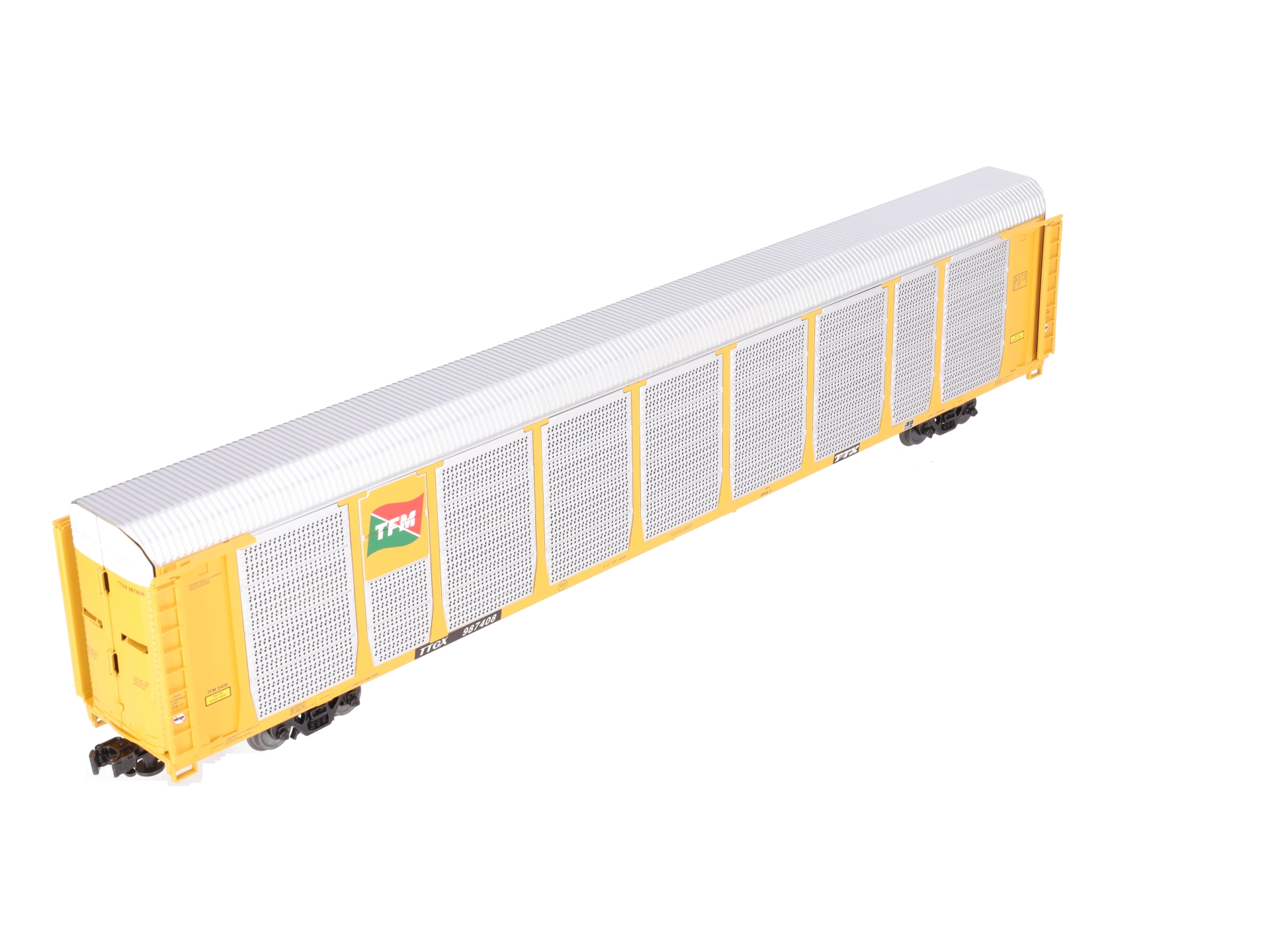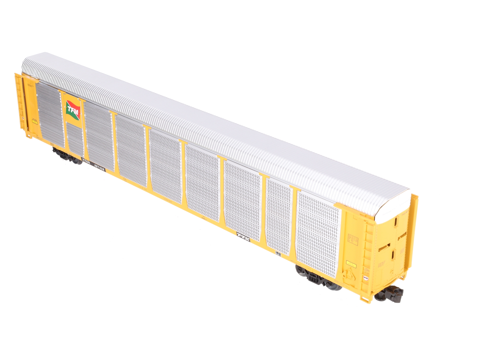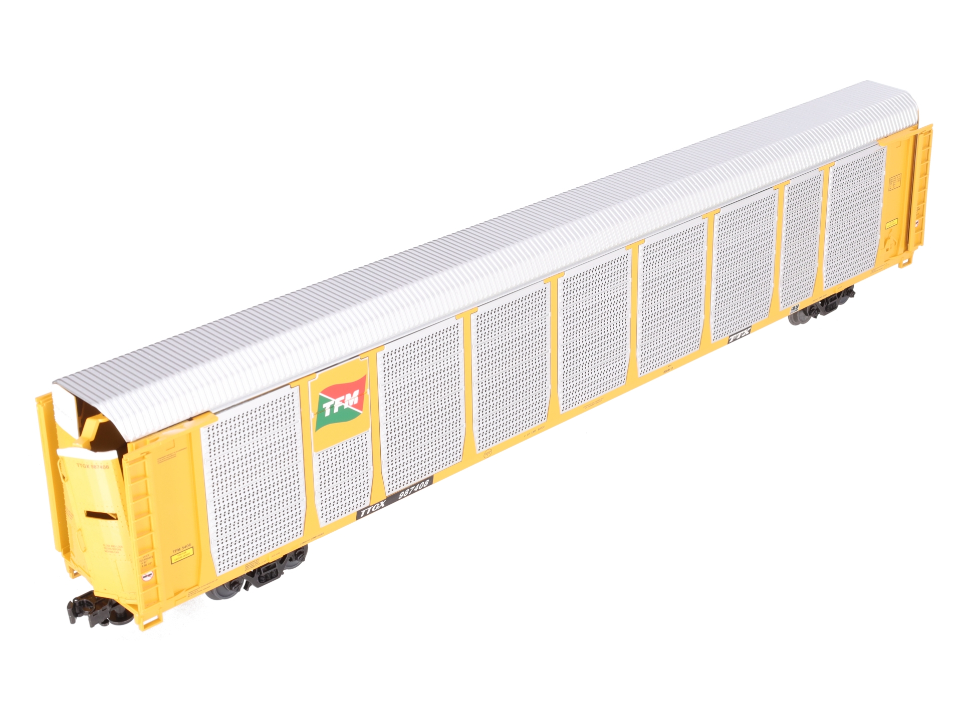 This is a Lionel 6-82504 O Gauge Transportacion Ferroviaria Mexicano 89' Auto Carrier Rack #987408. Modern fully enclosed autoracks protect their valuable loads on their first trip after the assembly line. The cars from many railroad companies are regularly mixed together for colorful consists. Features includes accurate 1:48 scale design, die-cast metal sprung trucks and operating couplers, opening doors at both ends, Bi-level rack in interior, die-cast operating kinematic couplers for close coupling on straightaways and auto adjusting couplers for operation on curves.