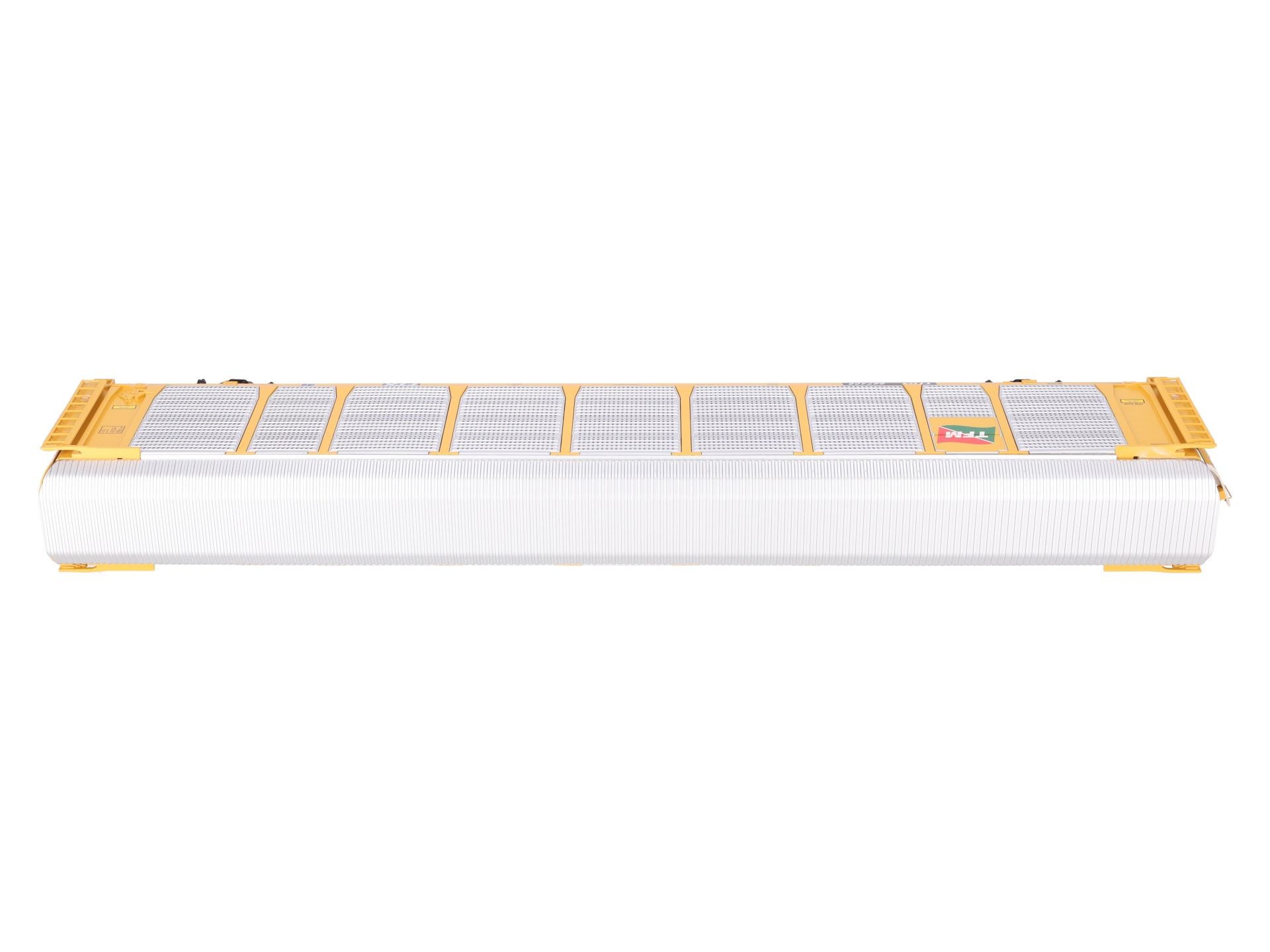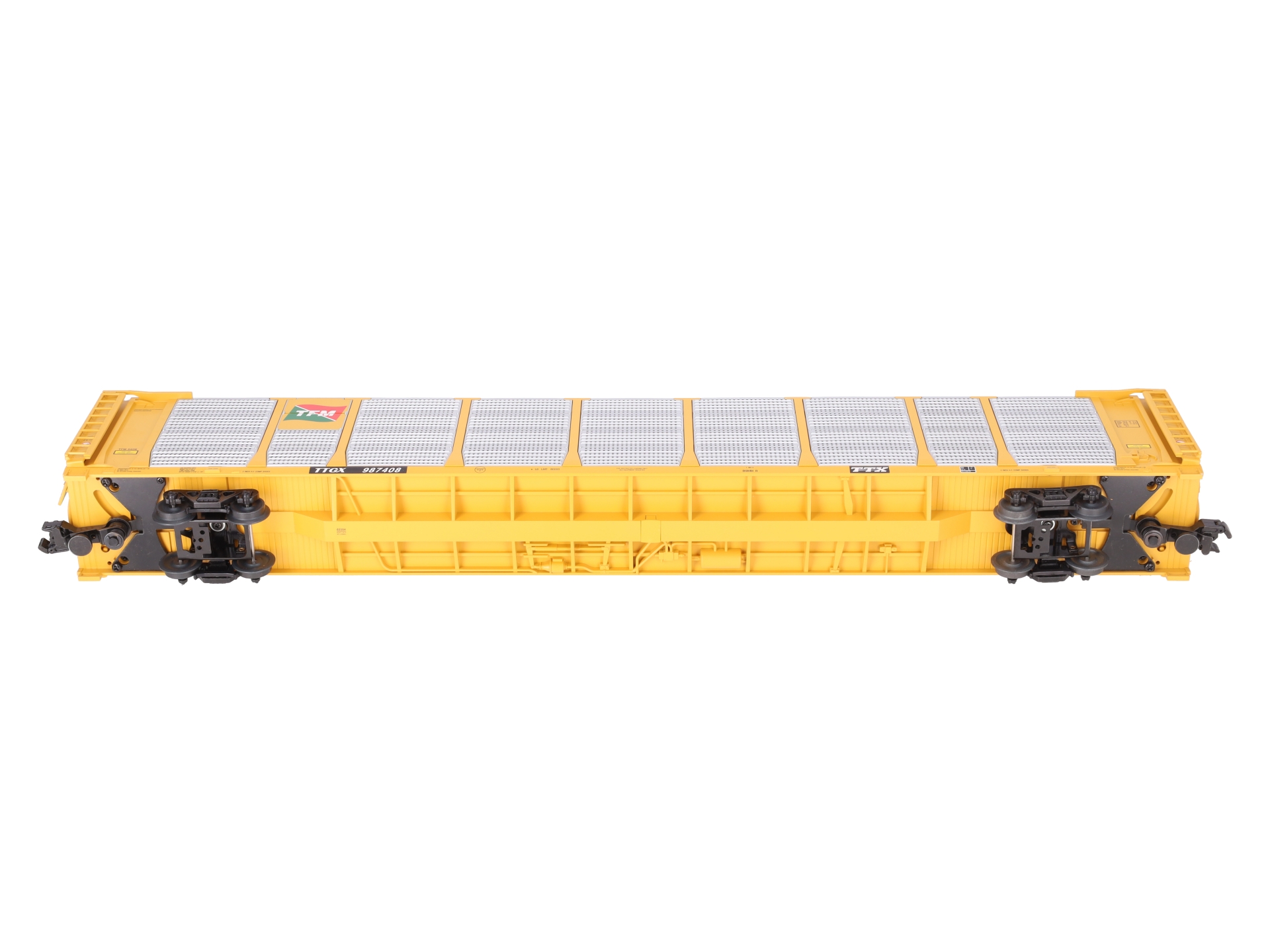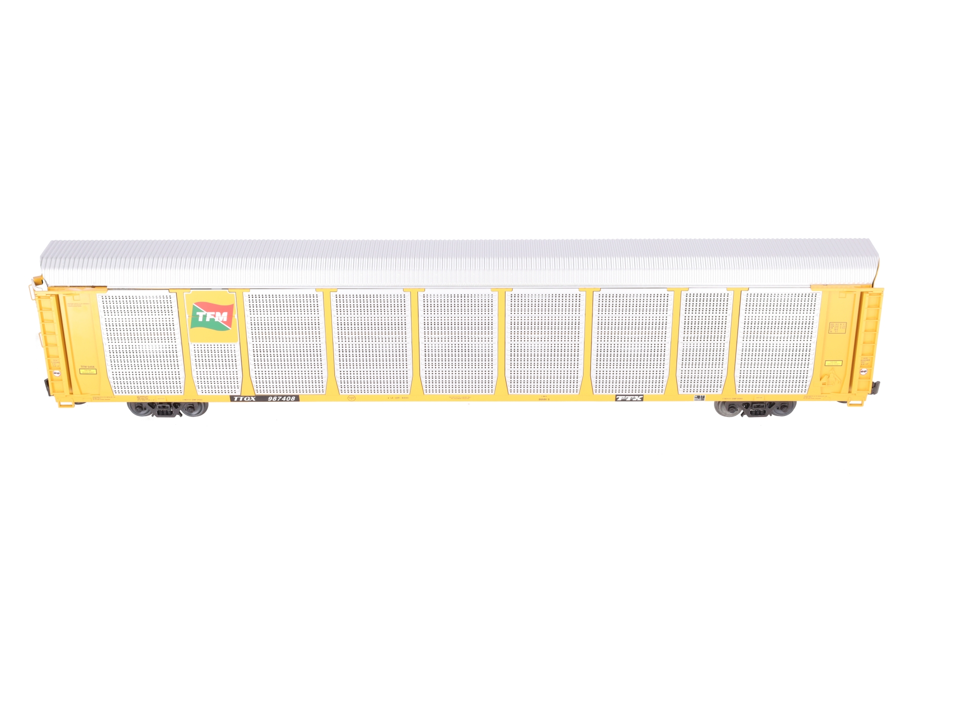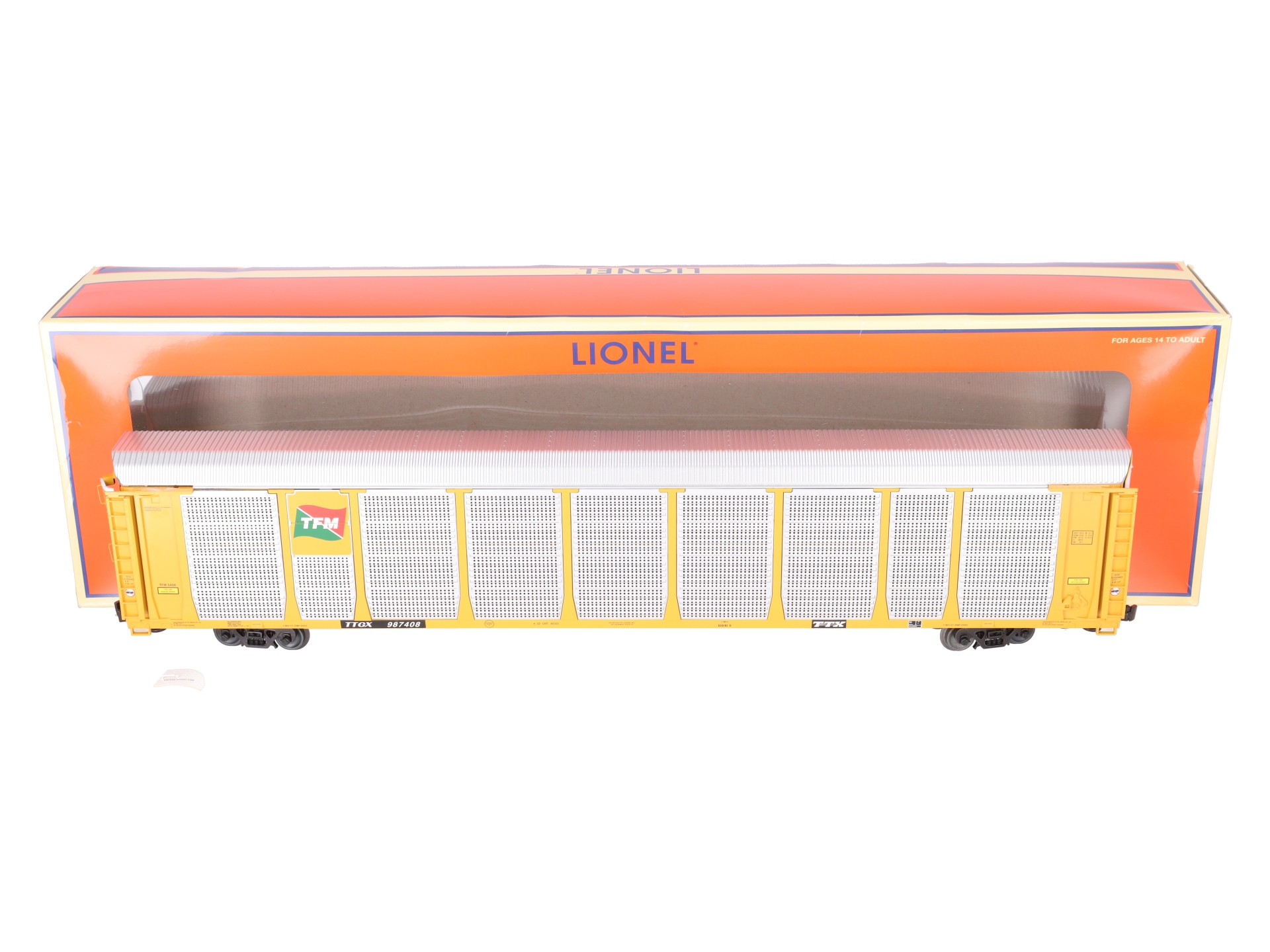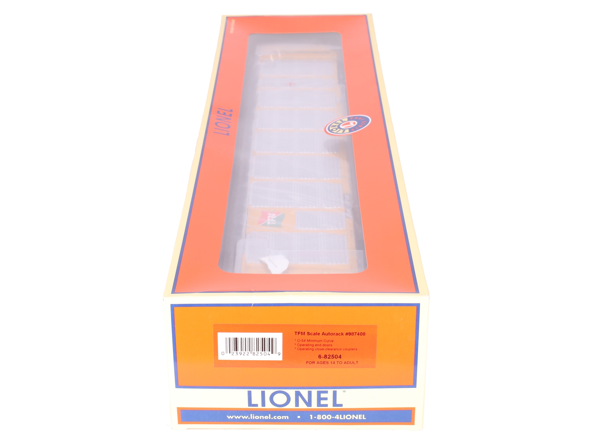 This is a Lionel 6-82504 O Gauge Transportacion Ferroviaria Mexicano 89' Auto Carrier Rack #987408. Modern fully enclosed autoracks protect their valuable loads on their first trip after the assembly line. The cars from many railroad companies are regularly mixed together for colorful consists. Features includes accurate 1:48 scale design, die-cast metal sprung trucks and operating couplers, opening doors at both ends, Bi-level rack in interior, die-cast operating kinematic couplers for close coupling on straightaways and auto adjusting couplers for operation on curves.