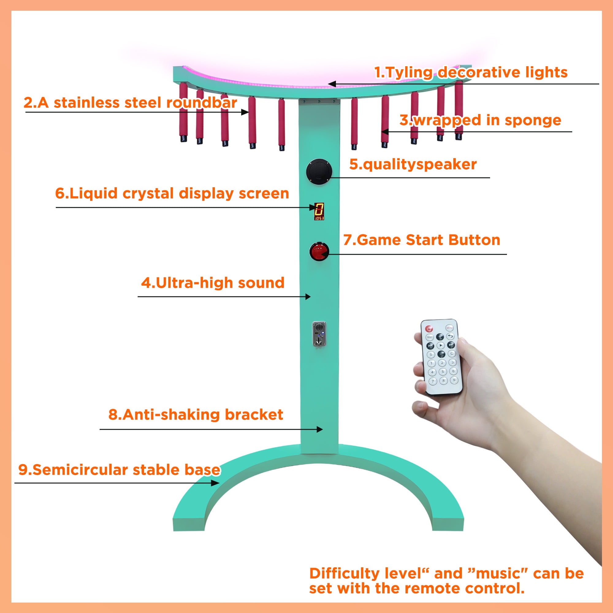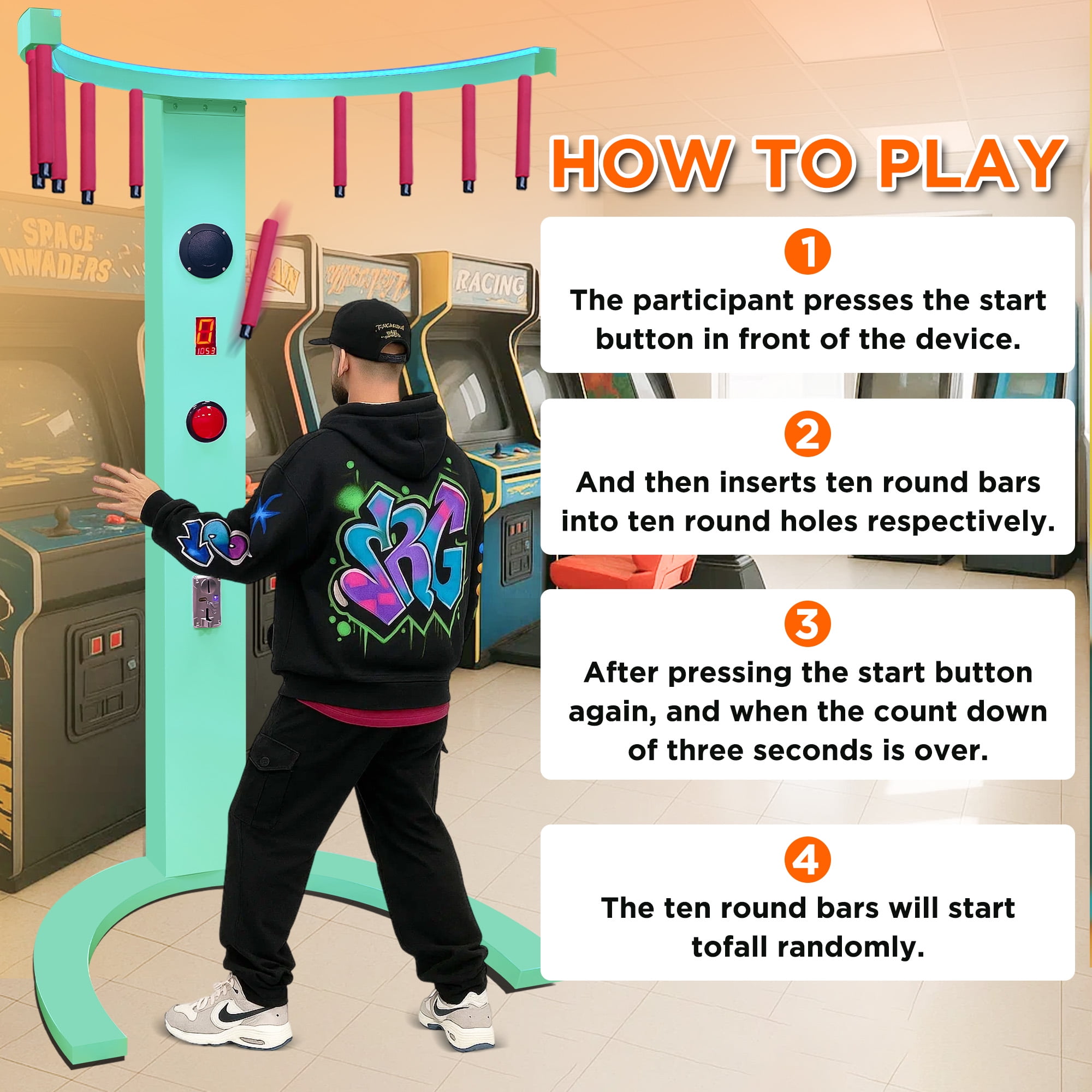 This Catch Stick Game is an arcade-style reaction training game. It works by powering an electromagnet that holds round sticks to the upper bar. When the game starts, the sticks randomly drop one by one. Your goal is to stay focused and catch them with your hands. The more sticks you catch, the higher your score! It’s a great way to train attention and reaction speed, making it ideal for both adults and children. The machine supports 110V–220V AC power and can also be powered by a 12V battery. You can use custom tokens or circulating coins. Note: The machine can only recognize one type of coin at a time. You need to place a coin in the coin acceptor as a reference. (For example, if you place a £1 coin, the machine will only recognize £1 coins. If you place a £2 coin, it will only recognize £2 coins.) Your Catch Stick Game is suitable for a variety of commercial and entertainment settings, especially rental businesses and arcade operators. It can be used in: Arcade & Game Centers As a coin-operated game machine to attract players, increase engagement, and boost foot traffic. Amusement Parks & Malls Ideal for kids and family zones, enhancing interaction and encouraging repeat visits. Party & Event Rentals Perfect for birthday parties, corporate events, weddings, and carnivals, offering fun interactive entertainment. Bars & Clubs Acts as a social game to enhance customer interaction and increase time spent at the venue. Trade Shows & Promotional Events Serves as an interactive attraction to draw visitors and increase brand exposure and engagement. Gyms & Training Centers Can be used as a reaction training tool to improve hand-eye coordination and concentration.