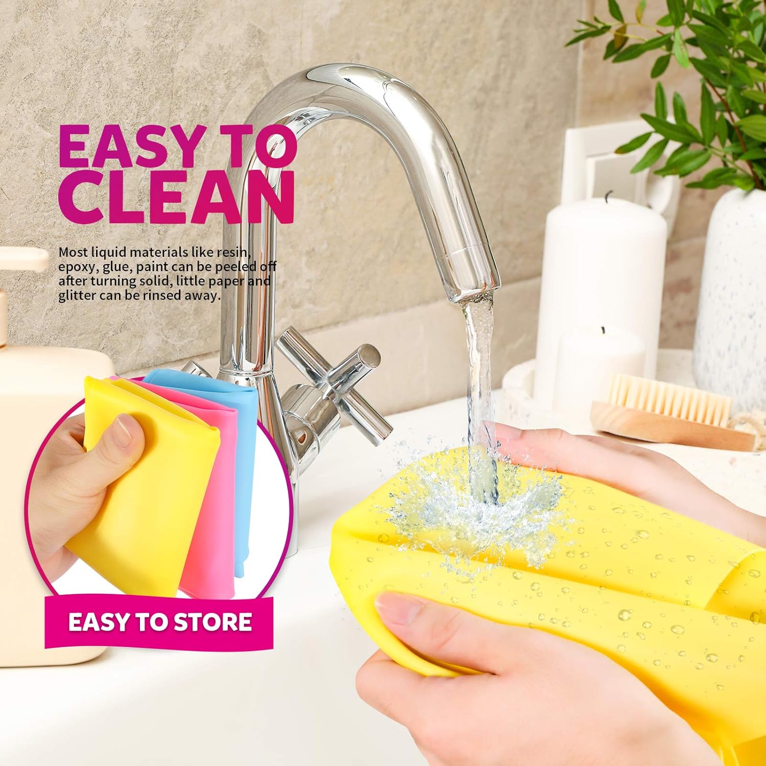 Easy to Clean & Store: Easy to clean with warm soap water,and the glue and resin can be easily peeled off after turning solid,the glitter can be rinsed off straightly. Soft,flexible,lightweight,easy to fold and roll up,save space,good for stora,also convenient to carry on..