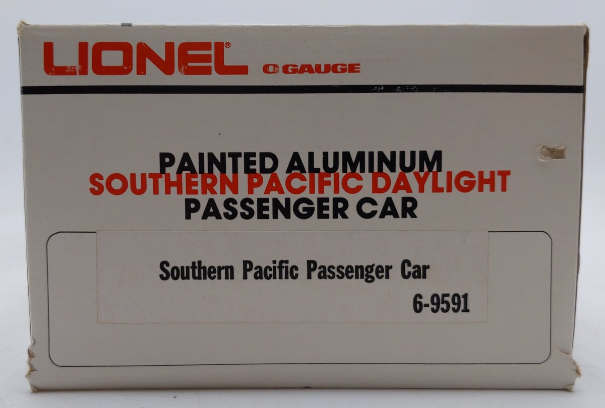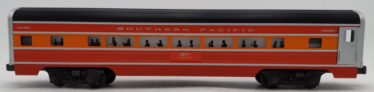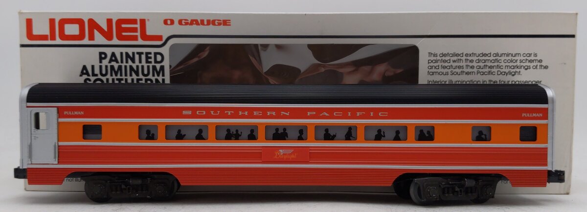 Here is a Lionel 6-9591 O Gauge Southern Pacific Daylight Aluminum Passenger Car. This car is part of the Southern Pacific Daylight set from the 1980's. It features die-cast trucks with operating couplers and an illuminated interior with passenger silhouetted windows and measures 15 inches long.