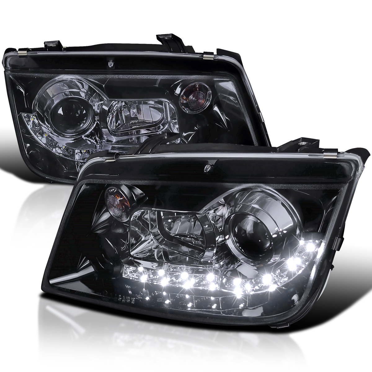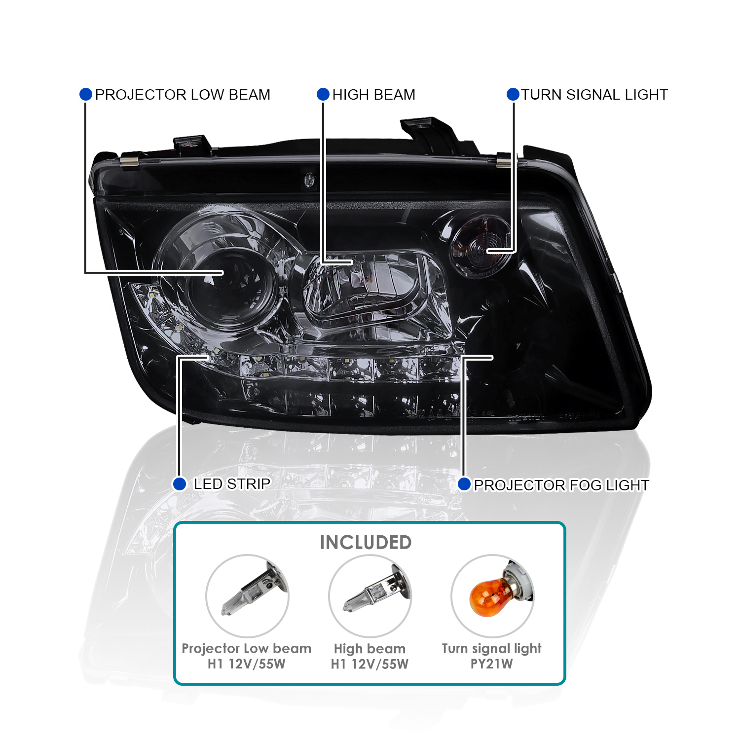 Brand new in original packaging. Exactly the same as shown in the picture! Comes with both headlights. H1 light bulbs for HIGH/LOW beam & H3 fog light bulbs included. High quality glossy black housing smoke lens projector headlights with Audi style LED lights & fog lights. These lights are made by an OE approved and ISO certified manufacturer with the quality meet or exceed all OE standards. Do not come with installation instructions. Professional installation highly recommended. Fitment : 99-04 VW Jetta MK4